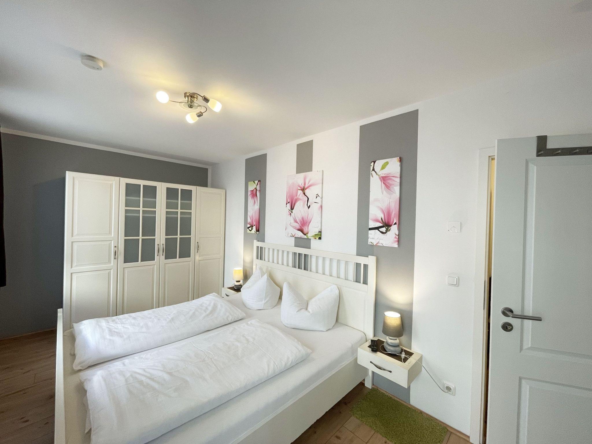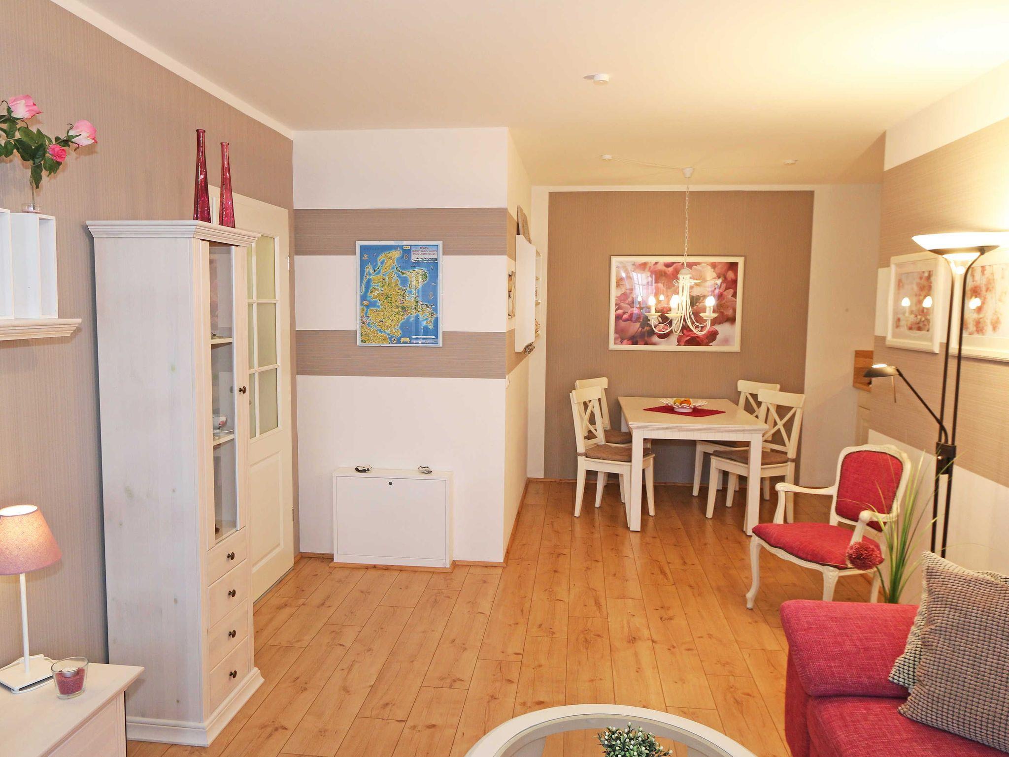 Die Nichtraucherwohnung umfasst ca. 49 m² und befindet sich in der ersten Etage des Hauses. Diese können Sie bequem mit dem Aufzug erreichen. Der geräumige Wohnbereich verfügt über ein Ecksofa (1,60 m x 2,00 m), welches als Aufbettungsmöglichkeit für zwei Personen genutzt werden kann, einen Couchtisch sowie einer Anrichte und Vitrine. Abgerundet wird der Wohnbereich durch einen LED-TV, einer Mini-Stereo-Anlage mit CD- und Blue-Ray-Player, sowie einer Spielesammlung und DVD's. Auch auf einen Internetanschluss (WLAN) brauchen Sie nicht verzichten. Dieser ist für Sie inklusive. Ein Plätzchen mit einem bequemen Sessel und einer Leselampe finden Sie zusätzlich mit einer kleinen Auswahl an Büchern für Groß und Klein. Angrenzend befindet sich die kleine Küchenzeile mit einen 2 Zonenceranfeld, einen Kühlschrank mit Gefrierfach, einen Geschirrspüler, eine Mikrowelle, eine Kaffeemaschine, einen Wasserkocher, einen Toaster sowie diverse Küchenutensilien. Gemütlich und bequem können Sie Ihre Mahlzeiten am Esstisch genießen. Vom Wohn- und Schlafbereich können Sie den bestuhlten Balkon (Ost) erreichen. Das Schlafzimmer, welches auch mit einem LED-TV ausgestattet ist, verfügt über ein Doppelbett (1,80 m x 2,00 m), verstellbaren Lattenroste, 2 Nachttischablagen und ein Kleiderschrank. Im Bad finden Sie neben einer ebenerdigen Glasdusche auch ein WC, einen Waschplatz, Handtuchheizkörper und einen Fön. Alle Räumlichkeiten verfügen über Fußbodenheizung, die für angenehme Wärme sorgt. Für einen glatt ablaufenden Urlaubstag stehen Ihnen ein Bügelbrett und ein Bügeleisen zur Verfügung. 2 kleine Haustiere sind mit Ihrem eigenen Schlafplatz gegen eine Gebühr gern gesehene Gäste. Empfehlenswert ist der stilvoll ausgebaute Wellnessbereich, der von allen Hausgästen gegen eine Gebühr genutzt werden kann. Die Wertmarken können Sie auf Nachfrage während Ihres Urlaubes erwerben. Hier im Erdgeschoß finden Sie in der Sauna, im Dampfbad und im Ruheraum vor allem in den kalten Jahreszeiten, Entspannung und pure Ruhe. Von Ihrem Tiefgaragenstellplatz (Nr.04, Einfahrtshöhe 2,00 m) Doppelparker Höhe 1,80 m und Länge 5,00, können Sie bequem durch den Aufzug Ihre Wohnung erreichen. Ein abschließbarer Fahrradraum steht Ihnen in der Tiefgarage zur Verfügung. Die Erstausstattung eines Wäschepaketes (komplette Bettwäsche, 1 Duschhandtuch, 1 kleines Handtuch) können Sie bis 14 Tage vor Anreise gegen einen Aufpreis dazu buchen oder durch eigene ergänzen. Ab 2 gebuchten Paketen erhalten Sie einmalig 1 Geschirrhandtuch und 1 Duschvorleger hinzu.