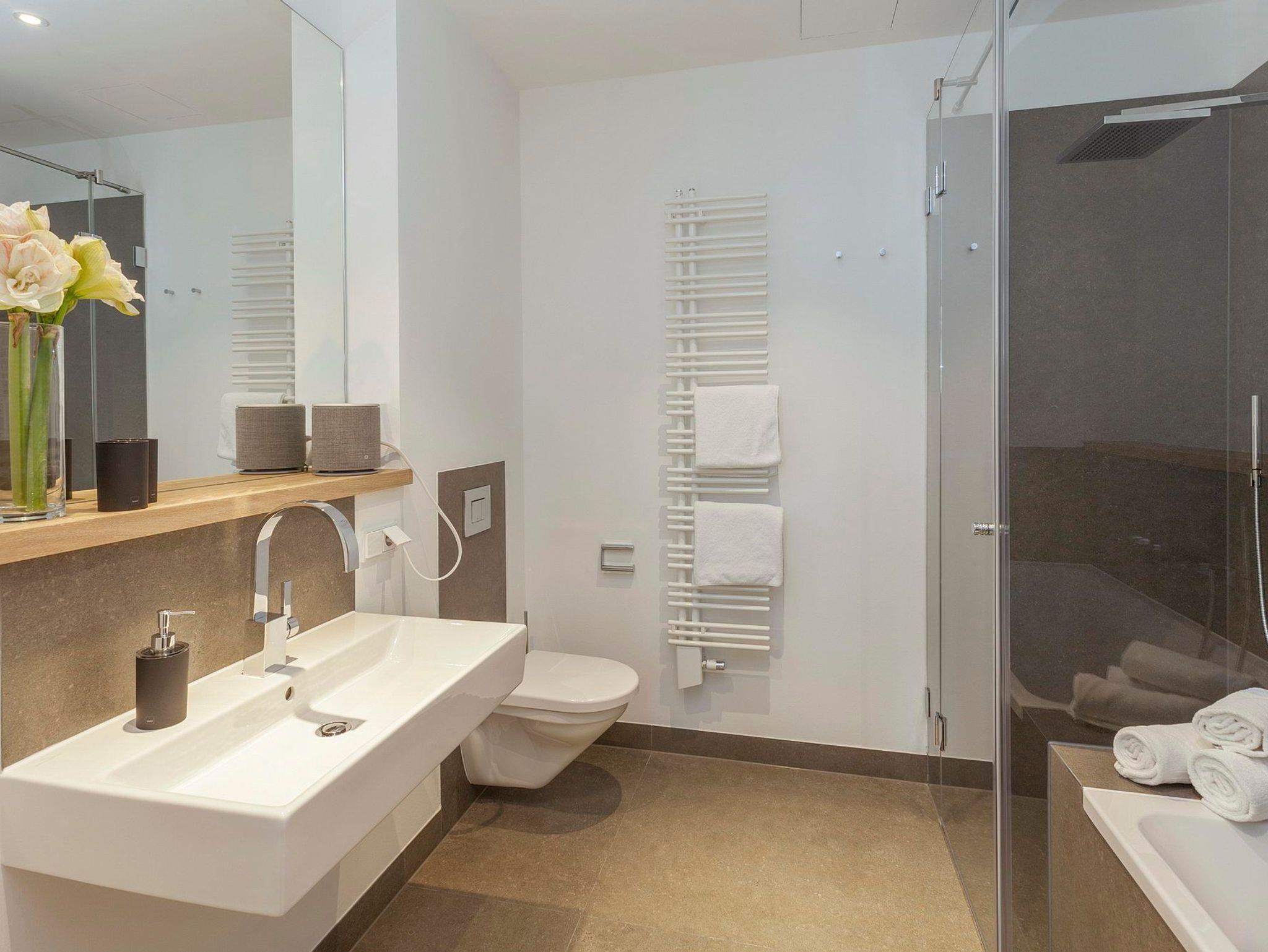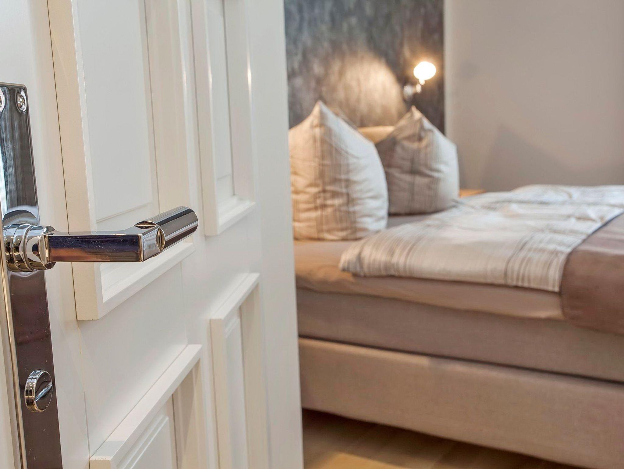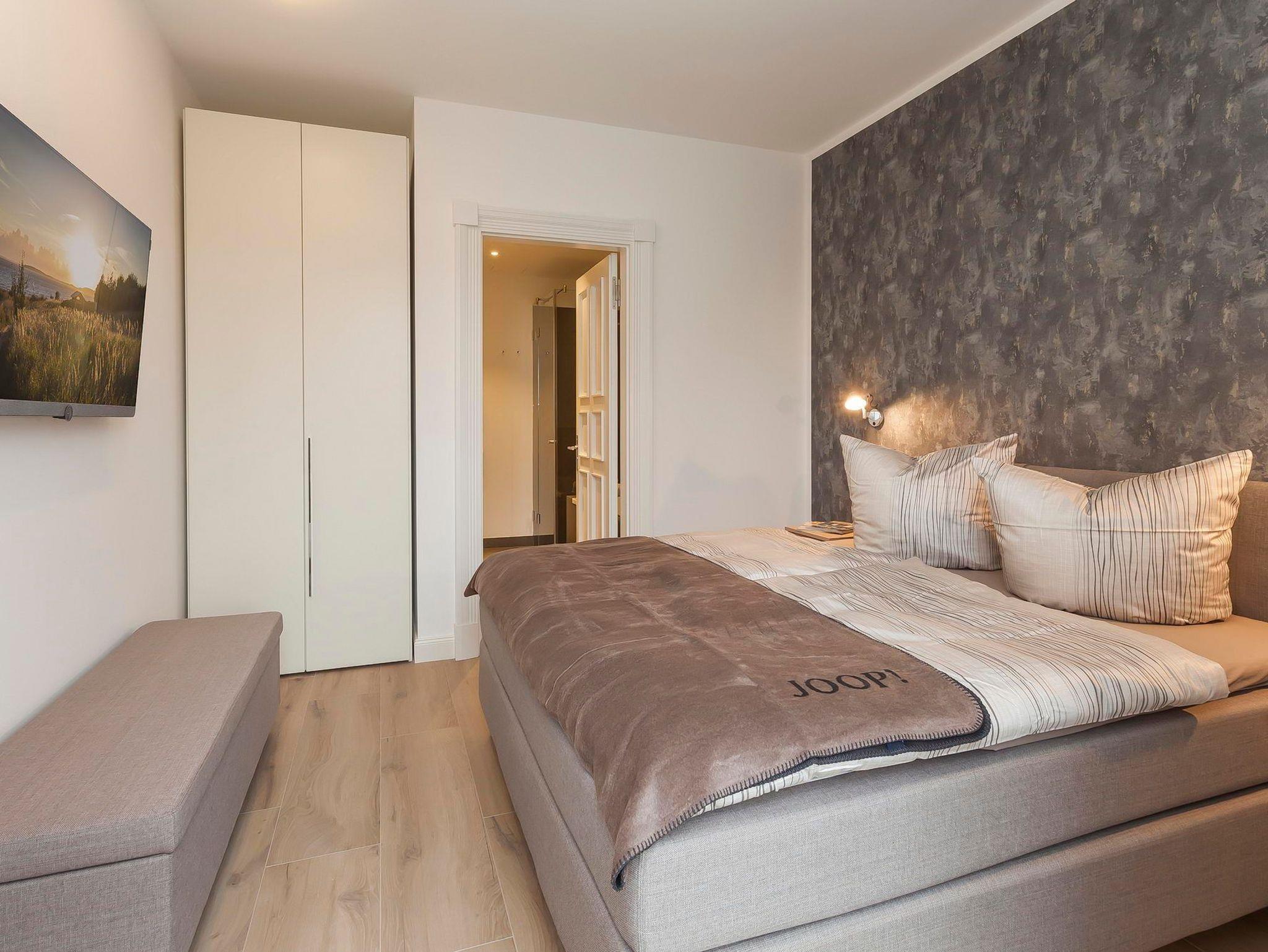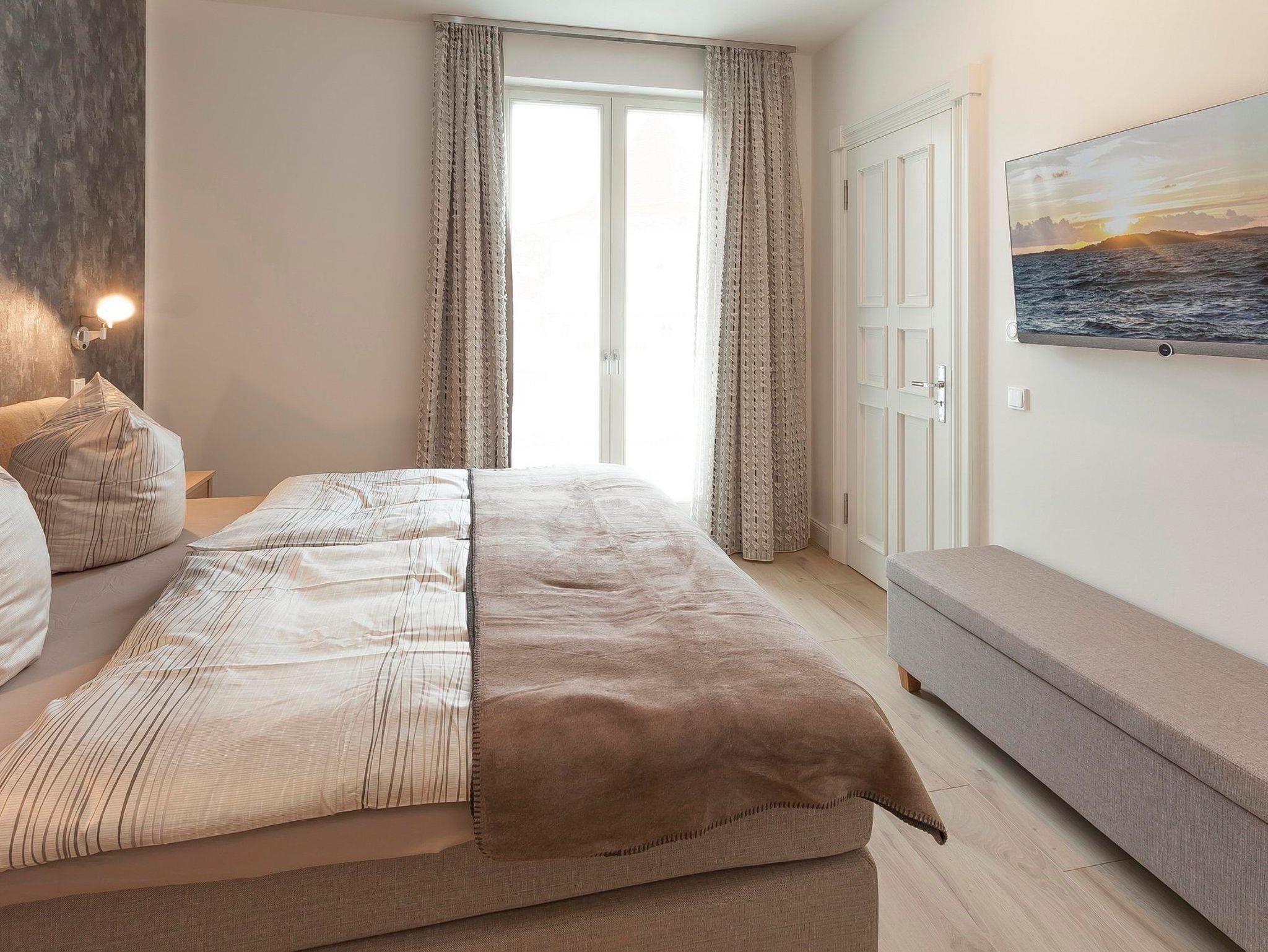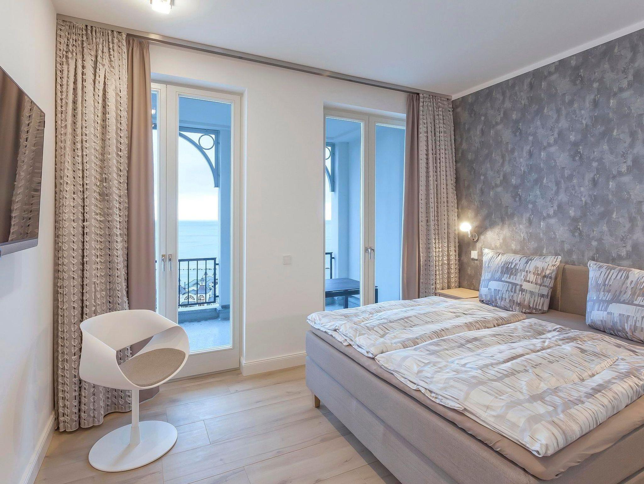 Zwei Schlafzimmer mit standesgemäßen Jensen-Boxspringbetten in 180x200cm, großem Kleiderschrank und 48 Zoll LOEWE-Fernsehern bieten Ihnen den notwendigen Rückzugsraum. Von einem der Schlafzimmer gelangen Sie auf die seeseitige Loggia, das andere Schlafzimmer hat einen Balkon mit Blick auf die Wilhelmstraße. Selbstverständlich lassen auch die beiden elegant gefliesten Badezimmer mit bodentiefer Dusche bzw. Badewanne, großzügigen Waschtischen, Kosmetikspiegel und Handtuchwärmer keine Wünsche offen.