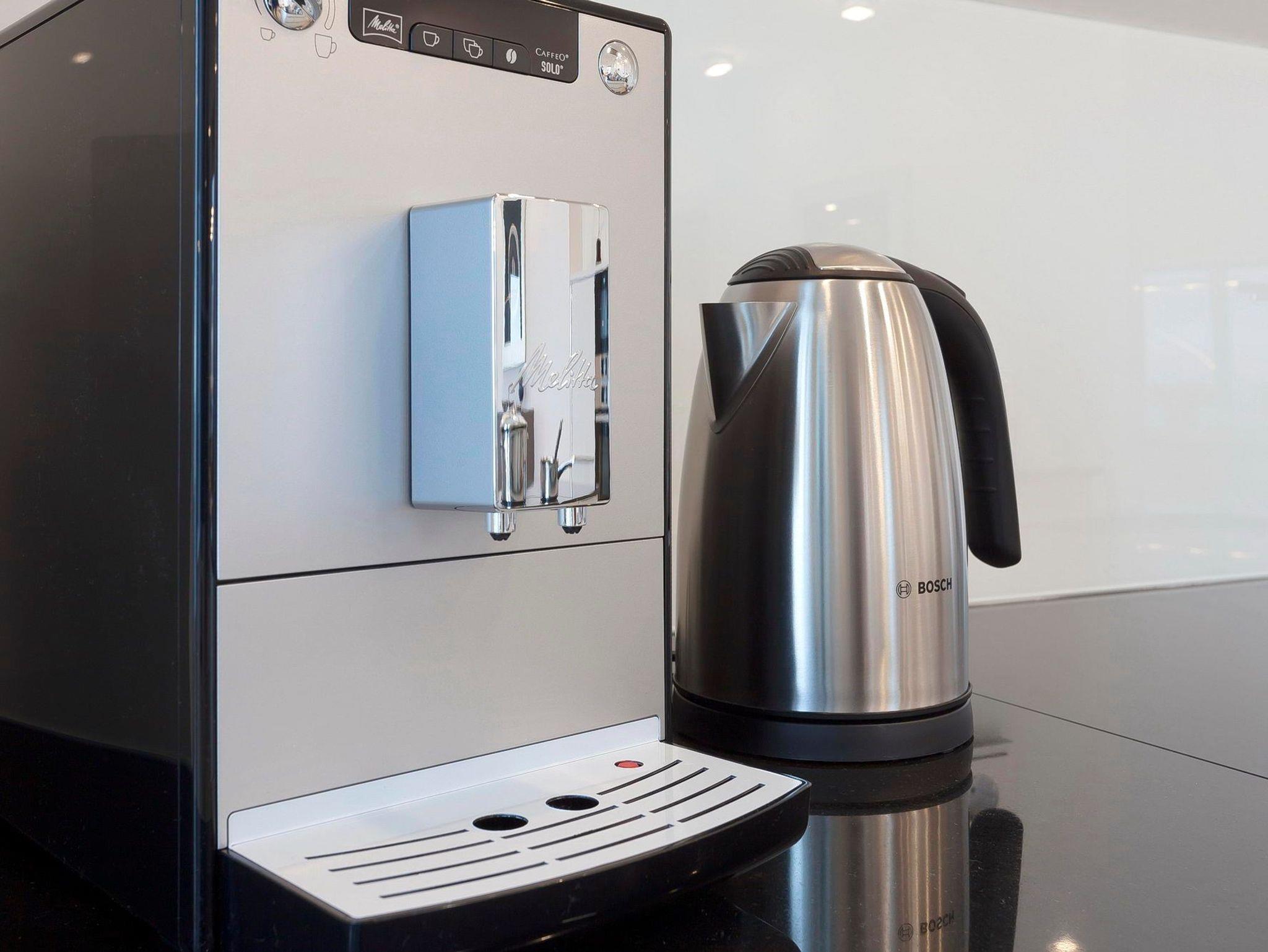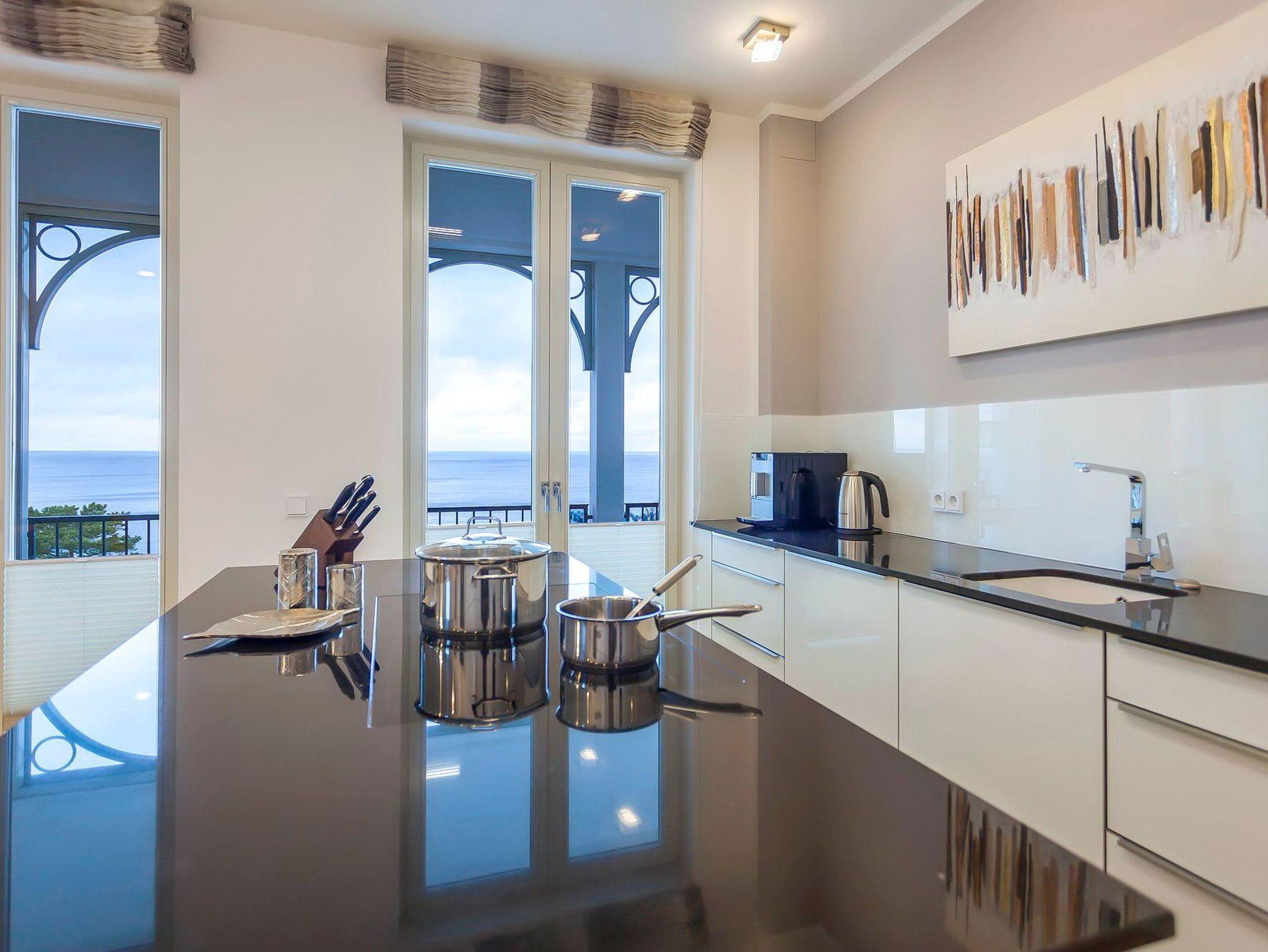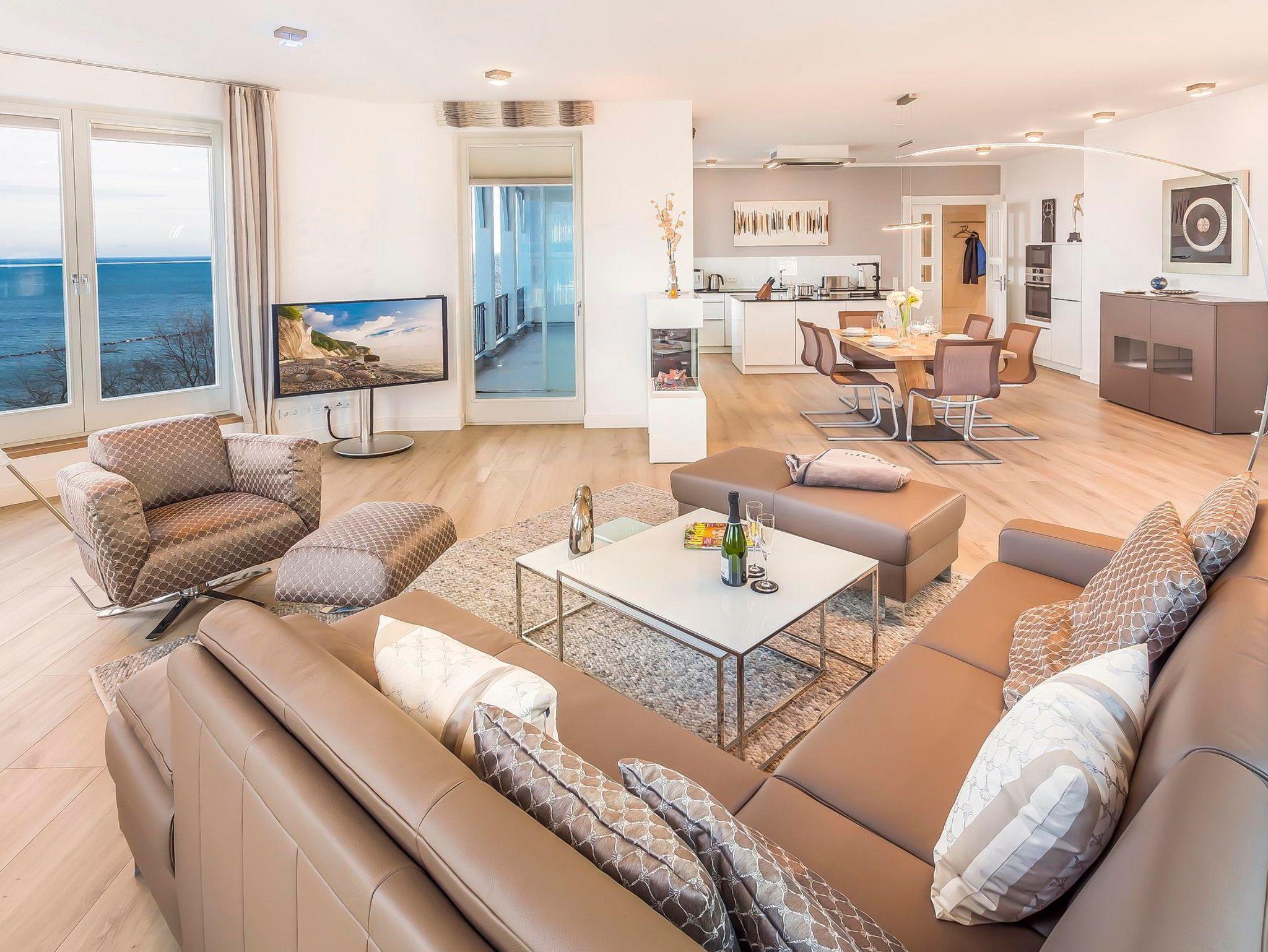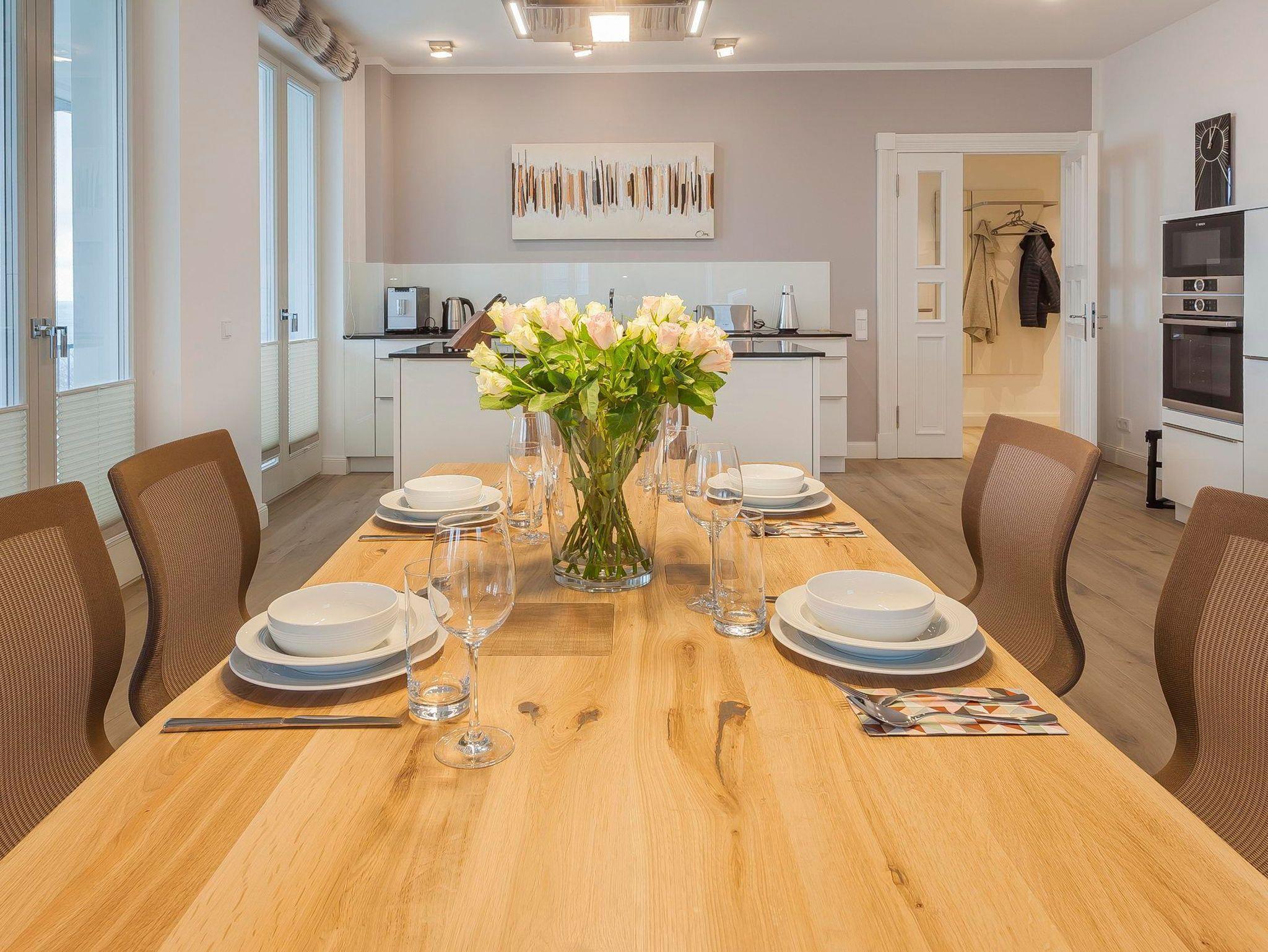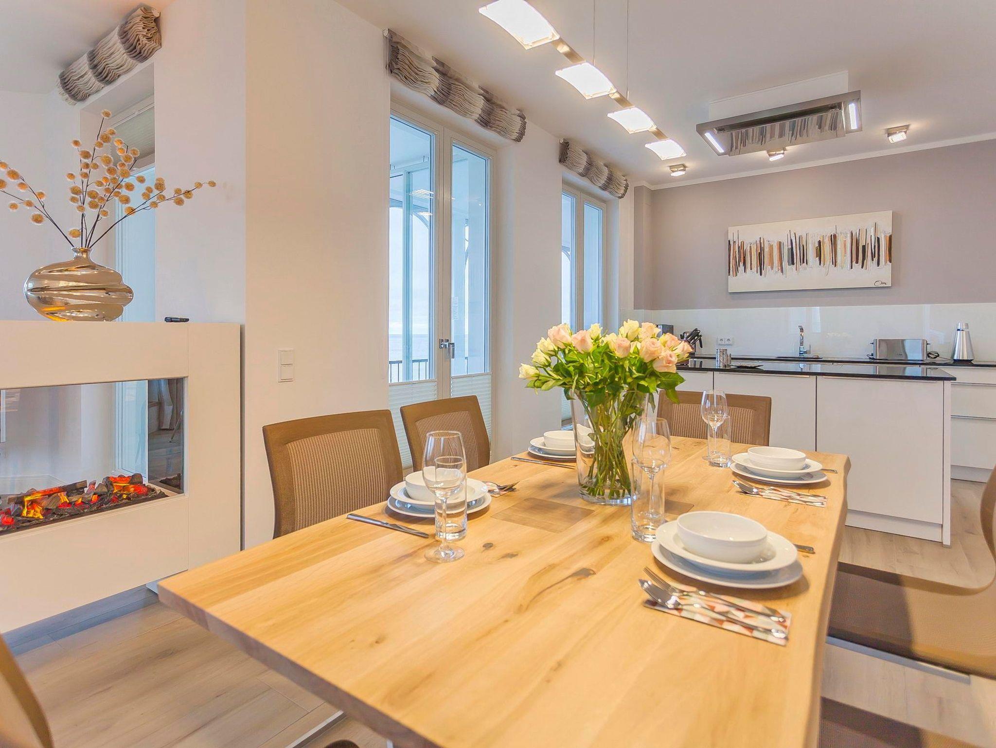 Absoluter Mittelpunkt Ihrer exklusiven Ferienwohnung ist der Wohn- und Essbereich mit seinen großen Fensterfronten, der Meerblick-Loggia inkl. Wintergarten, dem Elektrokamin mit täuschend echt aussehendem Flammenbild und einer Ausstattung, die wohl nichts zu wünschen übrig lässt. Bequeme Couchmöbel laden vor dem riesigen 55 Zoll Fernseher zum Relaxen ein, natürlich mit Funktionen wie Apple TV, Deezer und Netflix. Der elegante Küchenblock von LEICHT ist mit Markengeräten von Bosch, dem passenden Kochgeschirr und edlem Porzellan ausgestattet, so dass Sie sich nach Herzenslust selbst bekochen können, wenn Sie nicht gerade im hauseigenen Restaurant des FIRST oder in einem der netten Lokale in der Nachbarschaft speisen mögen.
