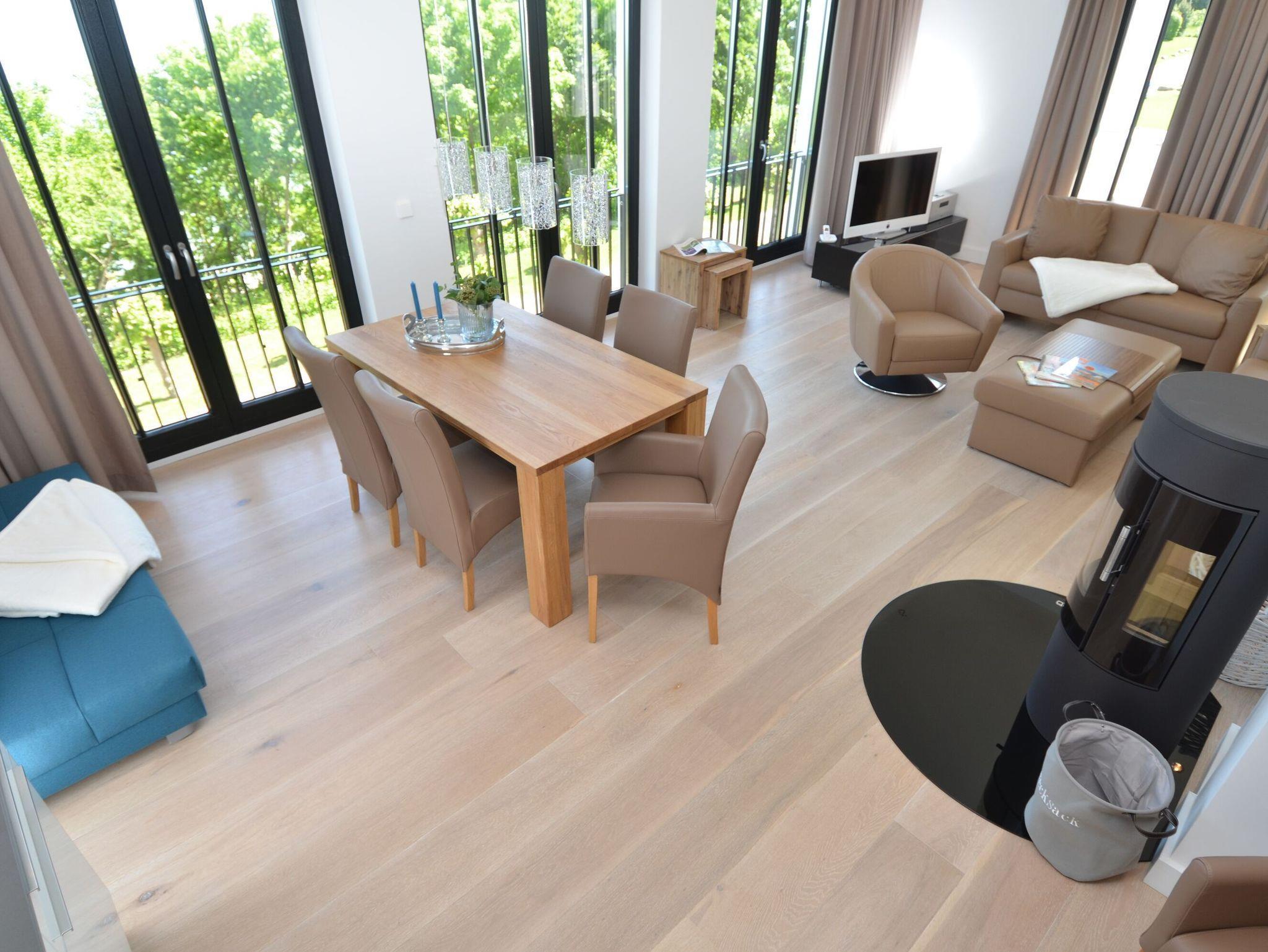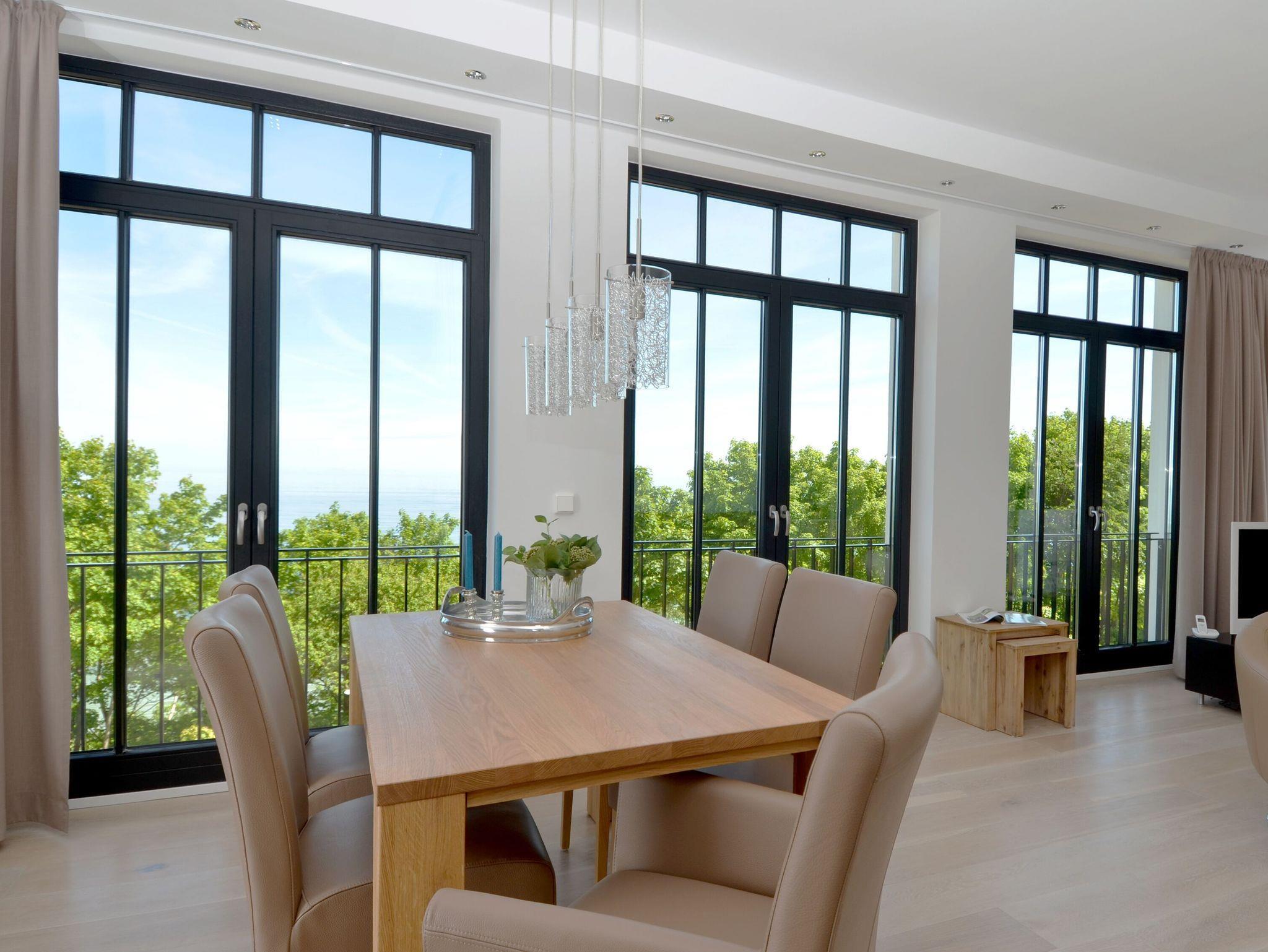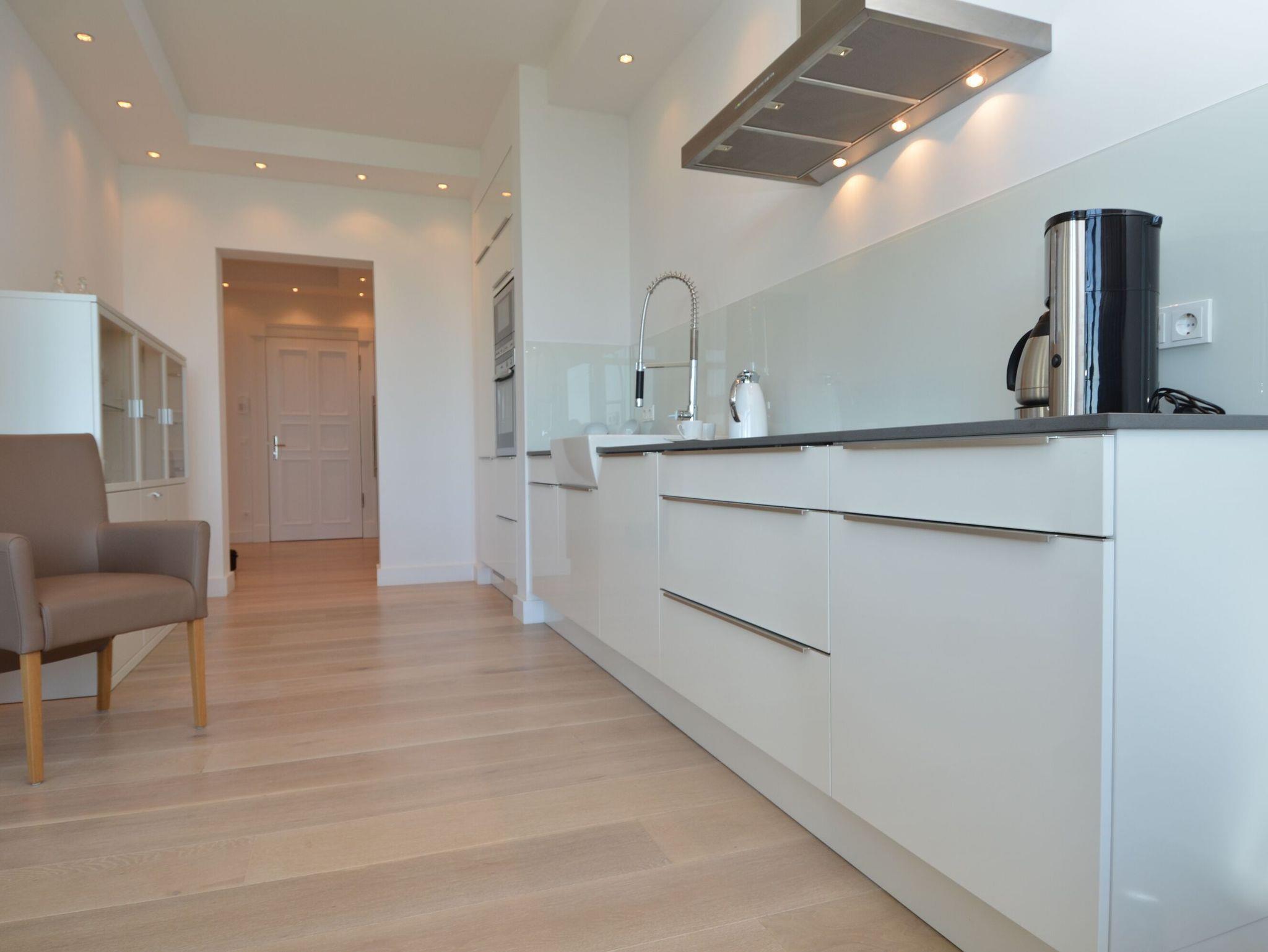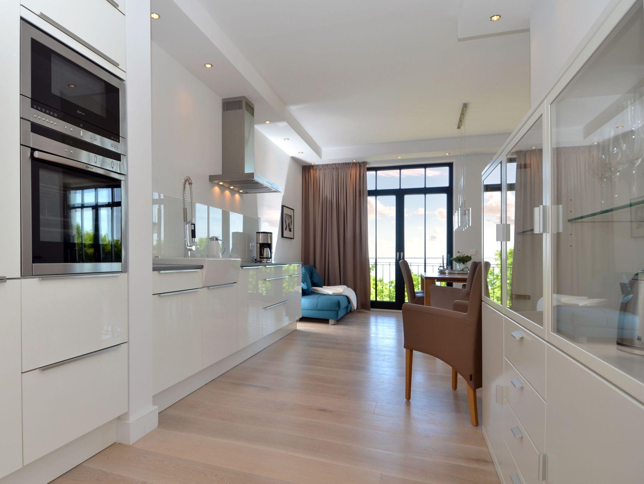 Auch im Wohn-/Essbereich sind wie in der gesamten Wohnung helle Eichendielen verlegt, die durch eine Fußbodenheizung noch gemütlicher wirken. Aufwändige Tischlerarbeiten in der ganzen Suite und Deckenhöhen von 2,88m unterstreichen den Villencharakter des Objektes. Eine hochkarätig ausgestattete Einbauküche macht Lust darauf, gerade im Urlaub zu entschleunigen und in einem tollen Ambiente etwas Schönes zu kochen. Wann kann man dies schon einmal mit direktem Meerblick?