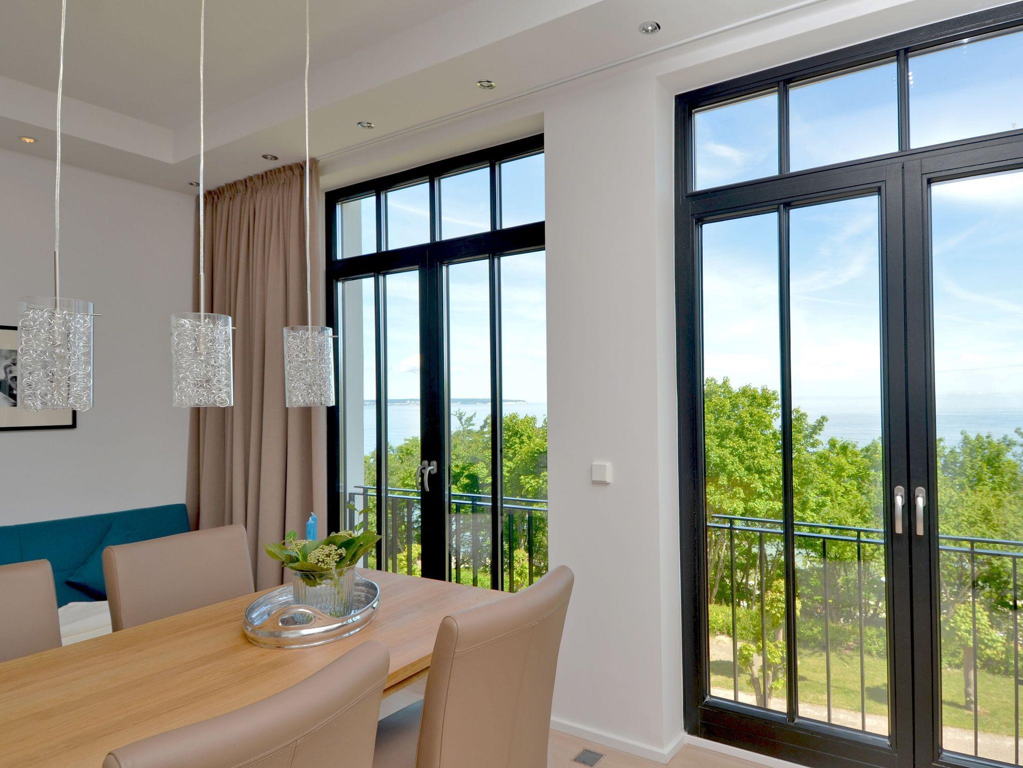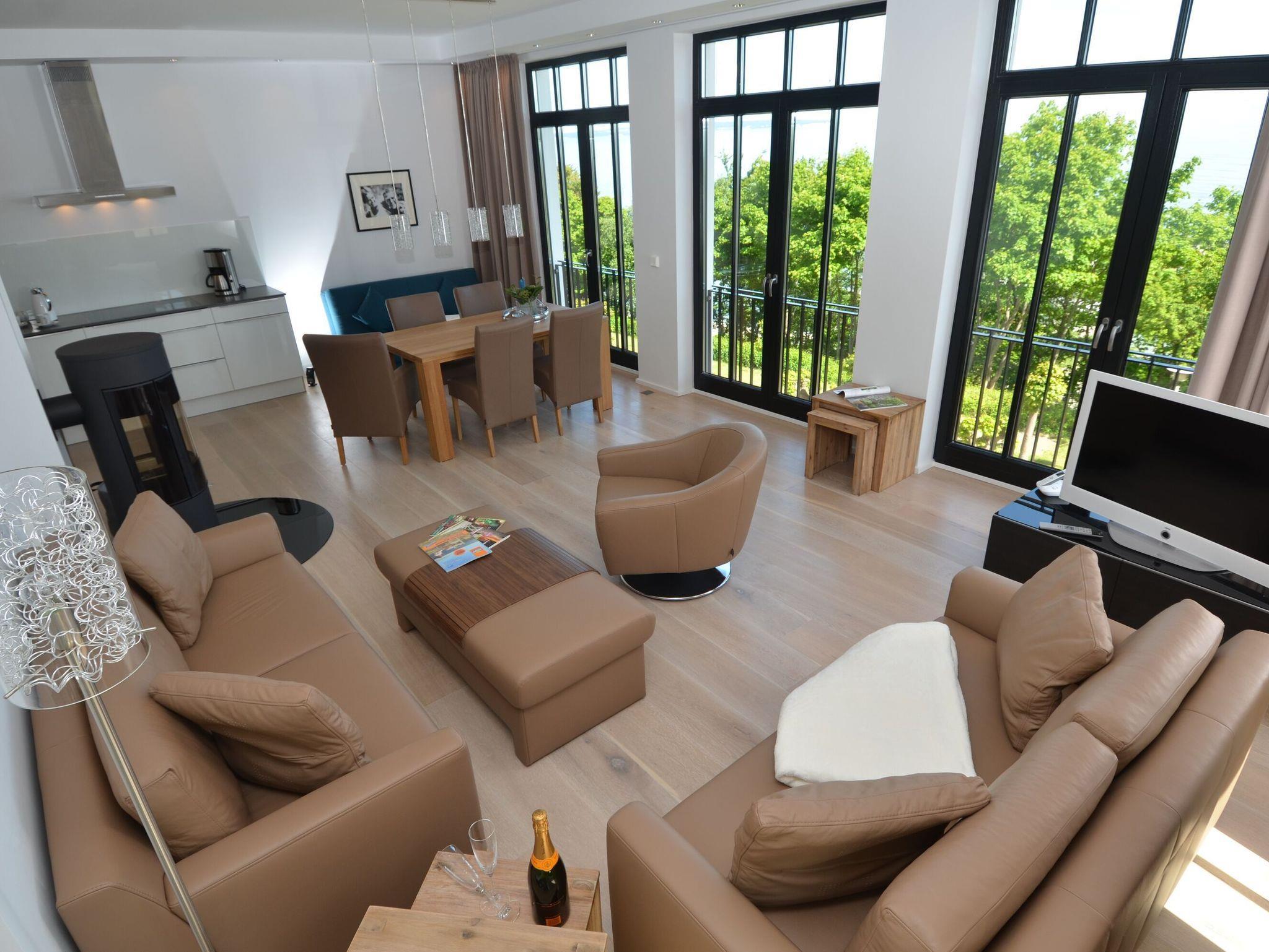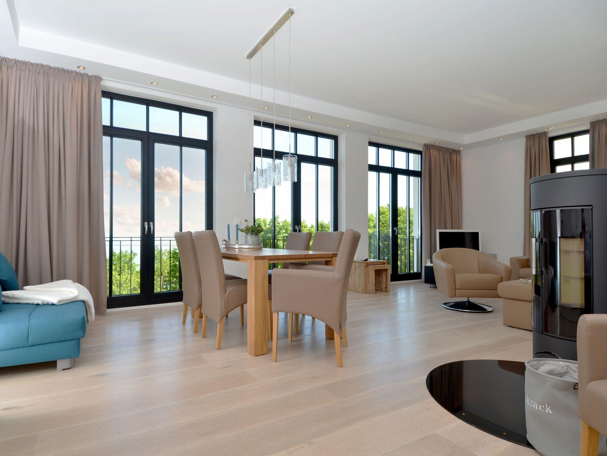 Der gesamte Wohn-/Essbereich wurde so ausgerichtet, dass man die Ostsee immer fest im Blick hat. Dies gilt für die bequemen Designer - Ledermöbel von E. Schillig genauso wie für den Essbereich und das separate Faltsofa in petrol, das ausziehbar ist und bei Bedarf Platz für 2 Personen bietet. Gerade auch in der etwas kälteren Jahreszeit sorgt ein Schweizer Luxuskaminofen mit Rundum-Glaseinsatz für Entspannung pur. Der Blick, die Wärme des Ofens und die beeindruckende Ausstattungsqualität der Suite sorgen auch abseits der Hochsaison für einen erholsamen Urlaub und wunderschöne Tage auf Rügen.