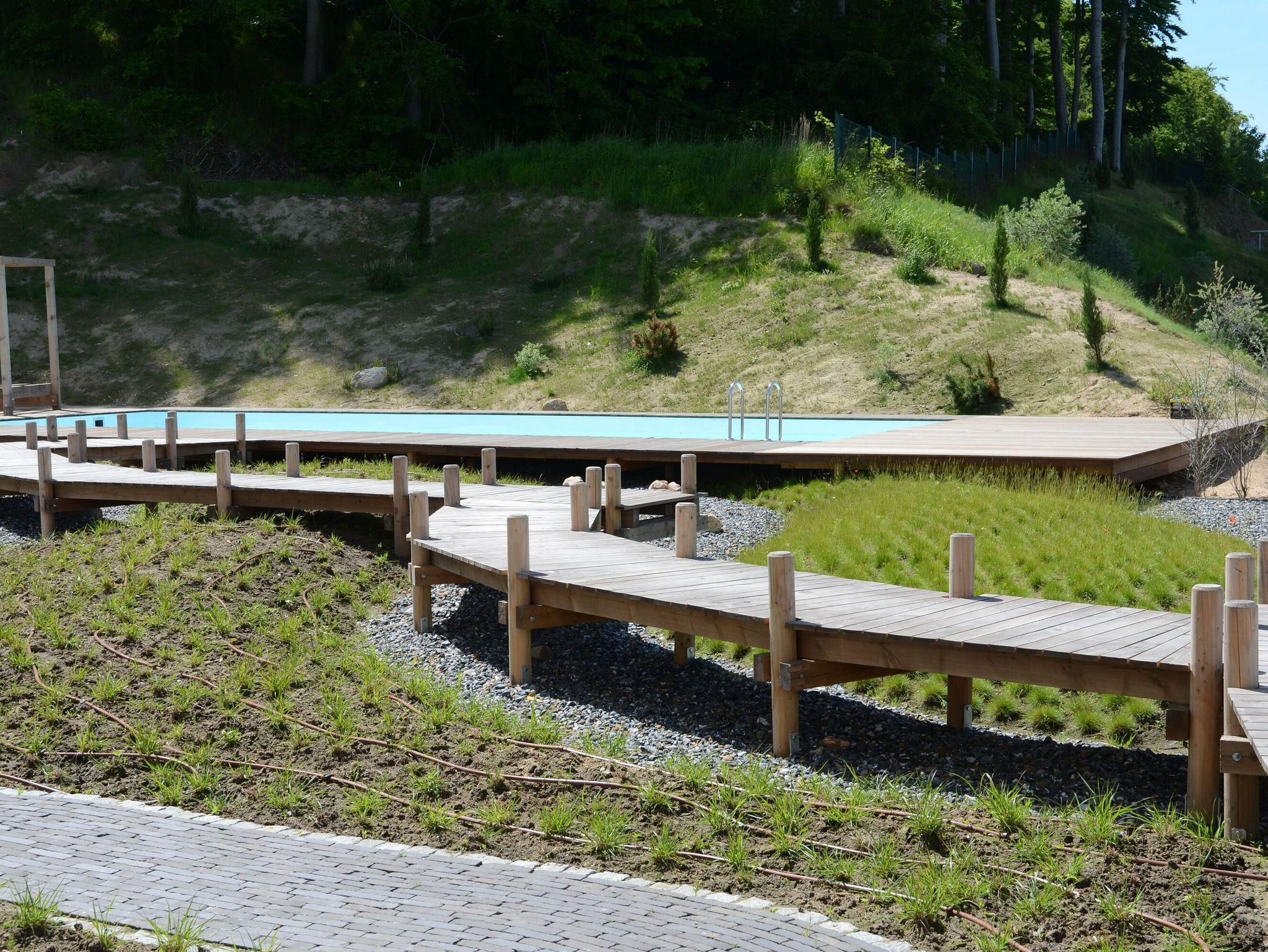 Allen Gästen der Villa Philine steht saisonal ein gemeinschaftlich genutzter Außenswimmingpool (15m x 5,5 m) mit Sonnenliegen zur Verfügung. Der Pool ist solarthermiebeheizt und befindet sich im reizvoll angelegten Dünenpark am Objekt.