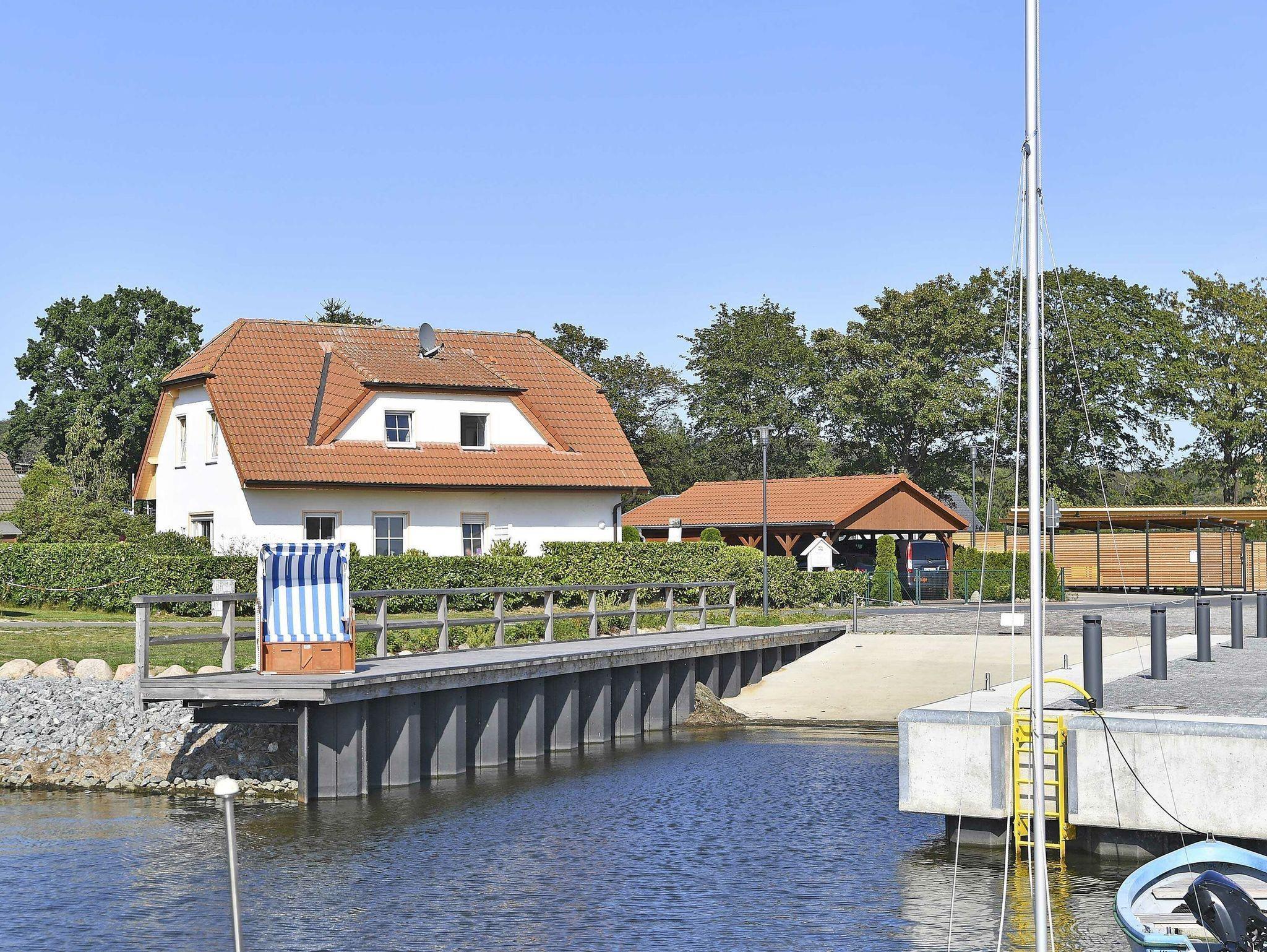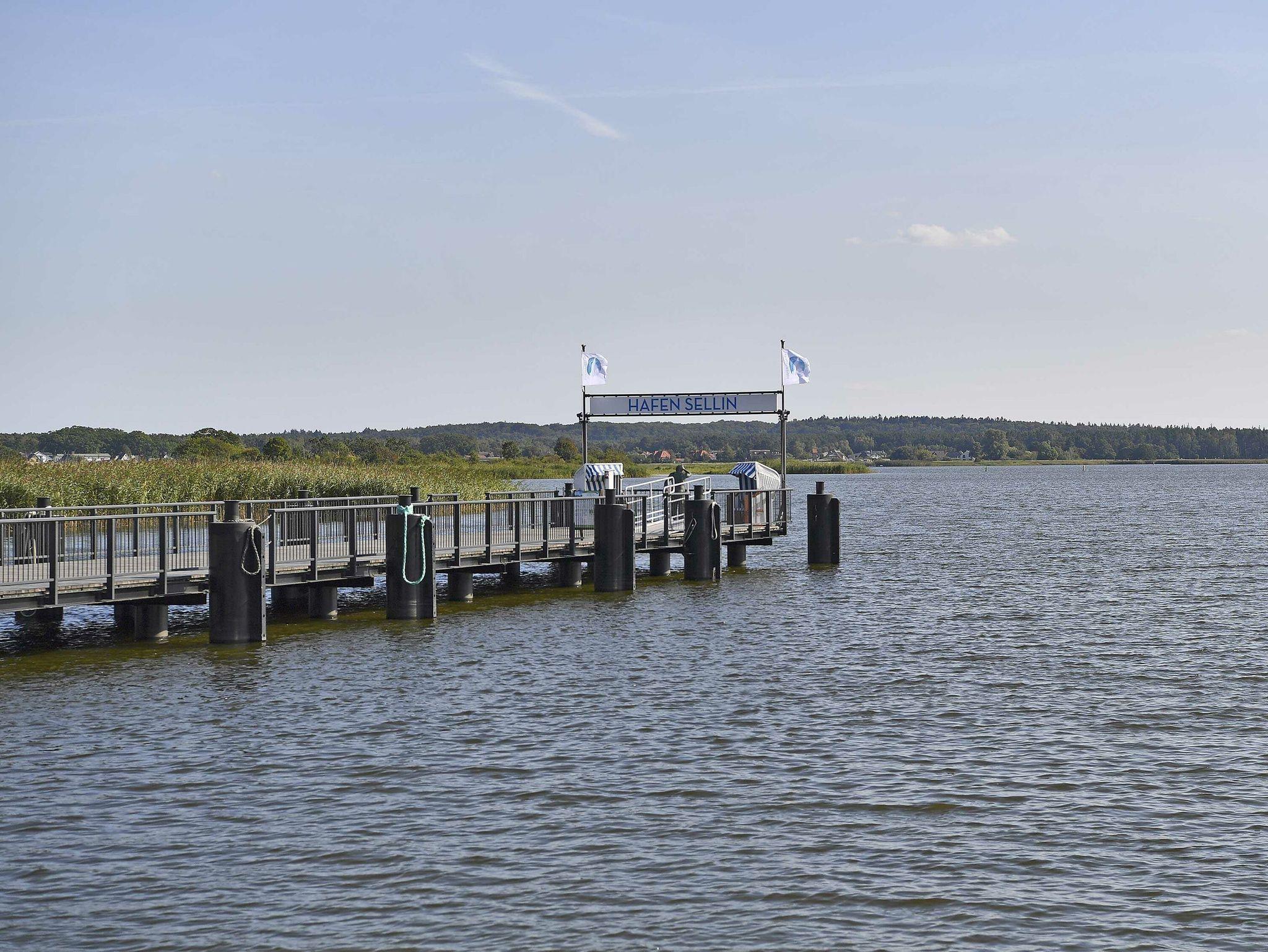 Zu dieser Wohnung gehört eine schöne Terrasse zur West-/Süd-Seite mit einem Grillkamin, einem Tisch mit Stühlen, einem Sonnenschirm und einem herrlichen Blick über den Selliner See.