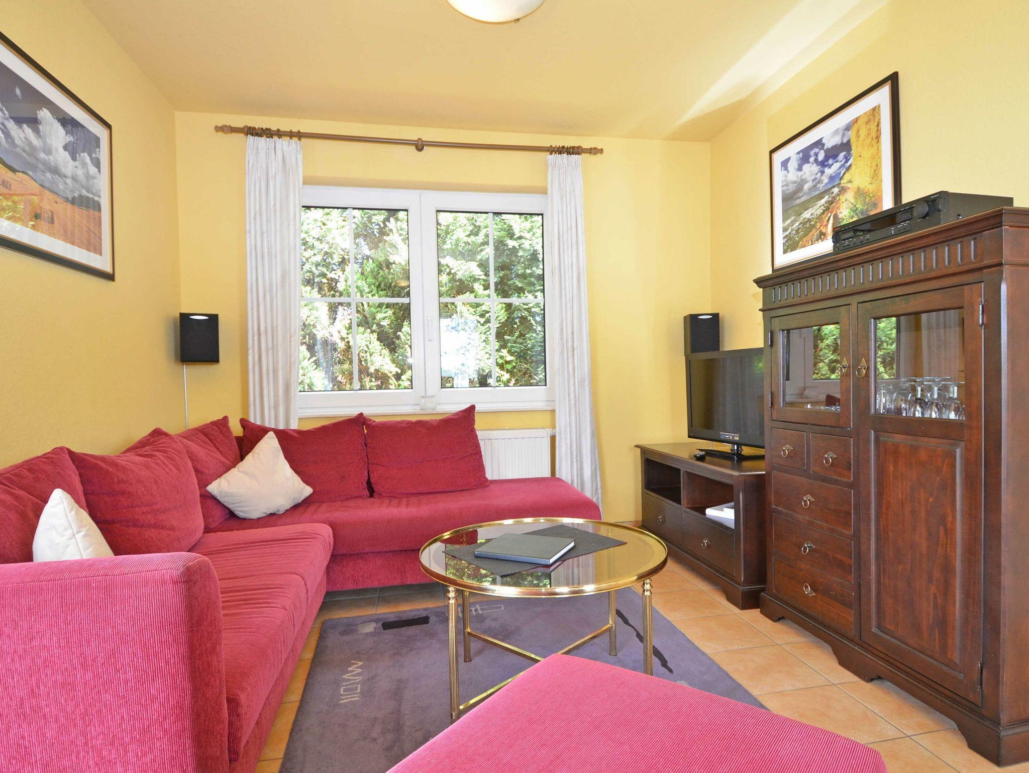 Das 3-Raum-Appartement befindet sich im Erdgeschoss und verfügt über geschmackvoll eingerichtete 70 m² Wohnfläche. Der elegante Wohnbereich ist mit einer gemütlichen Couch (als Aufbettung für 2 Personen nutzbar), TV, Stereoanlage mit CD-Player und einem Esstisch für 6 Personen eingerichtet.