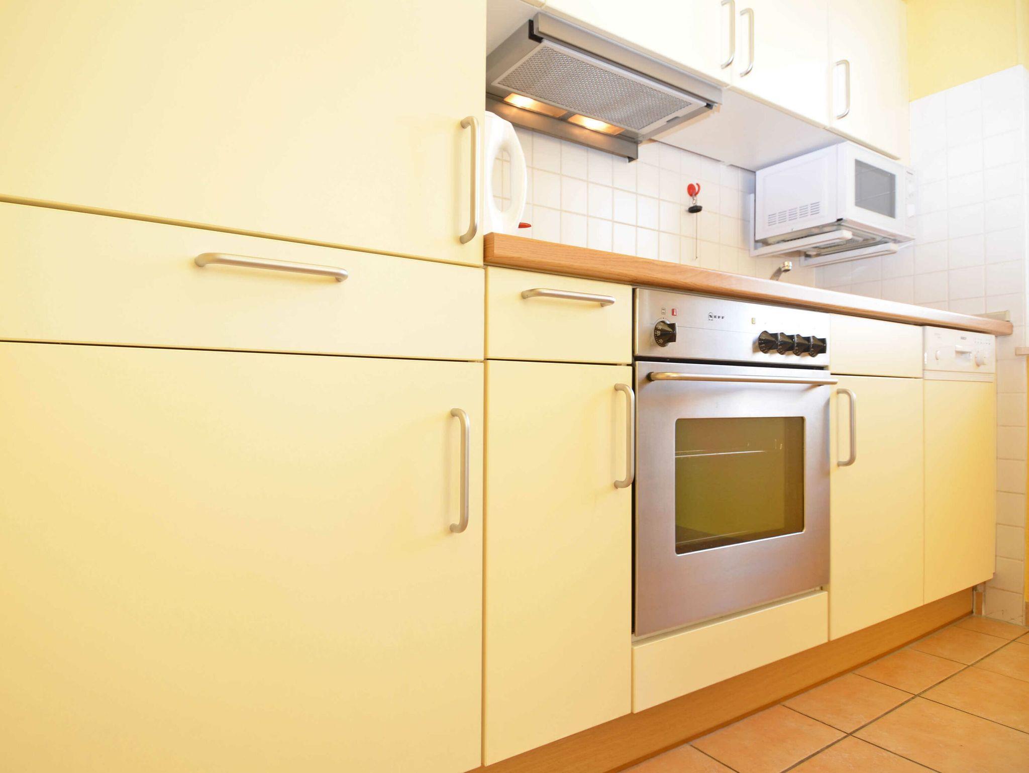 In der harmonisch im Wohnbereich integrierten Küchenzeile finden Sie einen Kühlschrank mit Gefrierfach, einen Backofen, eine Mikrowelle, ein 4-Platten-Cerankochfeld, eine Spülmaschine vor und diverses Kleininventar, das die Küchenausstattung komplettiert.