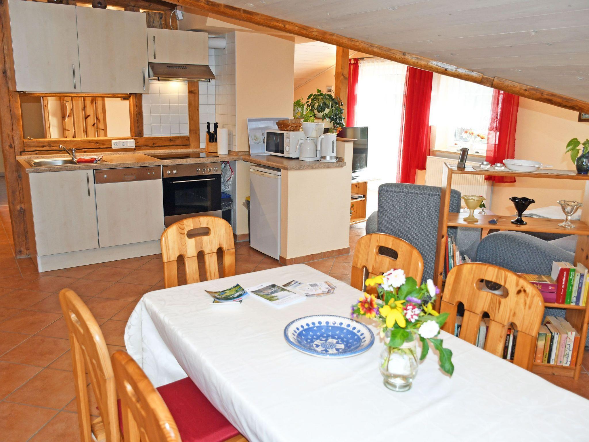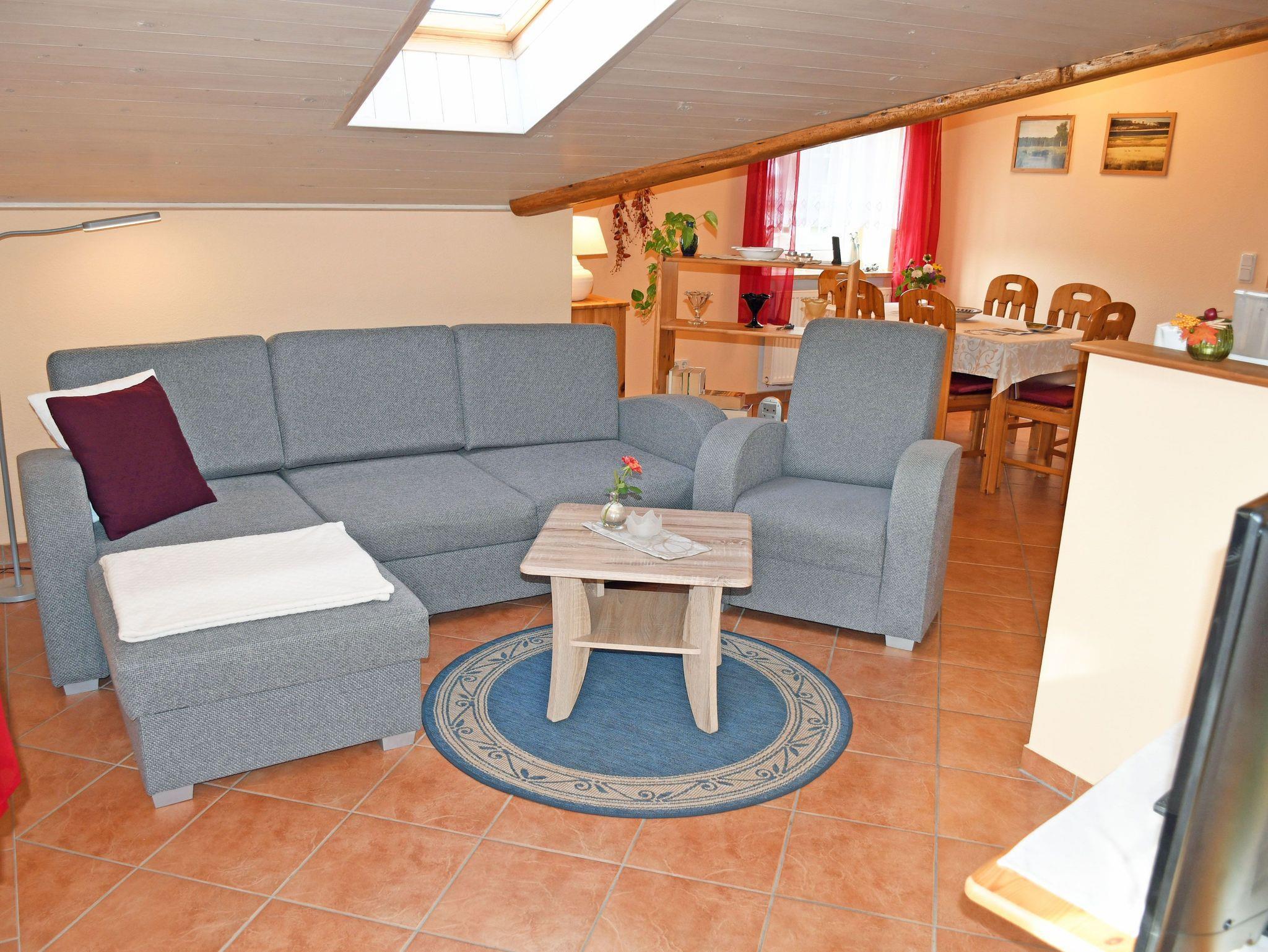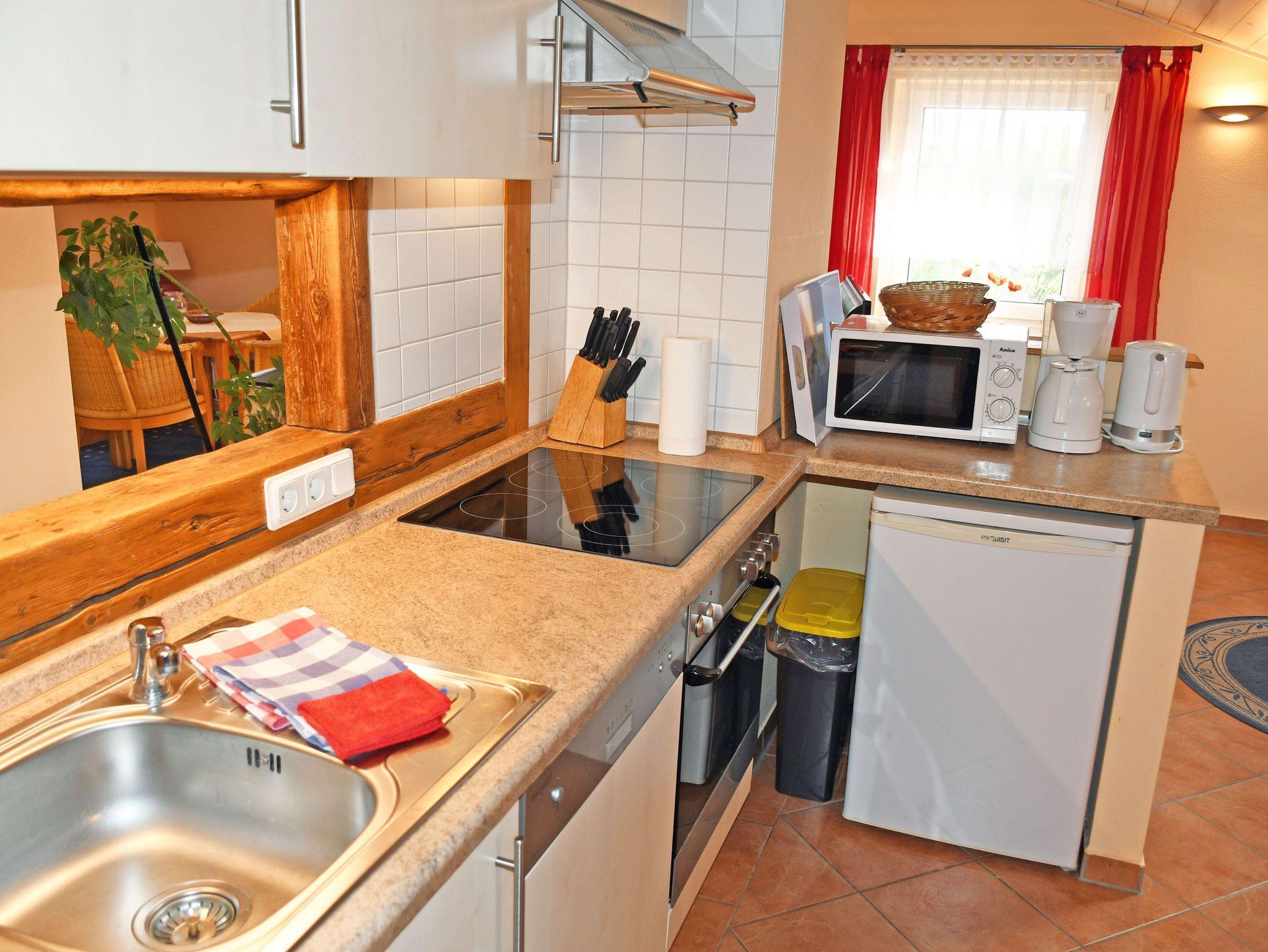 In dem stilvoll eingerichteten Wohnbereich stehen bequemen Sitzmöbeln und einem modernen TV-Flachbildschirm sowie Schränke. Hier steht auch ein Esstisch mit Stühlen. Daran an schließt sich die Küchenzeile mit Ceranherd, Backofen, Geschirrspüler, Mikrowelle, Abzugshaube, Wasserkocher, Toaster und Kaffeemaschine an. Für behagliche Wärme in der kälteren Jahreszeit sorgt ein Kamin im Wohnbereich.