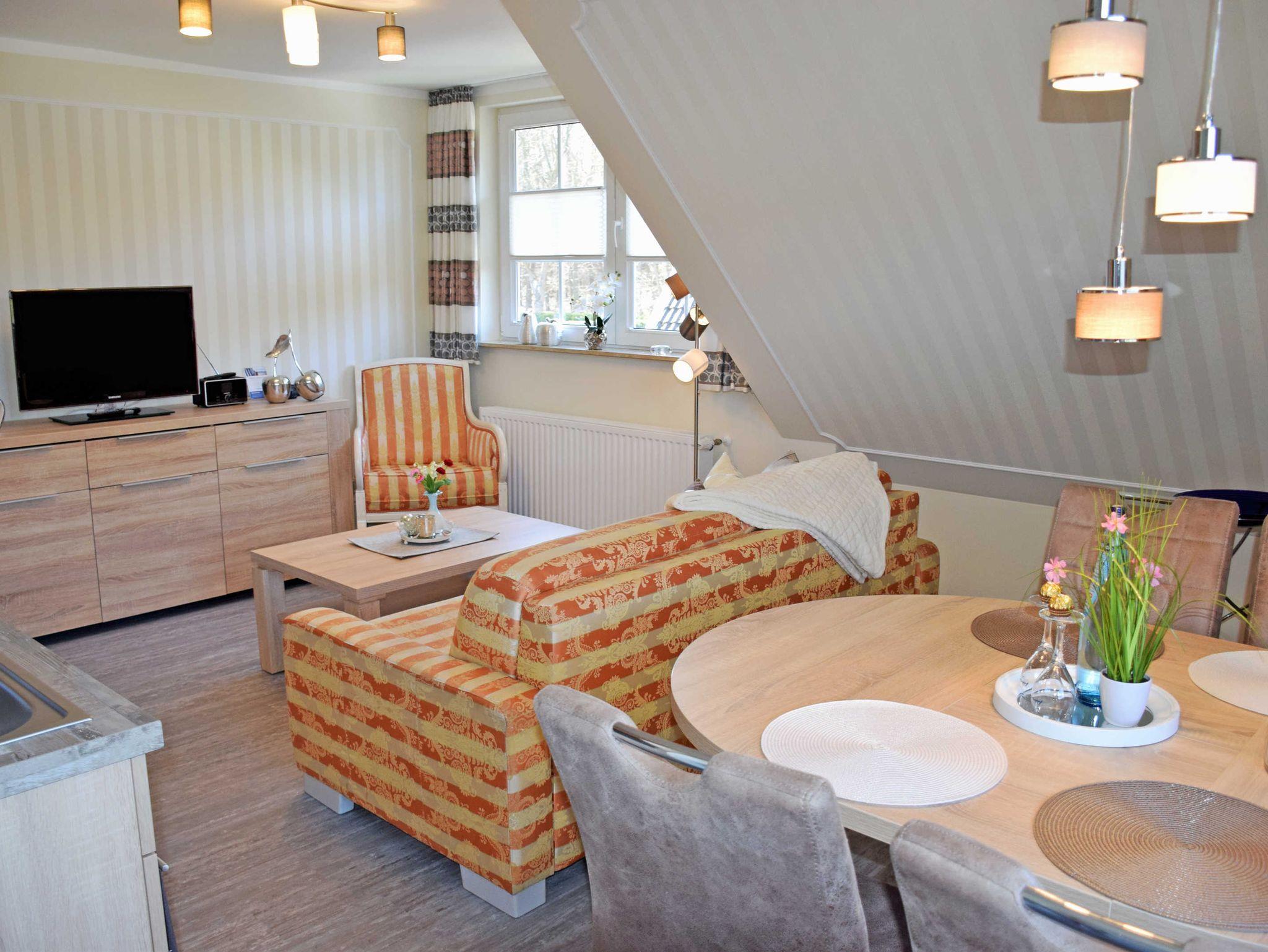Unser moderne und liebevoll eingerichteten Ferienappartements am Granitzwald (ca. 48 qm, 1 Wohnzimmer, 1 Schlafzimmer; max. 3 Erw., mit WLAN - Anschluss) befinden sich im Obergeschoss eines 2000 neu erbauten Wohnhauses. Das Haus liegt sehr ruhig und naturnah direkt am Beginn der Garnitz mit herrlichen Misch- und Buchenwäldern. Bis zum kilometerlangen, feinsandigen Badestrand an der Ostsee sind es nur ca. 1.500 m.