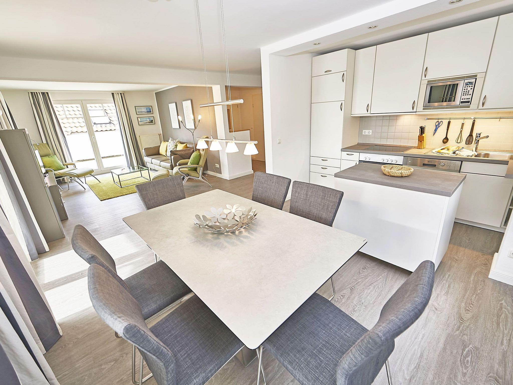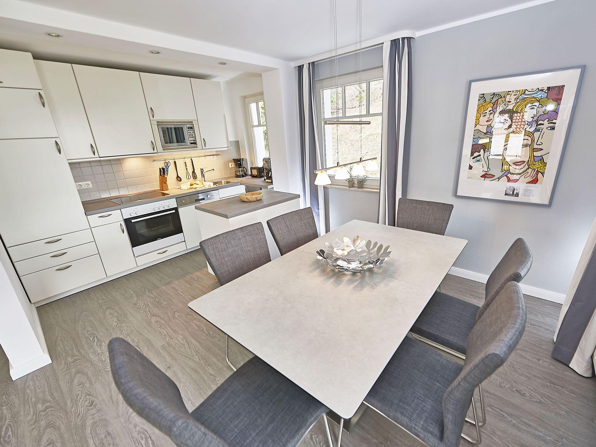 Im Essbereich gibt es einen großen Esstisch für 4-6 Personen und die harmonisch im Wohnbereich integrierte Küchenzeile, die mit einem Kühlschrank mit Gefrierfach, 4-Zonen-Cerankochfeld, Backofen, Geschirrspüler, Mikrowelle, Wasserkocher, Kaffeemaschine, Espressomaschine, Toaster und diversem Kleininventar aller bestens ausgestattet ist.