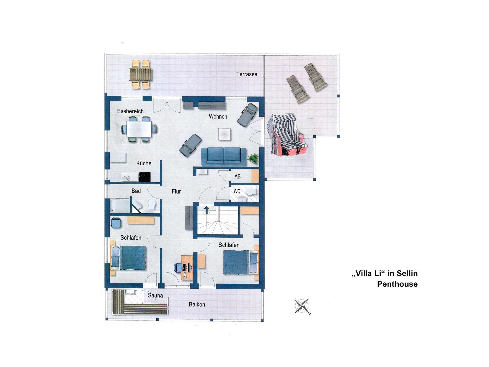 Dieses schöne Penthouse mit komfortabler Ausstattung befindet sich im obersten Geschoss des Hauses und verfügt über ca. 85 m² Wohnfläche. Die mit rund 60 m² sehr großzügig bemessene Dachterrasse zur Süd-West-Seite mit einem großen Strandkorb sowie ausreichend Terrassenmöbeln macht dieses Appartement besonders reizvoll.