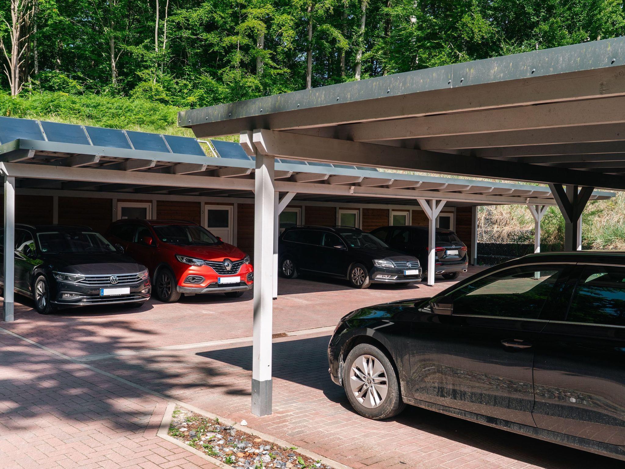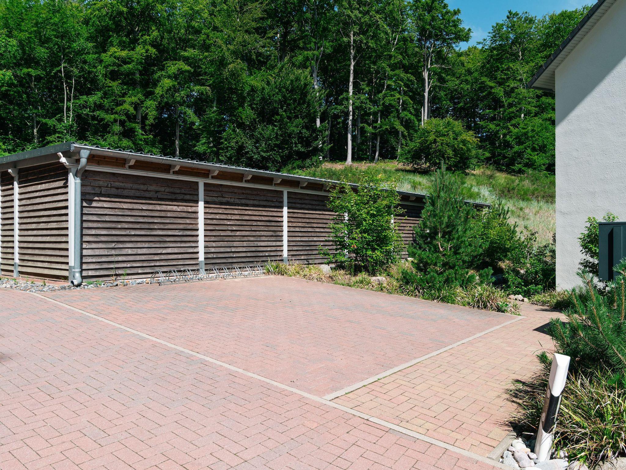 Für Fahrradfahrer und Familien gibt es eine praktische, abschließbare Unterstellmöglichkeit direkt am Carport perfekt auch für Kinderwagen. Besonders innovativ: Direkt vor dem Haus laden Sie Ihr E-Bike bequem und sicher auf.