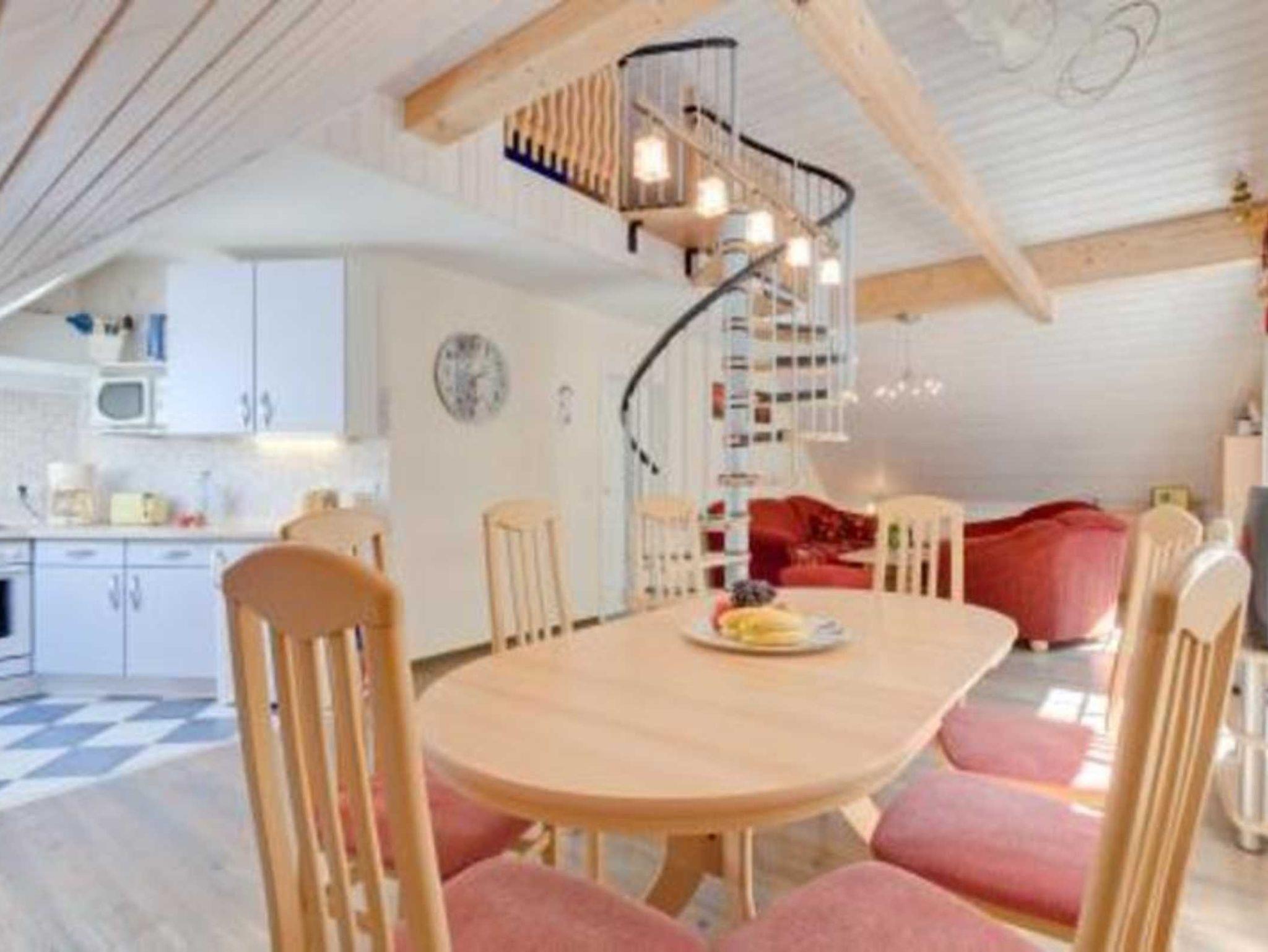 Die 90 qm große Ferienwohnung ist für 6 Erwachsene Personen plus eine zusätzliche Aufbettung und erstreckt sich über 2 Etagen. Über eine Wendeltreppe im Wohnzimmer kann man eine offene Galerie mit Couch, Leseecke und kleinem Schrank erreichen. Dahinter befindet sich das 2. Schlafzimmer durch eine Tür getrennt, mit Doppelbett und Einbauschränken. Ein separates Schlafzimmer mit Doppelbett und Kleiderschrank findet man unten neben dem großen Bad. Zur Badausstattung zählen die Dusche, Waschbecken, WC, Handtuchtrockner und Haarfön.