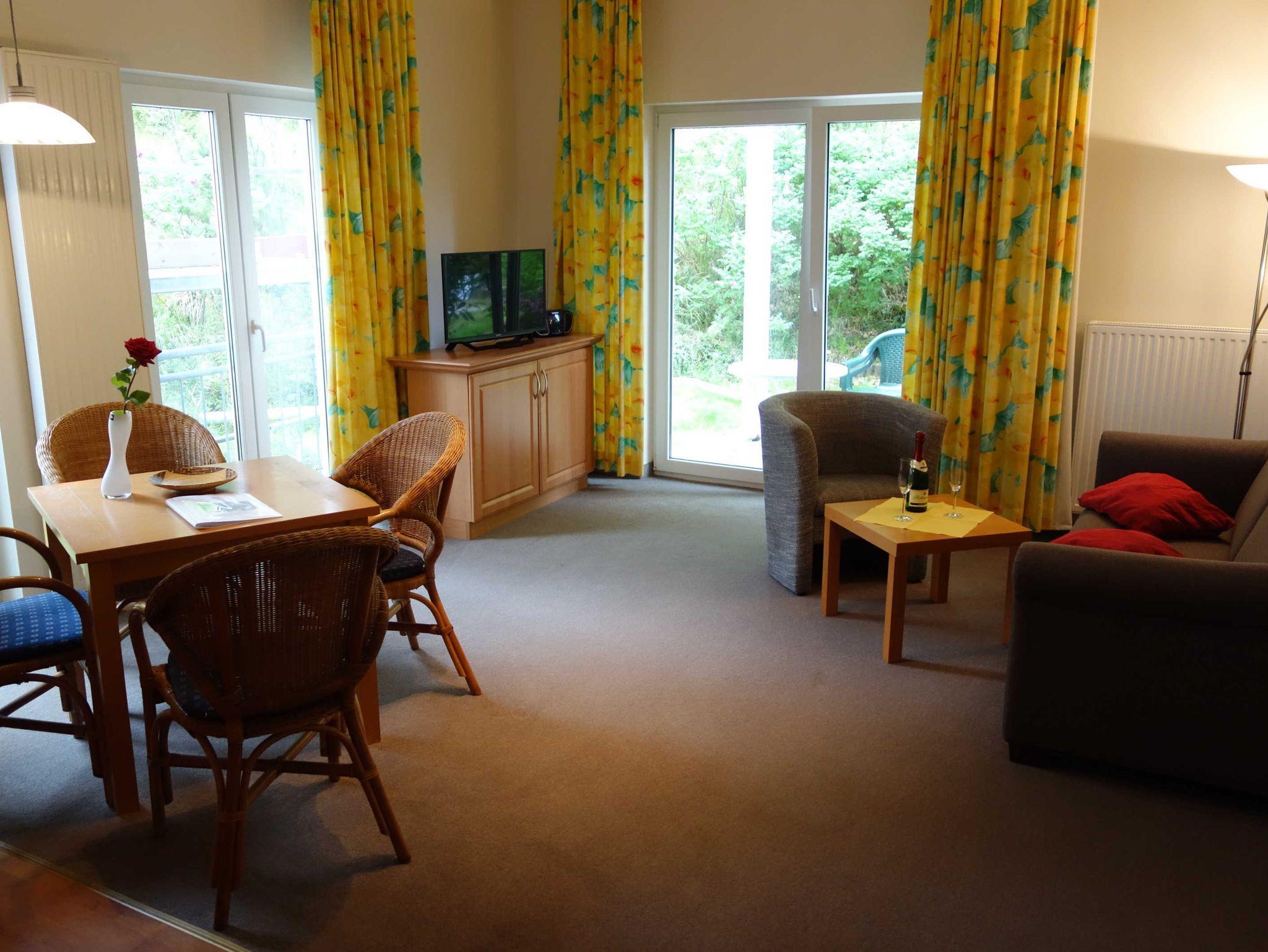 Ein Doppelbett, eine Doppelschlafcouch, ein Balkon, Küchenzeile mit Mikrowelle, Backofen und Tiefkühlfach, Bad (Dusche, WC), kostenlose Sauna-Nutzung, Kinderbett und Kinderstuhl auf Anfrage kostenlos stellbar, kostenlose W-LAN-Nutzung, Münzwaschmaschine und Trockner, Parkplatz (entgeltlich), Hunde und Haustiere auf Anfrage (entgeltlich) möglich, Rauchen im gesamten Haus nicht erlaubt (aber auf dem Balkon möglich).