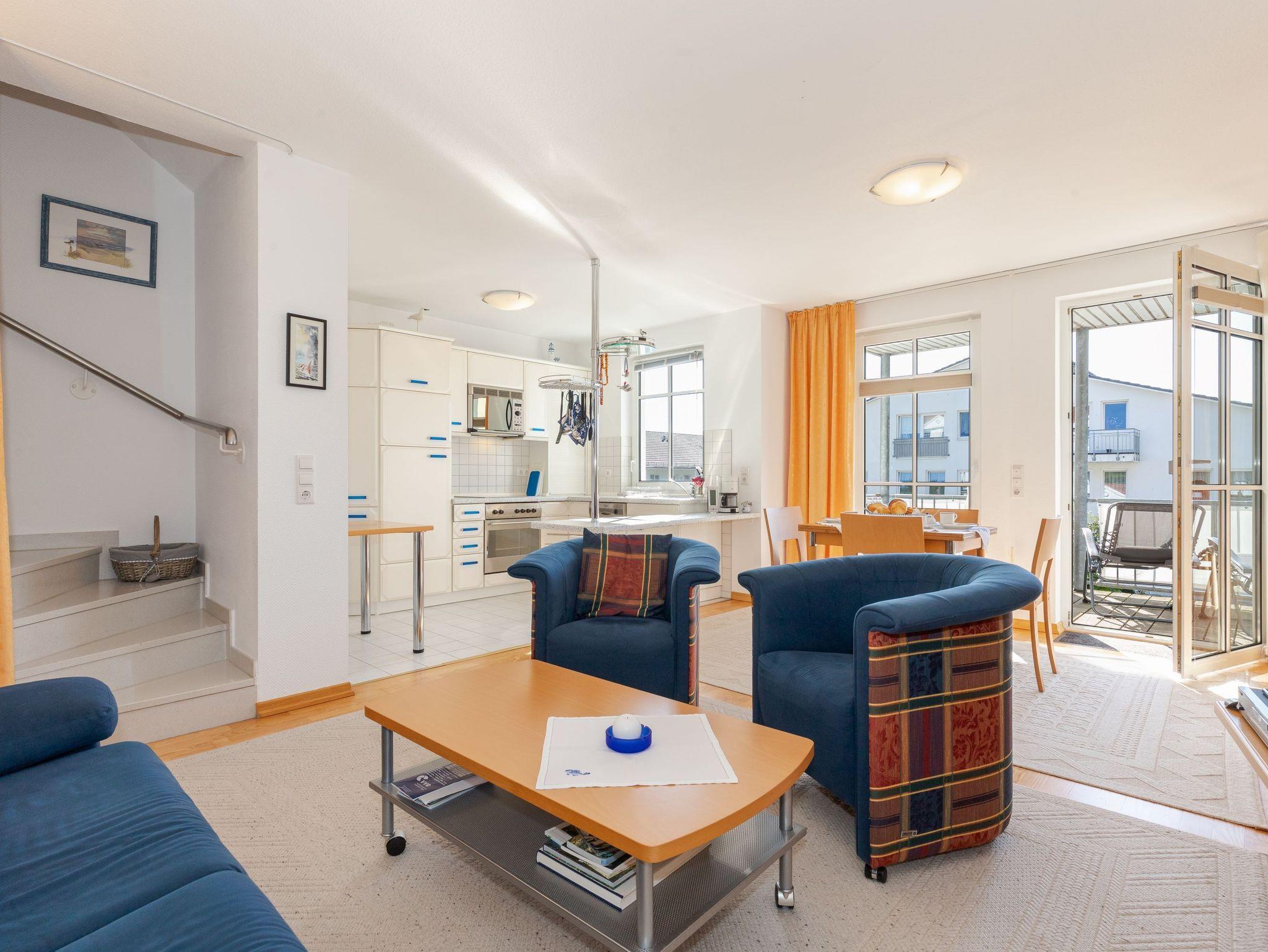 Die Ferienwohnung in Sellin befindet sich in einer ruhigen und dennoch zentralen Lage nahe des Ostseestrandes. Auf einer Wohnfläche von 65 m² bietet sie Platz für einen entspannten Urlaub auf Rügen, unabhängig von der Jahreszeit. Das freundliche Wohn- und Esszimmer verfügt über eine offene Küche und große Fensterfronten, die einen Blick auf die Umgebung ermöglichen. Eine moderne Sofagarnitur lädt zum gemütlichen Ausklang des Tages ein. Der sonnige Balkon ist über das Wohnzimmer erreichbar und mit komfortablen Gartenmöbeln ausgestattet. Hier können Sie die frische Ostseeluft genießen und sich sonnen oder ein entspanntes Frühstück einnehmen. Die Plissees bieten dabei Privatsphäre.