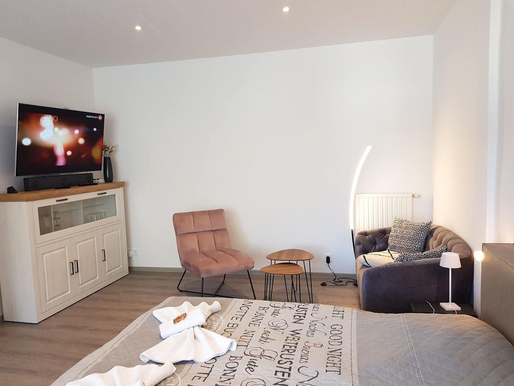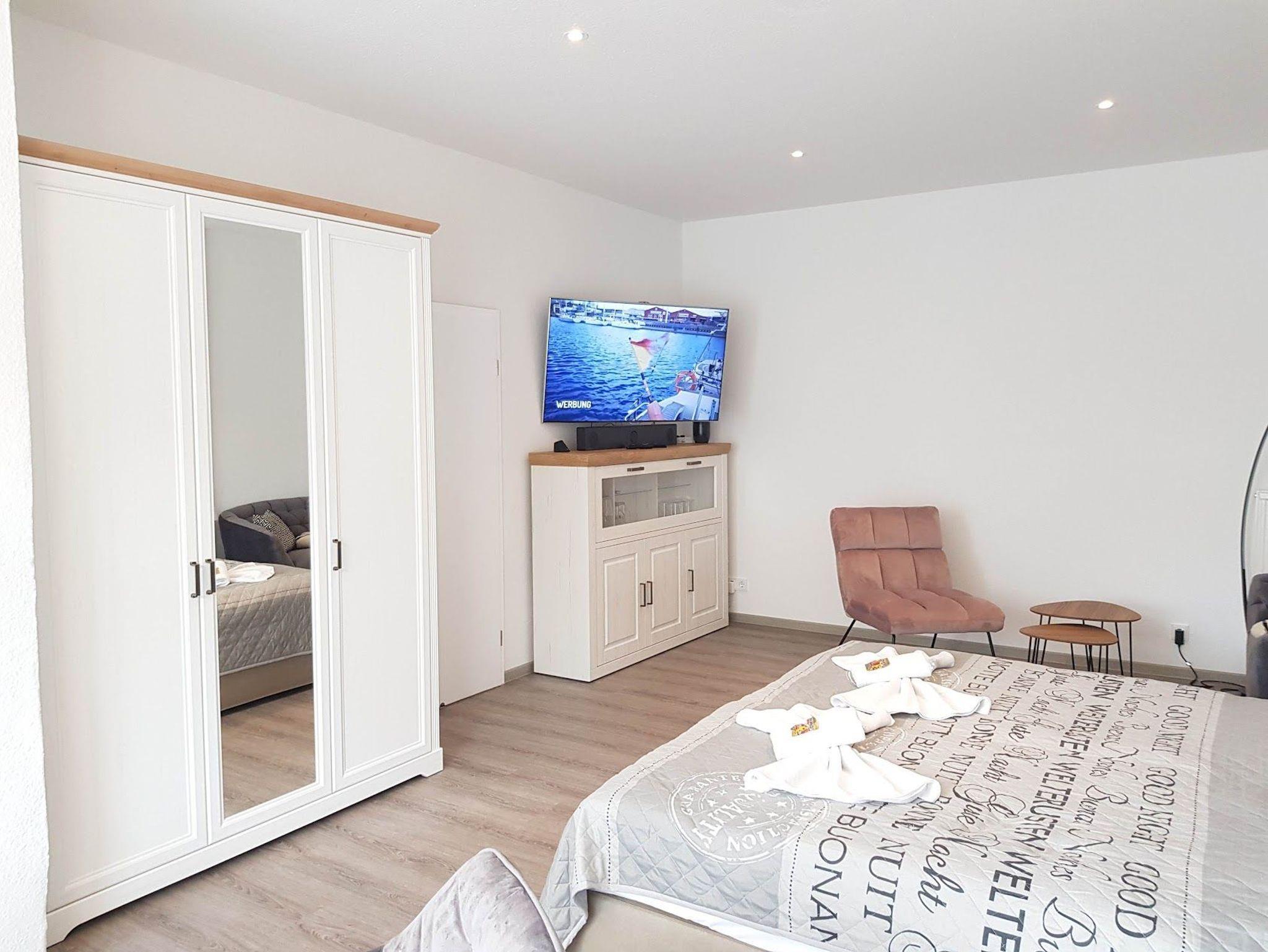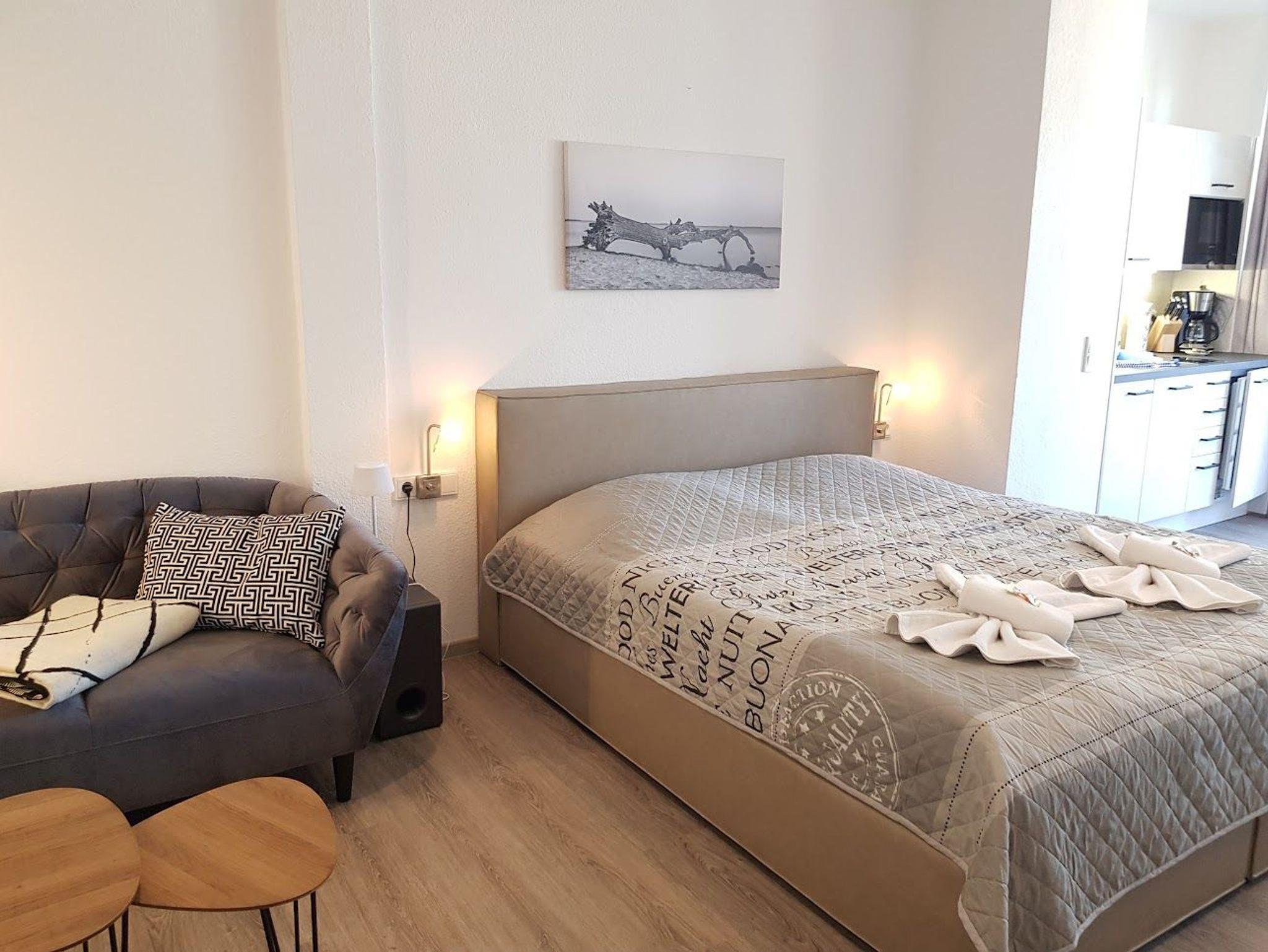 Das 1 Raumappartement hat einen Wohn-Schlafraum mit Doppelbett für 2 Personen, Kabel-TV,Esstisch, gut ausgestattete Küchenzeile mit Geschirrspüler, Kaffeemaschine, Toaster und Microwelle.