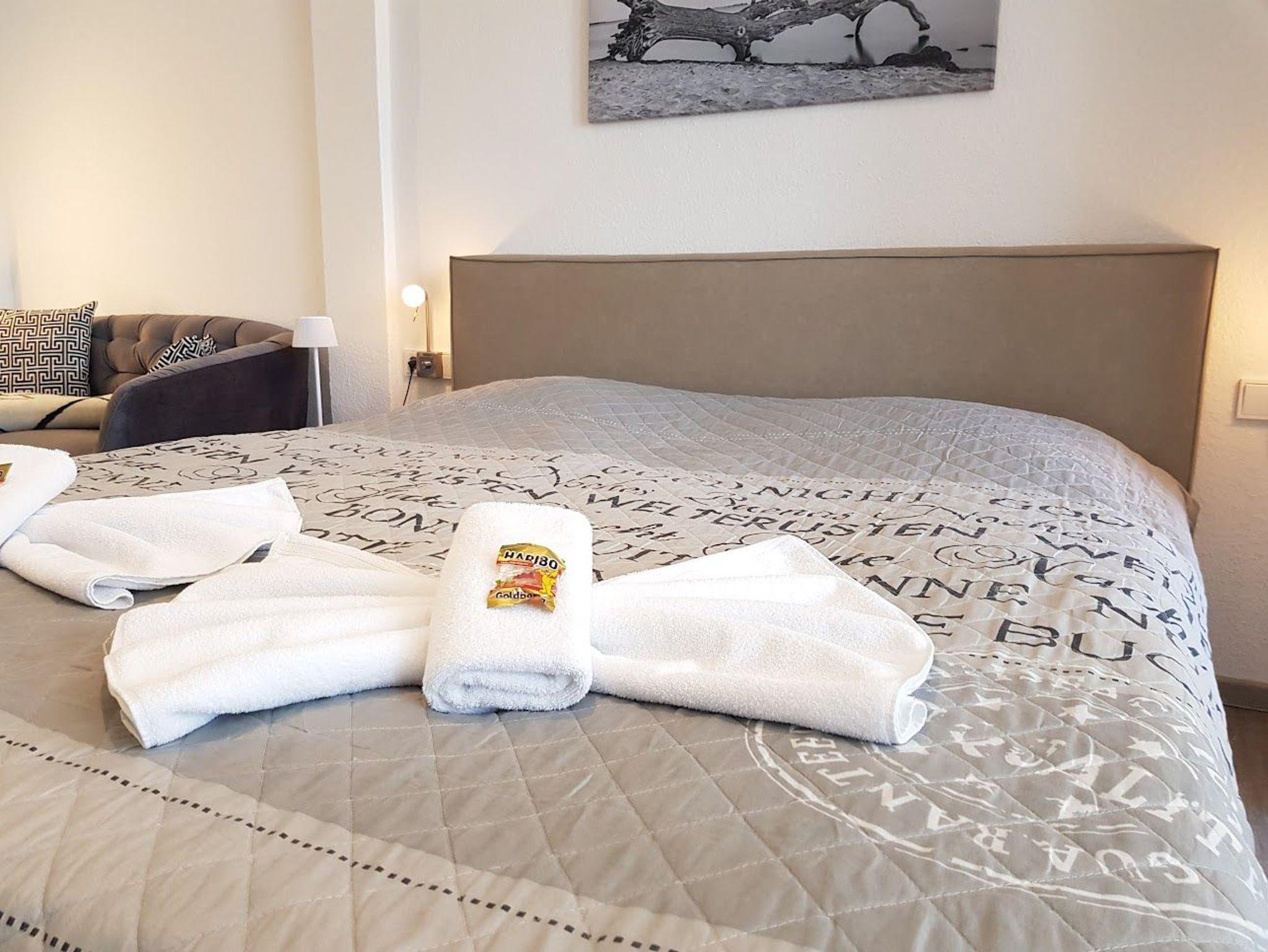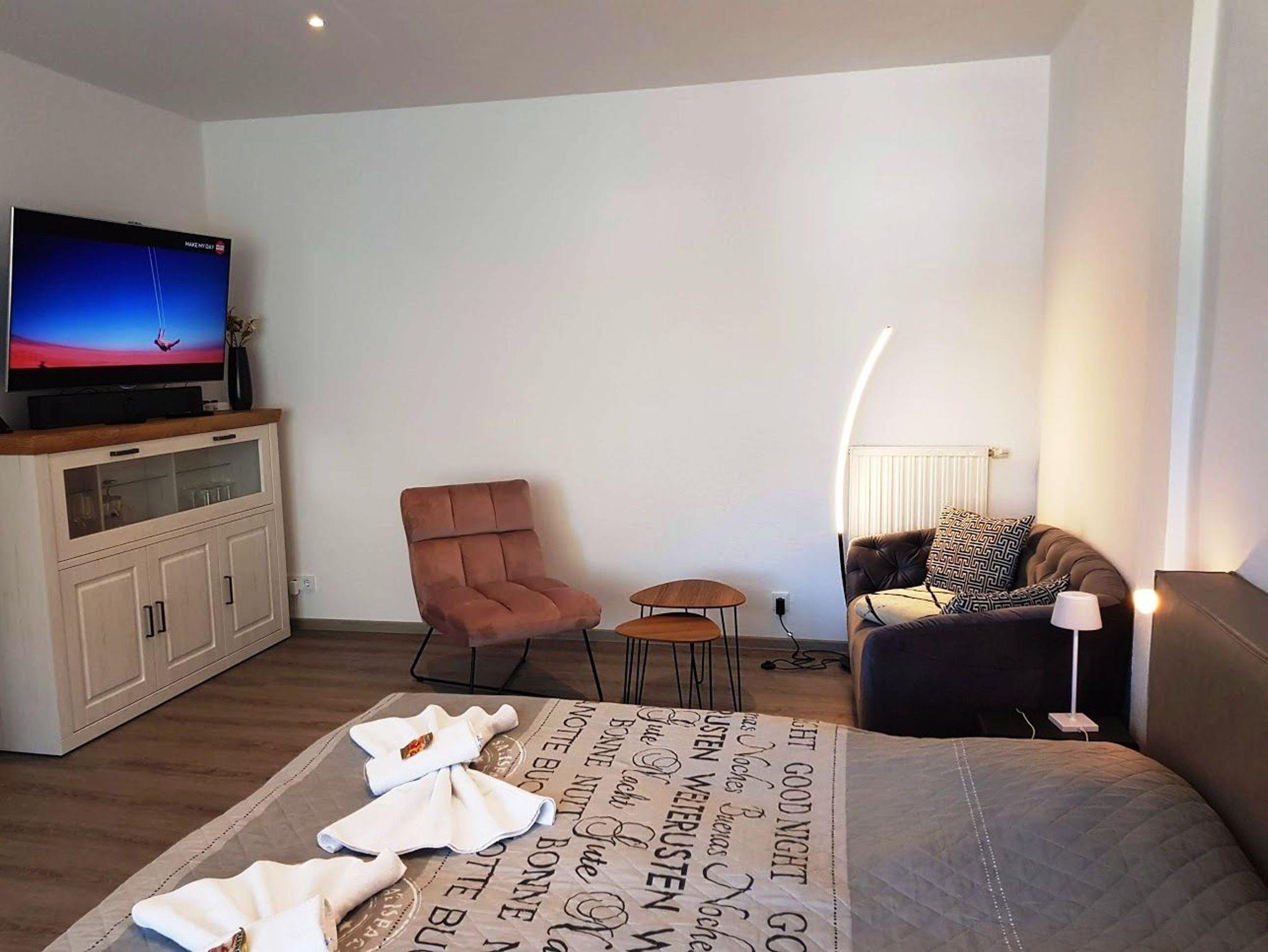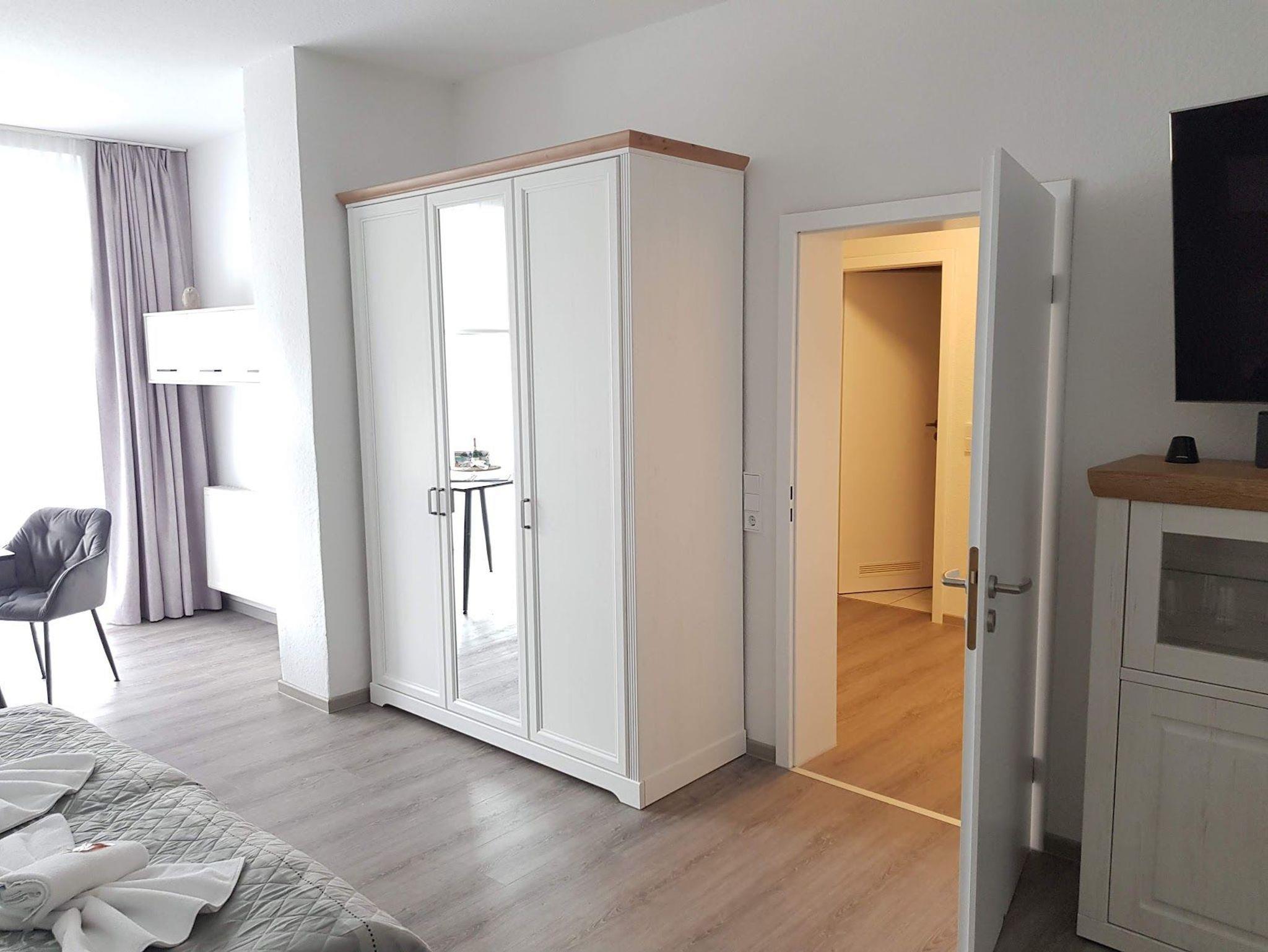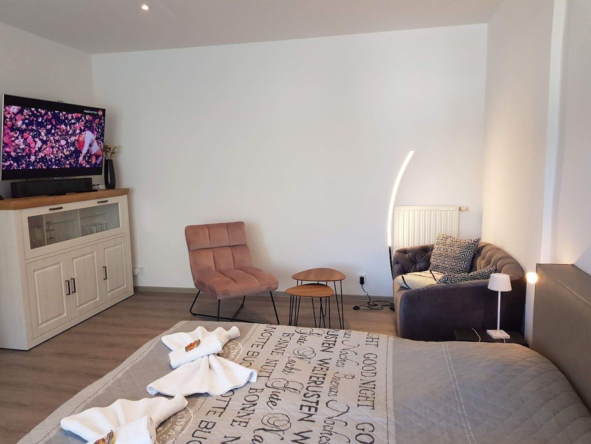 Das 1 Raumappartement hat einen Wohn-Schlafraum mit Doppelbett für 2 Personen, Kabel-TV,Esstisch, gut ausgestattete Küchenzeile mit Geschirrspüler, Kaffeemaschine, Toaster und Microwelle.