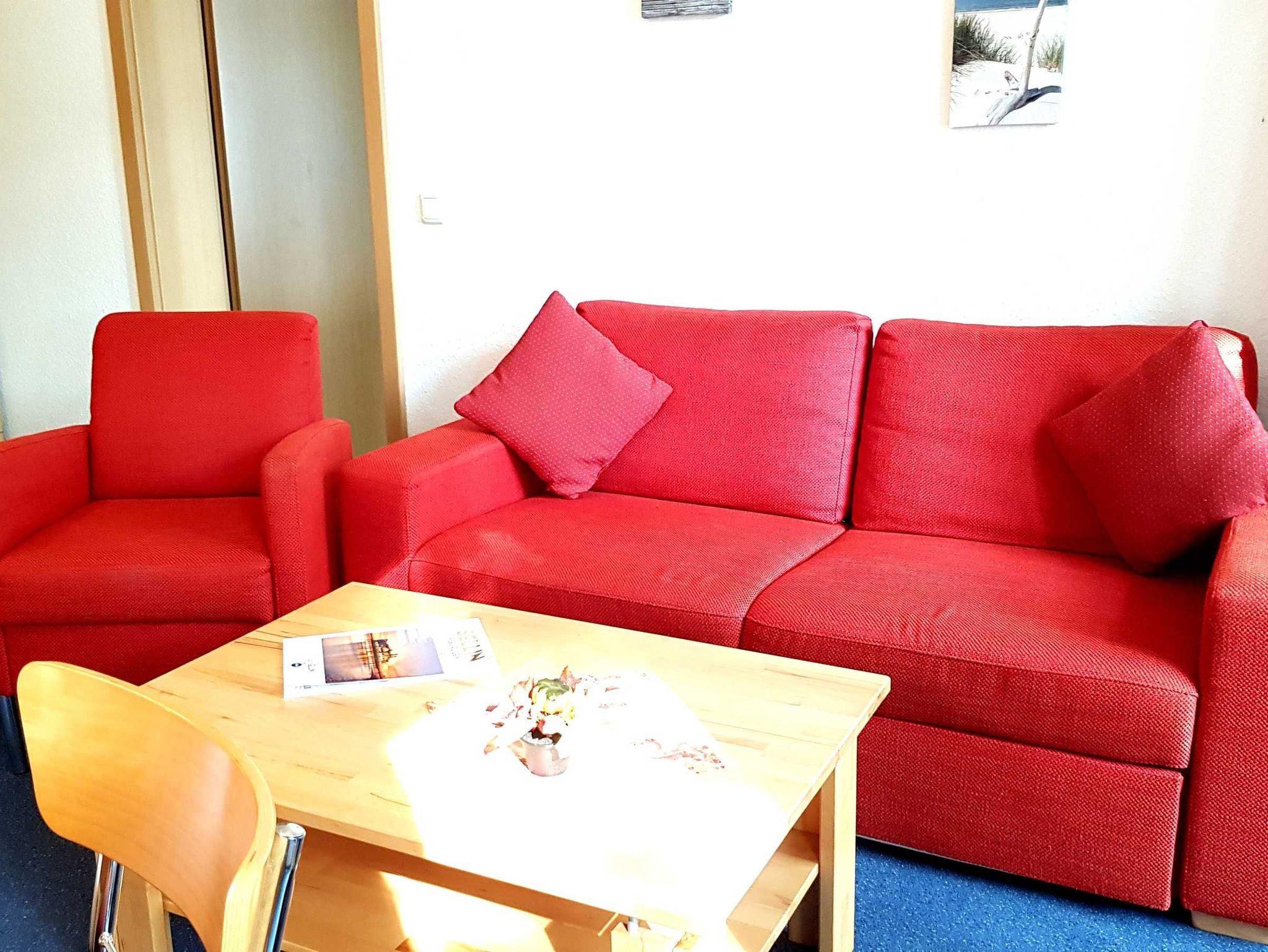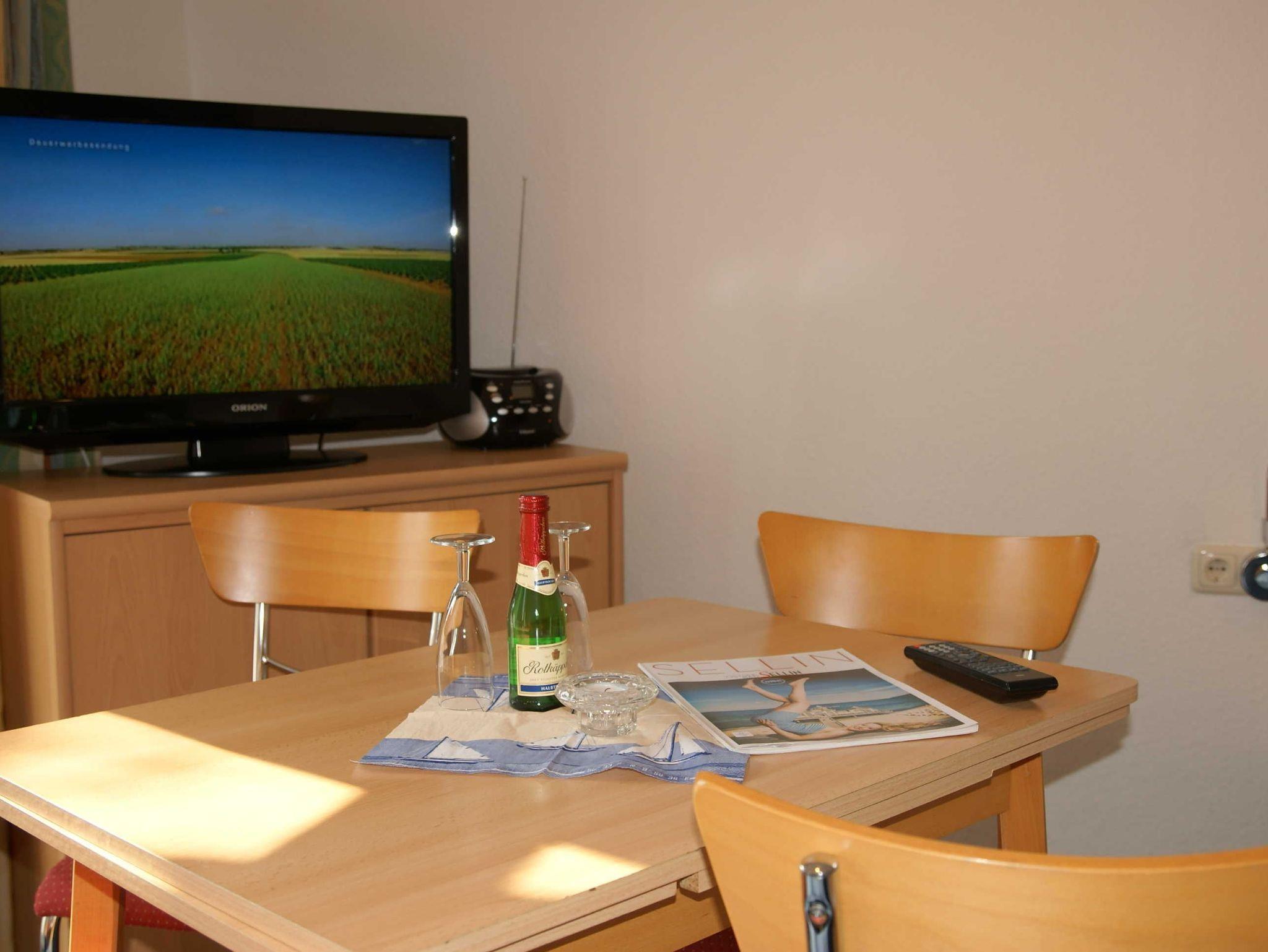 2 Raum Apartment in Parterre Ostseite gelegen mit Wohn-Schlafraum und Doppelbett und einem 2. Zimmer mit Schlafcouch. Einem Esstisch im Wohnschlafraum für 4 Personen und gut ausgestatte Küche mit Geschirrspüler, Kaffeemaschine, Wasserkocher etc. Babybetten ohne Wäsche können gemietet werden. Bitte vorbestellen.