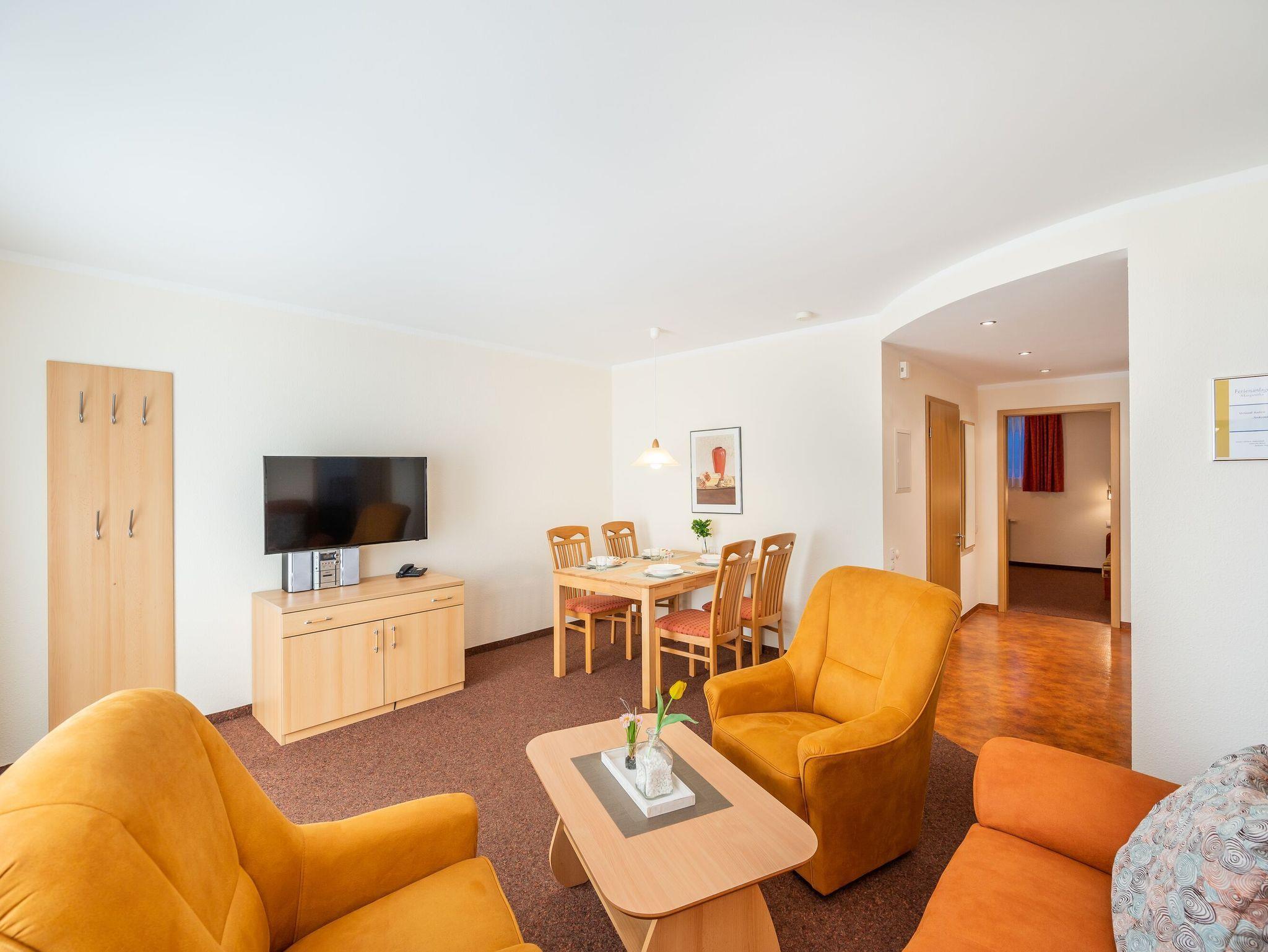Das helle Wohnzimmer verfügt über eine Couchgarnitur, einen TV und einen kostenfreien WLAN-Zugang. Zudem erreichen Sie von hier aus die sonnige Terrasse inkl. Terrassenmöbel.
