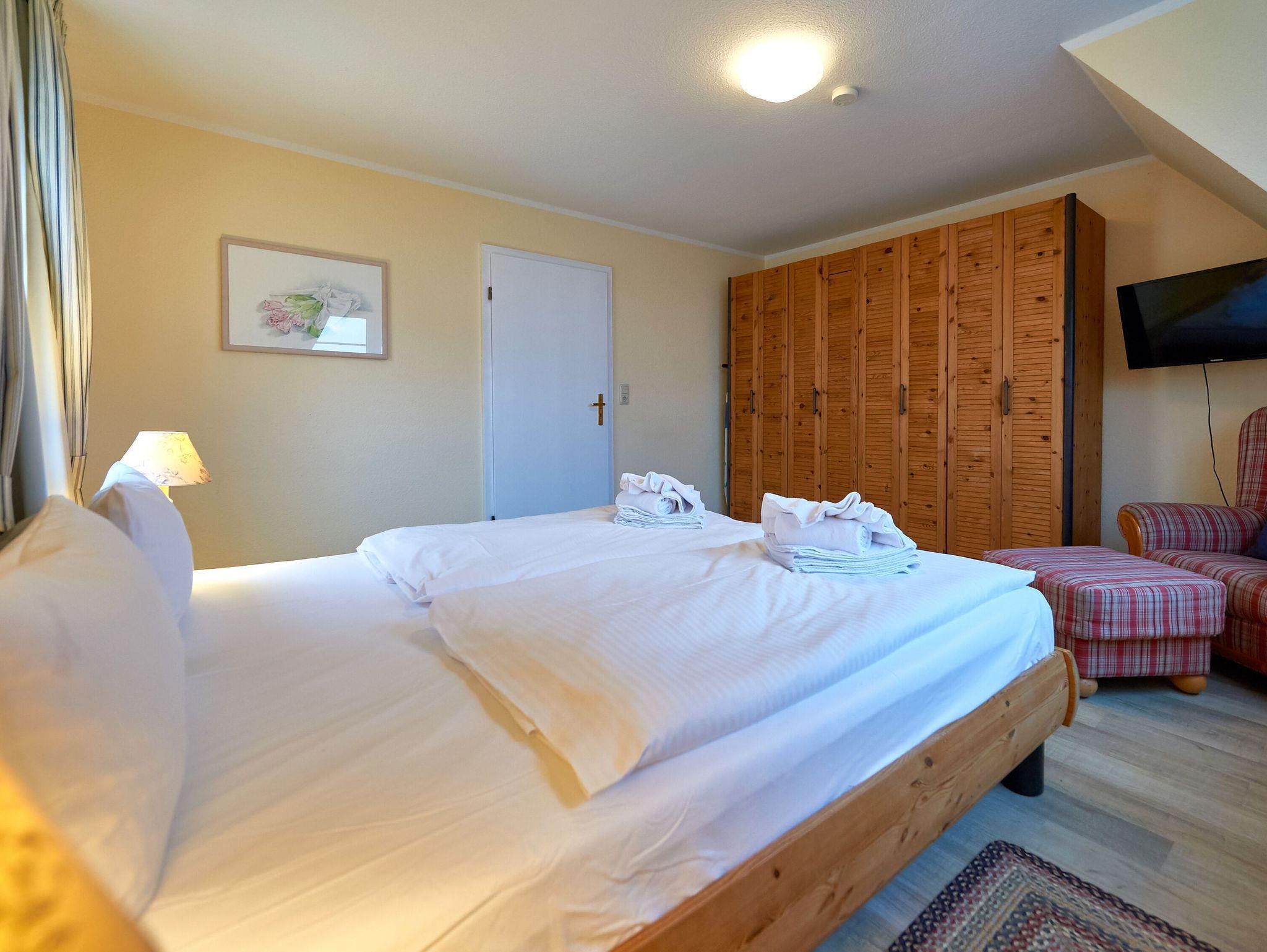 Im ersten Obergeschoss befinden sich das Badezimmer mit Dusche/WC und zwei Schlafzimmer. Das größere der Schlafzimmer ist mit einem Doppelbett (1,80 x 2,00m), einem großen Kleiderschrank und einem TV ausgestattet und bietet ebenfalls einen schönen Ausblick auf den Selliner See. Im kleineren Schlafzimmer sind zwei Einzelbetten (1,00 x 1,90m) untergebracht.