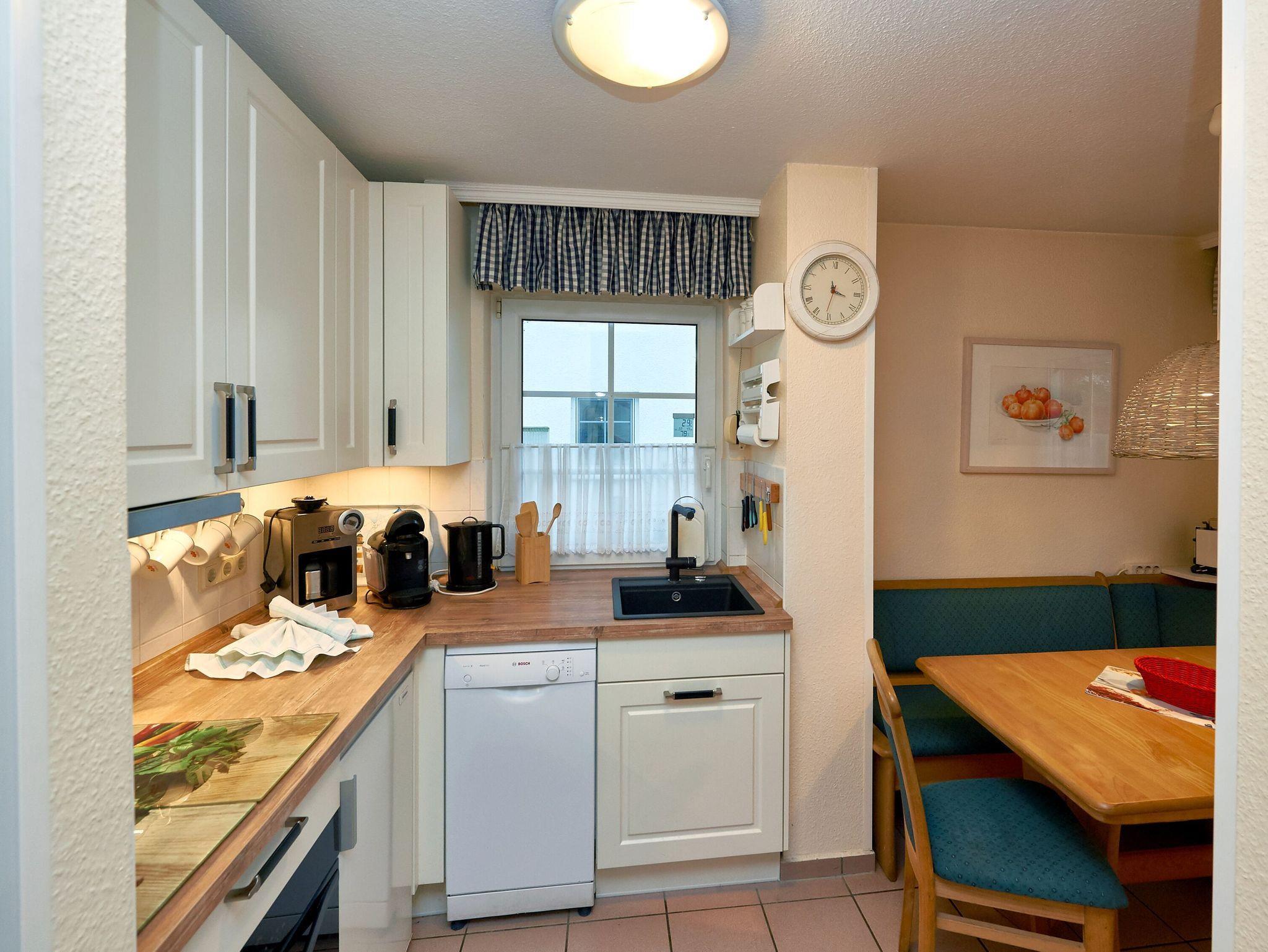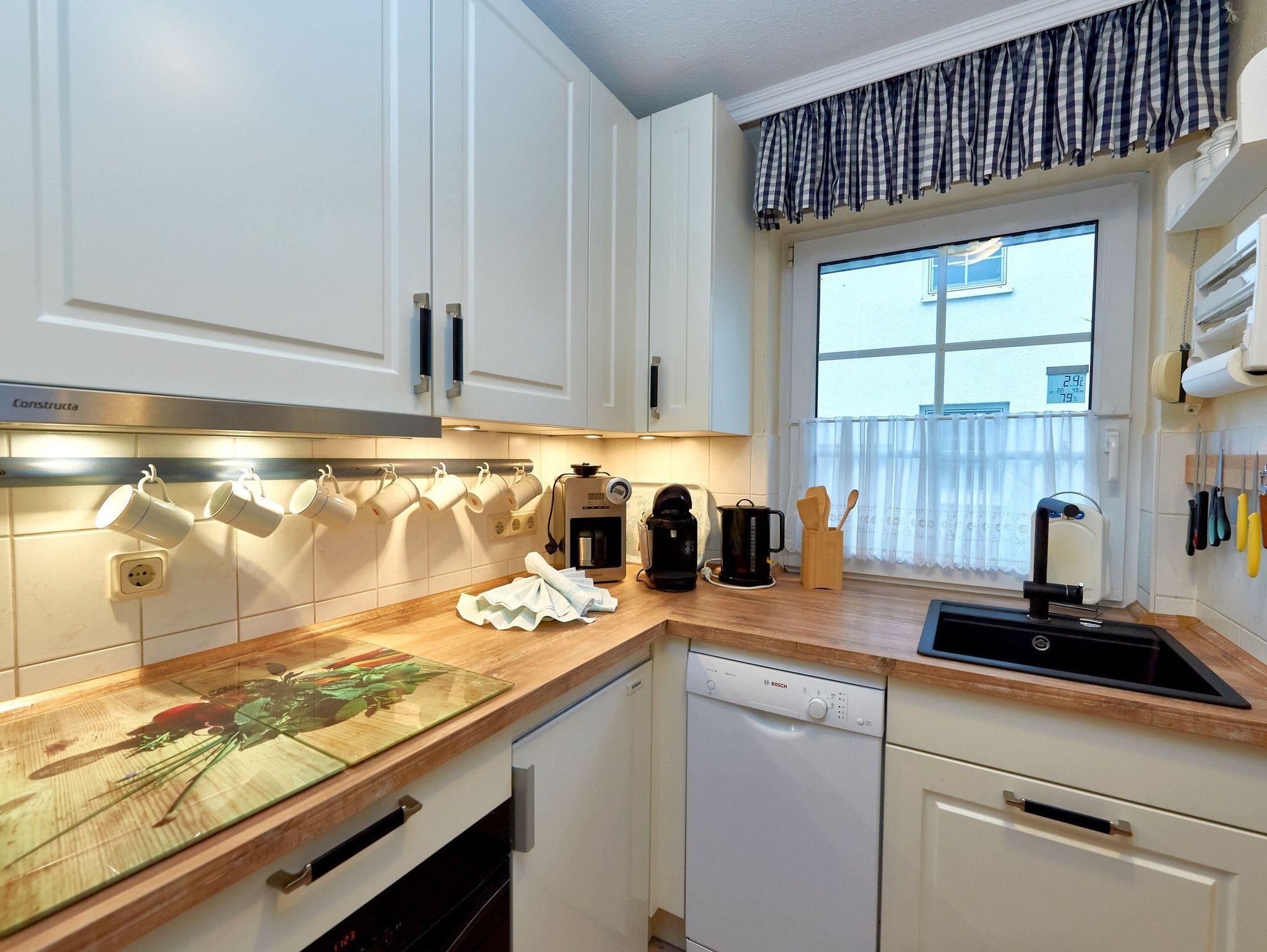 Zur technischen Ausstattung im Wohnzimmer zählen ein großer Flachbild-TV, ein CD/DVD-Player und eine Hifi-Anlage. Auch eine kleine literarische Auswahl sowie ein paar Spiele sind vorhanden. Die offene Küche bietet alles, was man braucht, um sich selbst zu bekochen. Das zählen ein Induktionsherd mit Dunstabzugshaube, ein Kühlschrank mit Gefrierfach, ein Geschirrspüler, eine Mikrowelle mit Backofen sowie eine Kaffeemaschine, ein Wasserkocher und ein Toaster. Selbstverständlich fehlt es auch nicht am nötigen Koch- und Essgeschirr.