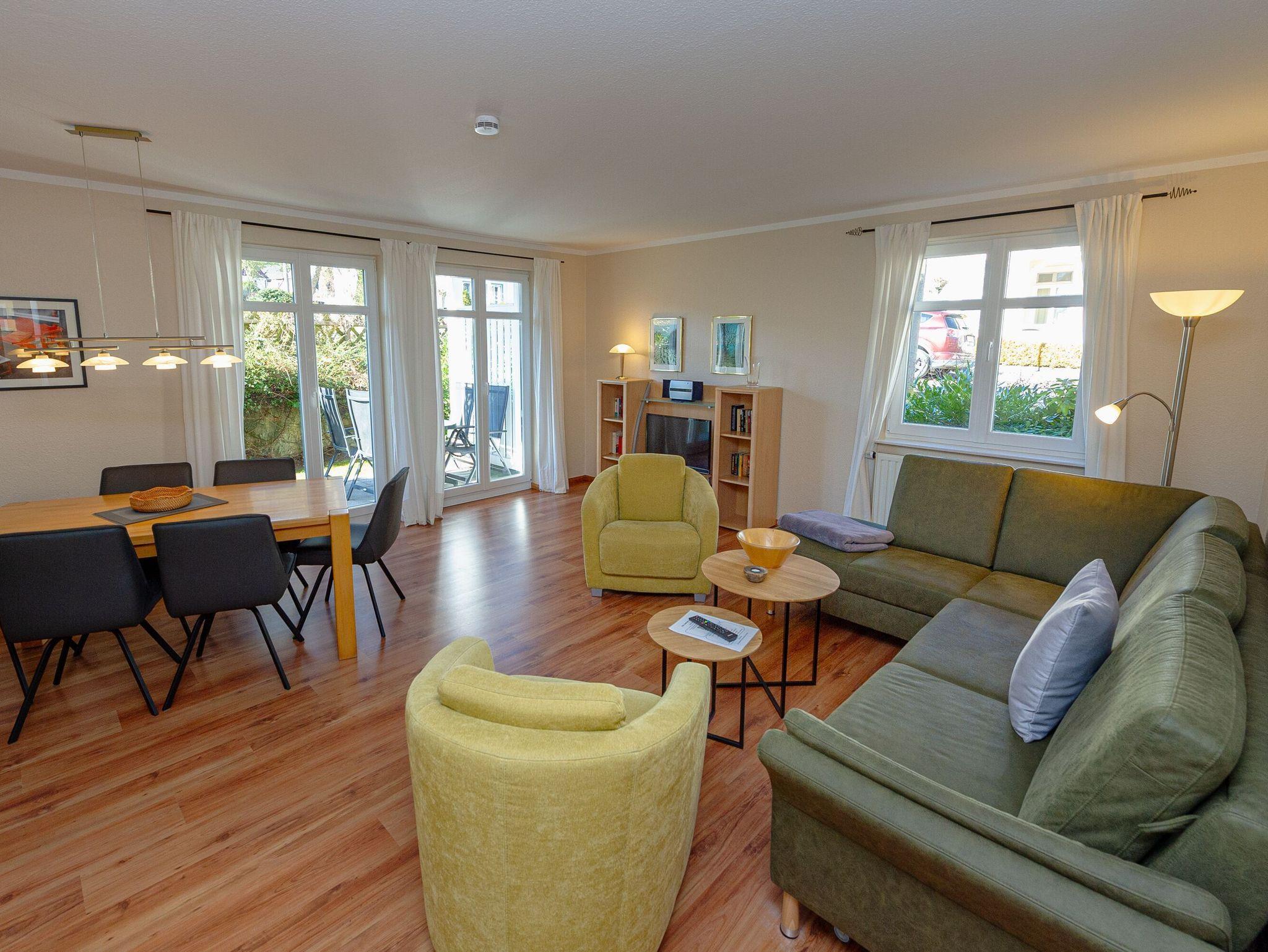 Der helle, freundliche Wohnraum ist mit einer bequemen Lederschlafcouch (die als Aufbettung für 2 Personen genutzt werden kann), zwei Sesseln und zwei Korbsesseln, einem Flachbild-TV, einer Mini-Stereoanlage mit CD-Player und einem Esstisch ausgestattet. Die harmonisch im Wohnbereich integrierte Küchenzeile ist ausgestattet mit einem Kühlschrank mit Gefrierfach, einem 4-Platten-Cerankochfeld, einem Backofen, einer Geschirrspülmaschine, einer Mikrowelle, Wasserkocher, Kaffeemaschine, Toaster und diversem Kleininventar, das die Küchenausstattung komplettiert.