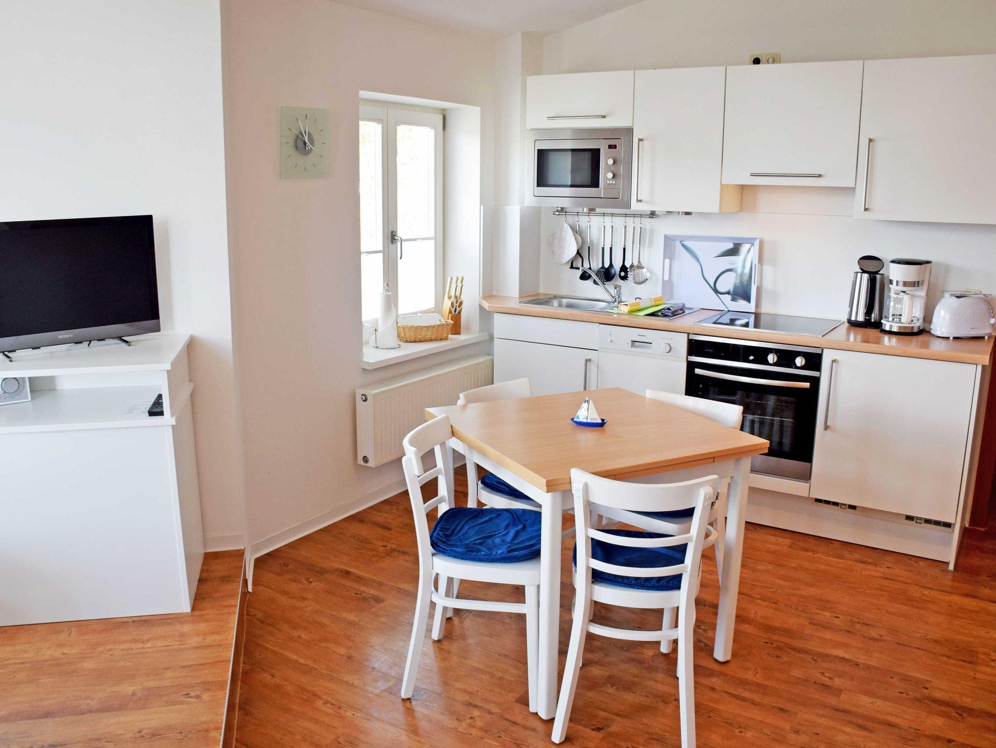Die moderne Küchenzeile ist exklusiv ausgestattet mit Cerankochfeld, Abzugshaube, Backofen, Mikrowelle, Geschirrspülmaschine, Wasserkocher, Kaffeemaschine, Toaster und umfangreichen weiteren Küchenutensilien.