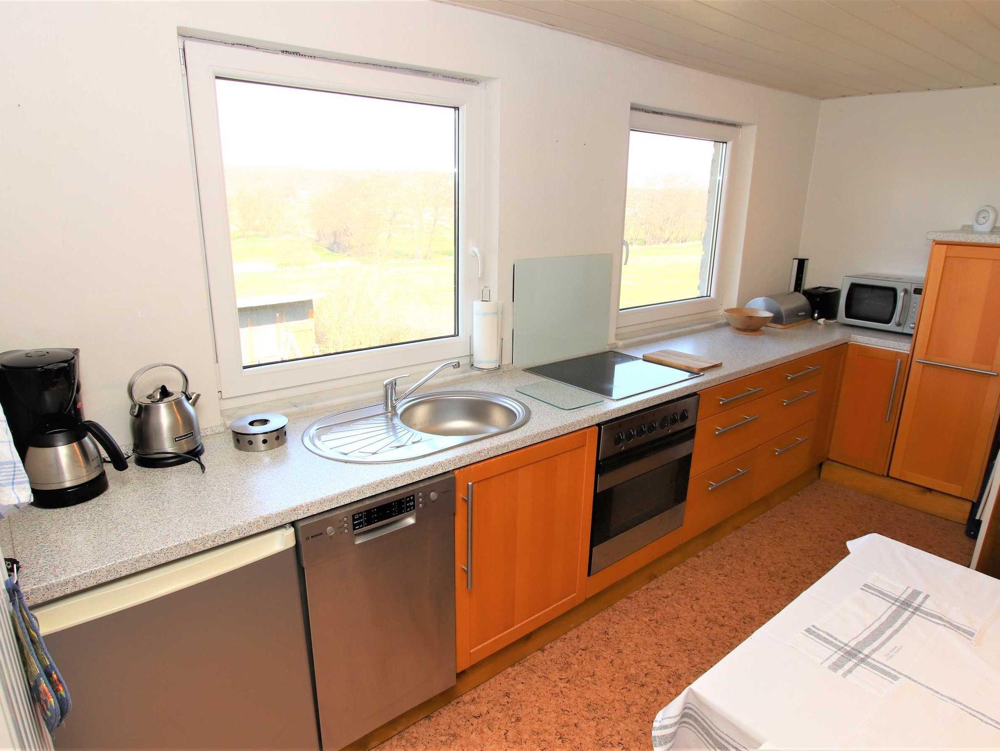 In dem zweiten Wohn- und Schlafraum stehen zwei getrennte Einzelbetten, eine Couch mit Tisch, ein zweites TV-Gerät und Schränke. Die helle Wohnküche ist voll ausgestattet (Geschirrspüler, Kaffeemaschine, Toster, Wasserkocher, Herd, Mikrowelle, Kühlschrank, großzügiger Esstisch mit Stühlen).