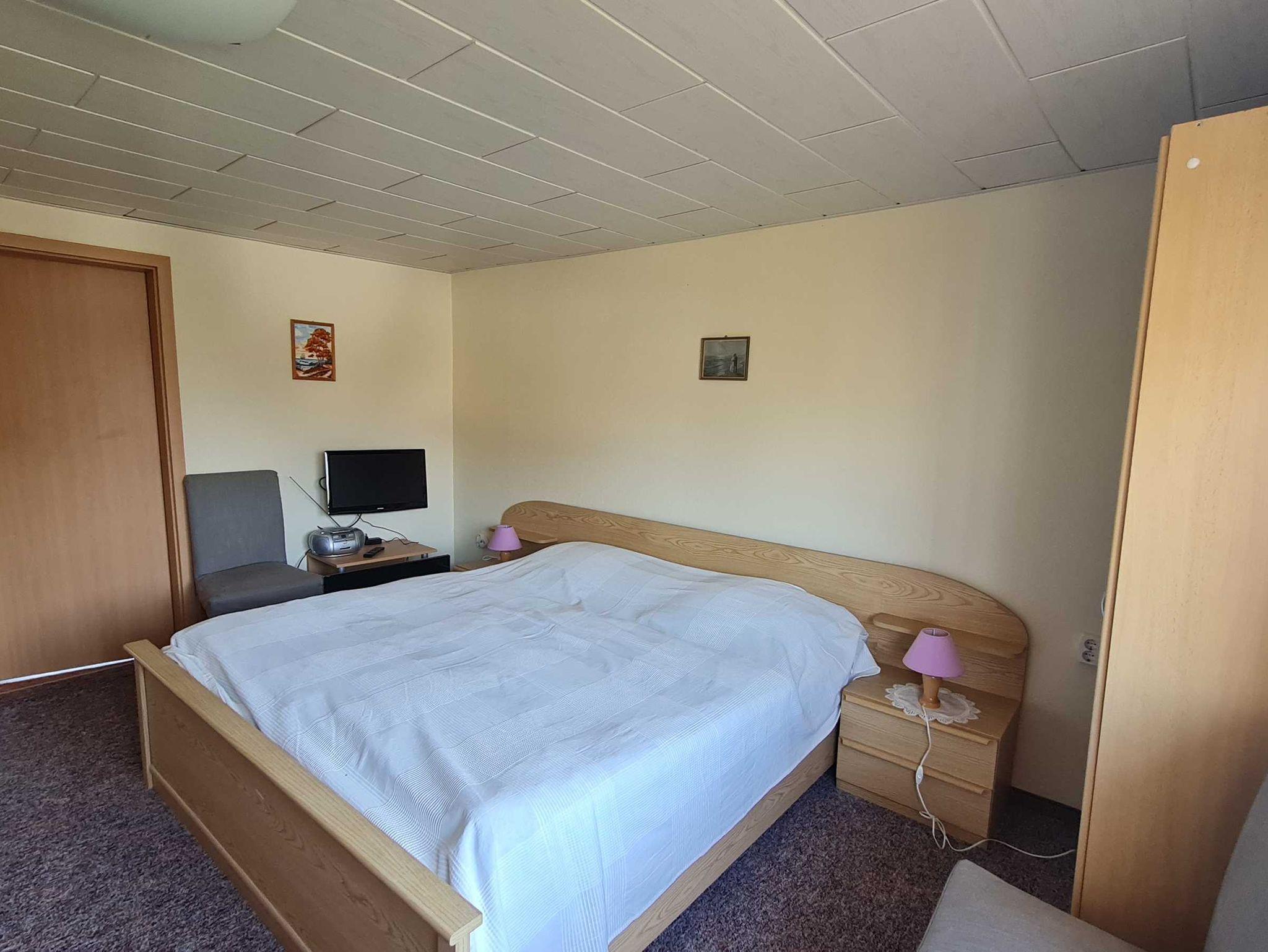 Die große Ferienwohnung befindet sich im Obergeschoss des Hauses und hat zwei Zimmer, die modern und freundlich eingerichtet sind. Im ersten Wohn- und Schlafzimmer befindet sich ein Doppelbett mit Nachttischen und Leselampen, eine Couch mit Sessel und ein TV-Gerät, sowie Radio.