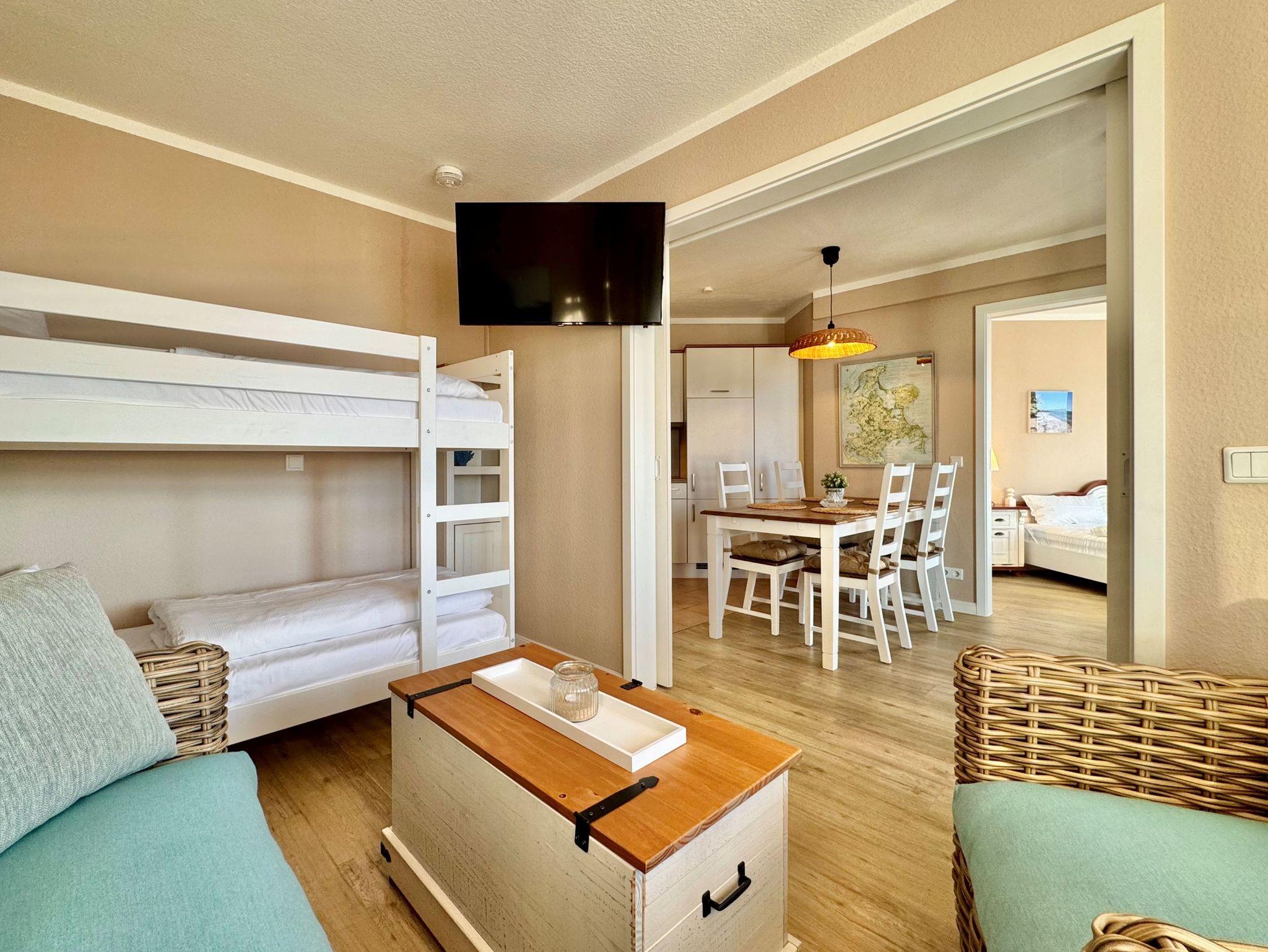 Das separate Schlafzimmer ist mit einem komfortablen Doppelbett und Verdunklungsvorhängen ausgestattet. Ein besonderes Highlight der Wohnung ist das moderne Etagenbett im Wohnzimmer mit zwei Liegeflächen von jeweils 90 x 200 cm, das ideal für Kinder oder weitere Mitreisende geeignet ist.
