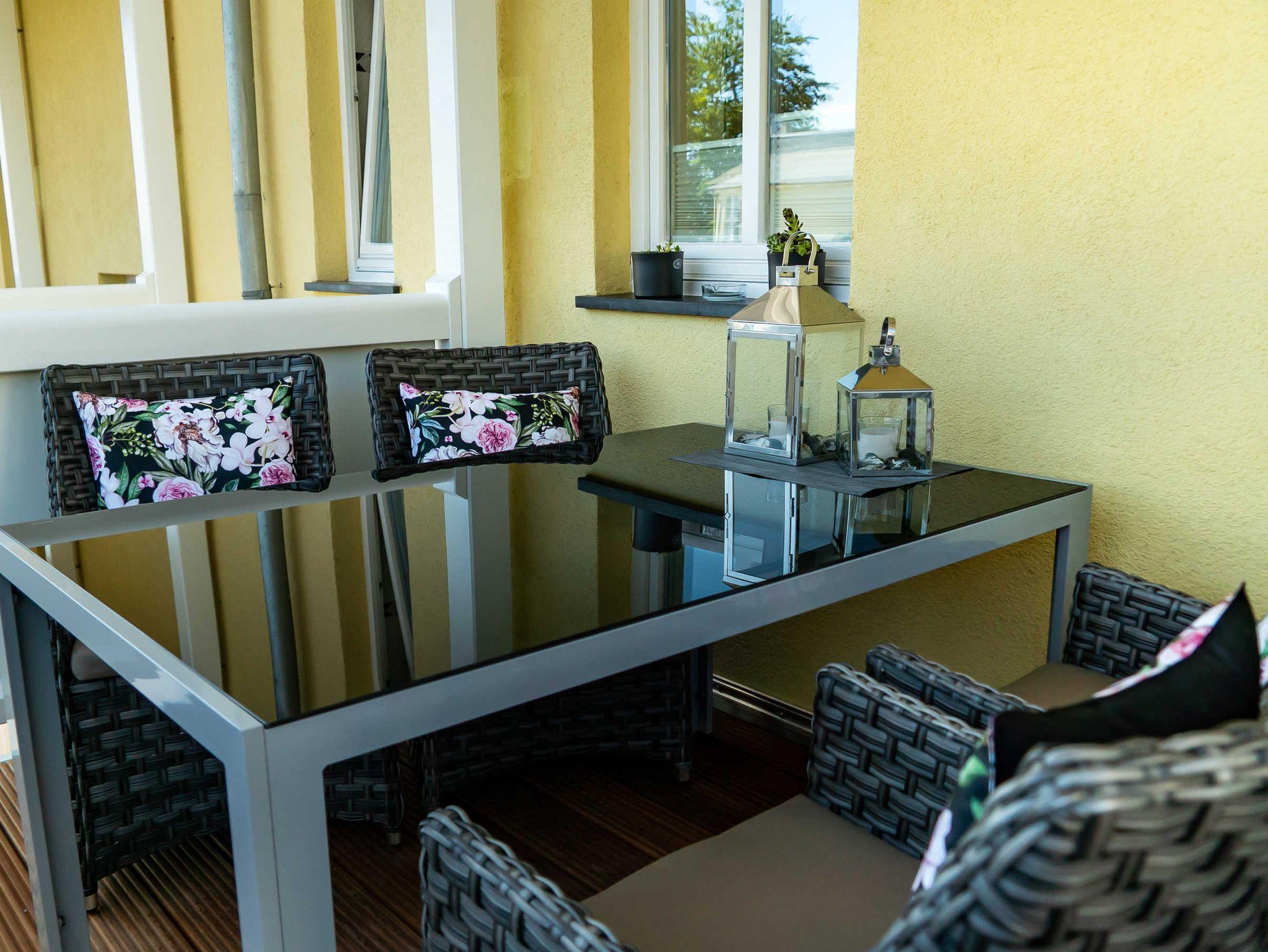 Unsere 53 qm große Ferienwohnung befindet sich in der zweiten Etage (max. 2 Gäste, Schlafzimmer, Wohnzimmer, Küchenzeile, Bad/Dusche, WLAN) ist mit Herz individuell und komfortabel eingerichtet. Bei schönem Wetter lädt ein 12 qm großer Balkon (Richtung Süd-Ost) mit Rattanmöbeln & einer Auflagenbox mit Fleecedecken zum Verweilen ein. Ein Elektrogrill ermöglicht es zu grillen.