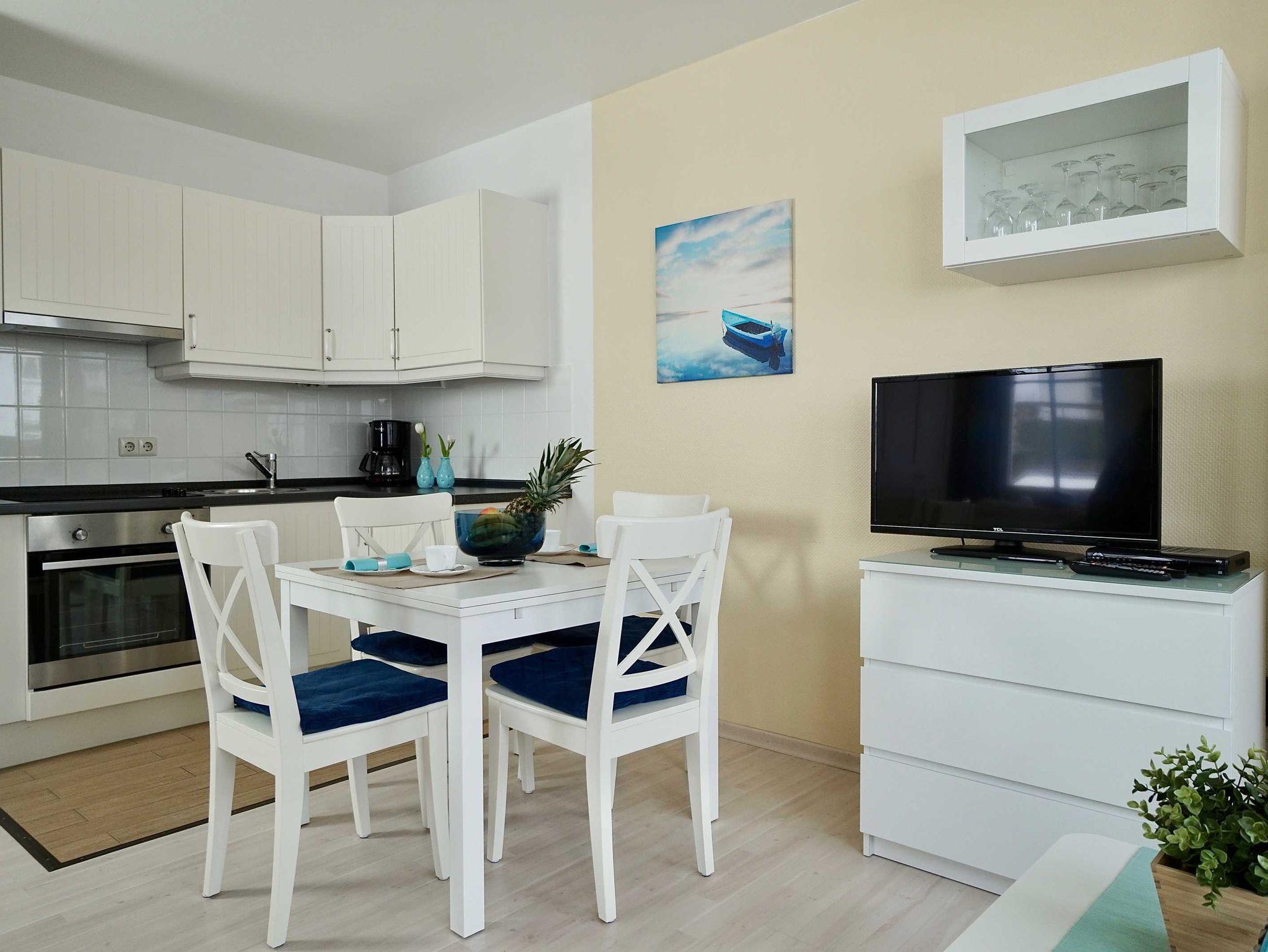 Das gemütlich eingerichtete Ferienappartement Mönchgut (A) bietet auf 44 m² eine moderne Unterkunft für bis zu 4 Gäste. Es verfügt über einen Wohn-Schlafraum mit Doppelbett und einem Schlafsofa für weitere zwei Gäste. Entspannen Sie vor dem Flachbild-TV oder ziehen Sie sich mit einem guten Buch in den bequemen Lesesessel in den integrierten Wintergarten zurück.Der WLAN-Zugang und ein SodaStream steht Ihnen kostenfrei zur Verfügung. Die hübsche Landhausküche ist mit allem ausgestattet, um Ihre Mahlzeiten zuzubereiten. Der Essbereich ist ebenfalls in diesem Wohn-Schlafraum. Zur Wohnung gehört ein helles Tageslicht-Duschbad. Ein Fön gehört ebenfalls zur Ausstattung. Ein Kinderreisebett (bis zwei Jahre) kann bei Bedarf bereit gestellt werden.
