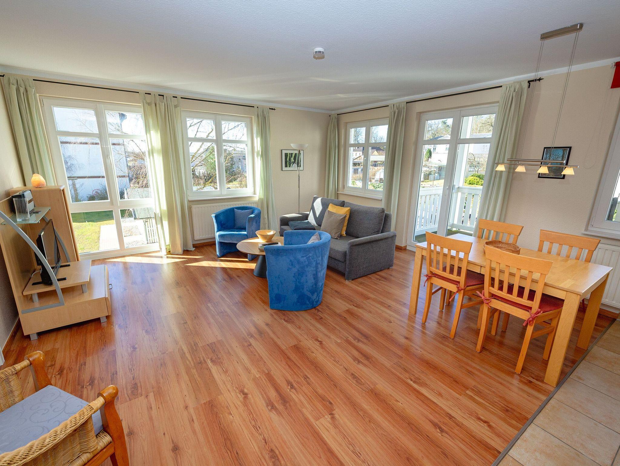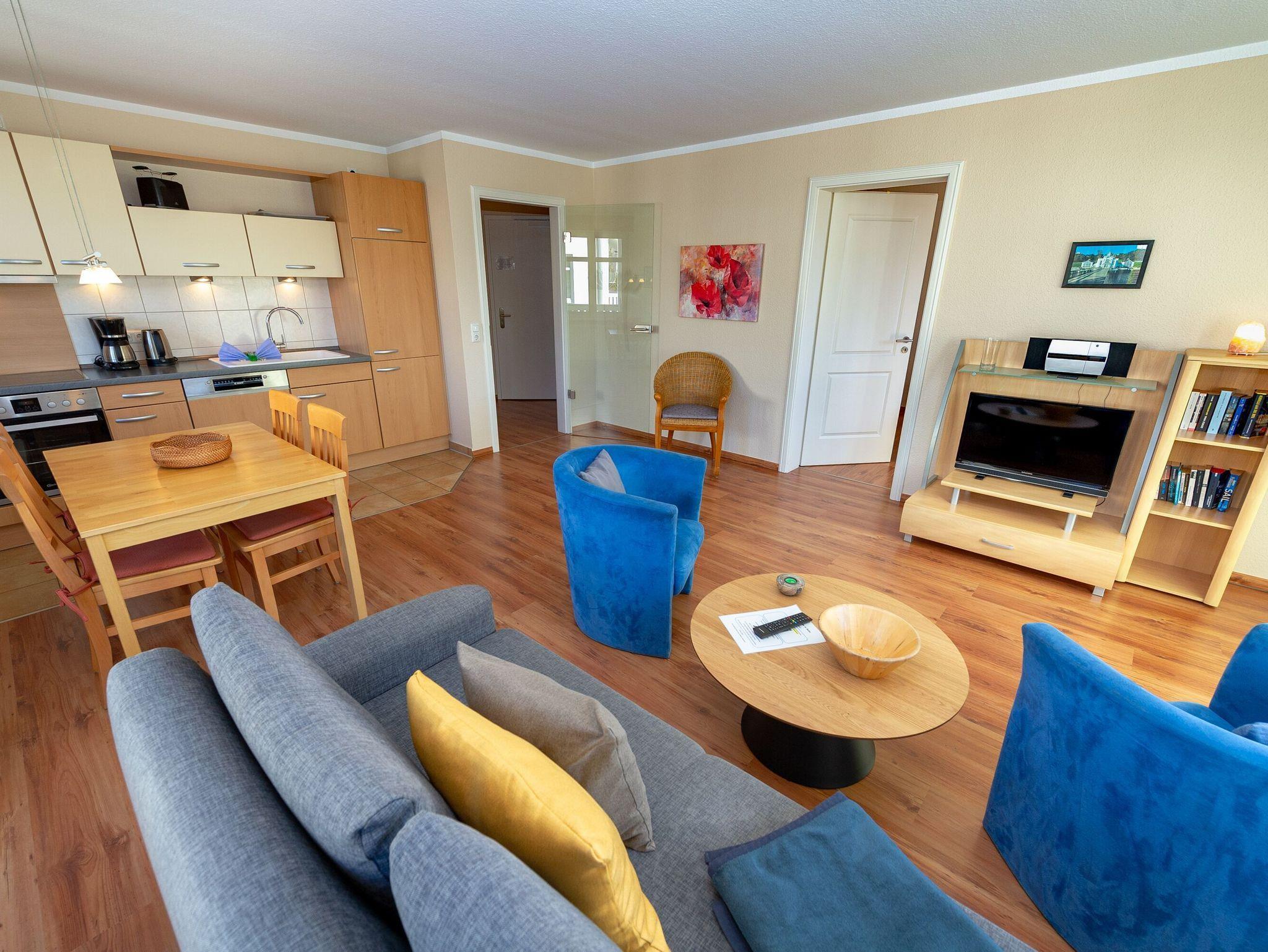 Der helle, freundliche Wohnraum ist mit einer bequemen Schlafcouch (die als Aufbettung für 2 Personen genutzt werden kann), zwei Sesseln, einem Korbsessel, einem Flachbild-TV, einer Mini-Stereoanlage mit CD-Player und einem Esstisch passend für die Personenanzahl in der Wohnung ausgestattet.