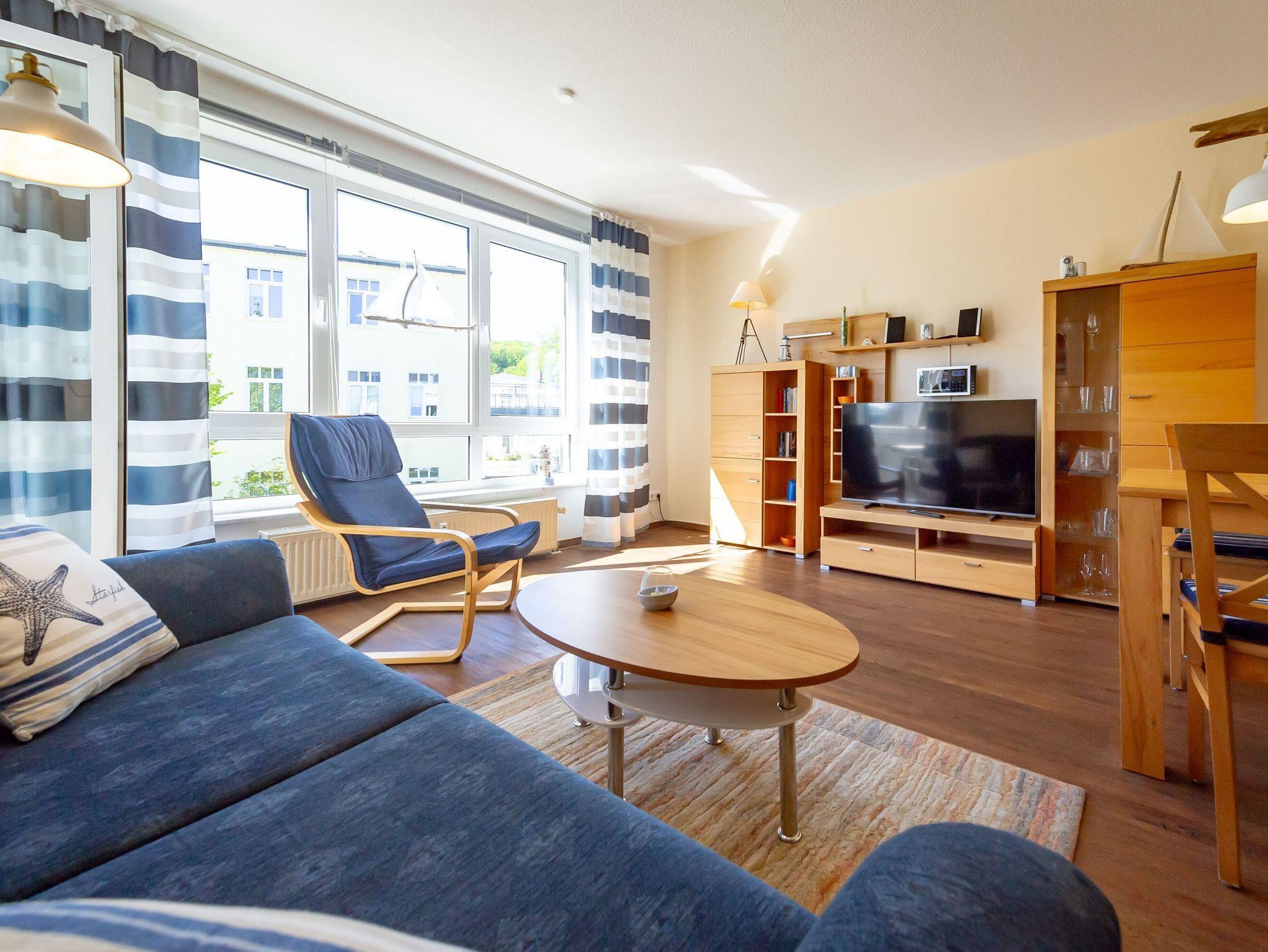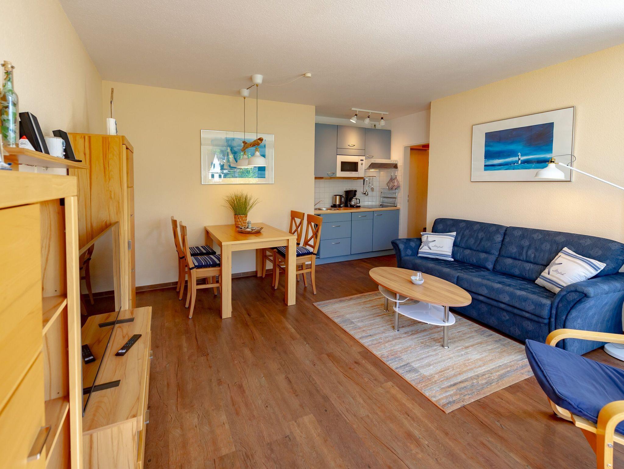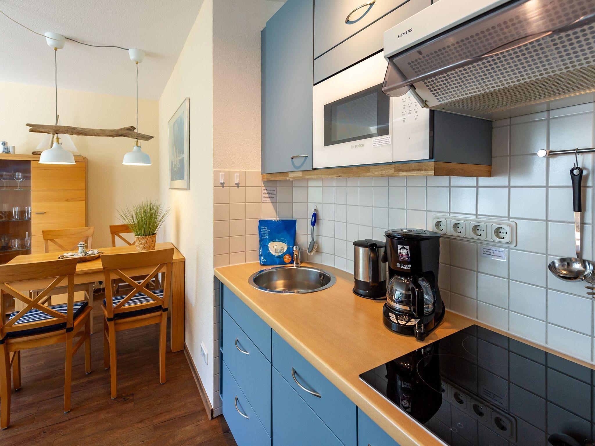 Vom Eingangsbereich aus gelangen Sie in das gemütlich eingerichte Wohnzimmer mit Fernseher, Radio, Couch, Esstisch sowie der integrierten Küchenzeile. Hier finden Sie einen kleinen Kühlschrank mit Gefrierfach, einen Ceranherd, einen Geschirrspüler, eine Mikrowelle, eine Kaffeemaschine, Toaster, Wasserkocher und diverses Kleininventar vor, so dass Sie sich bequem selbst bekochen können, wenn Sie nicht in einem der Lokale in der Nähe speisen. Für die Frühstücksbrötchen gibt es diverse Bäcker, die alle fußläufig zu erreichen sind.