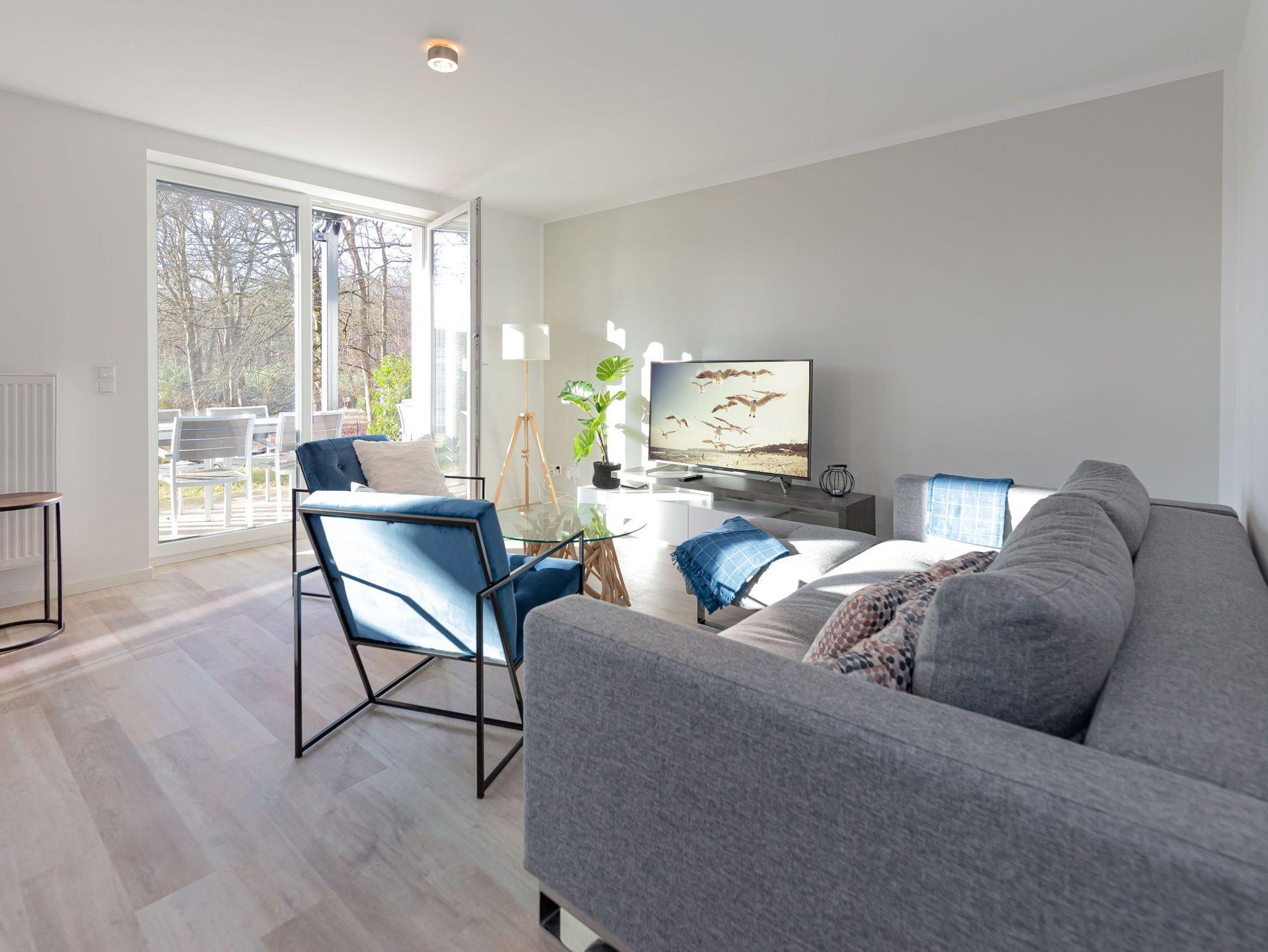 Über den Wohn- und Essbereich erreichen Sie bequem die sonnige Terrasse, welche mit hochwertigen Gartenmöbeln und einem Elektrogrill ausgestattet ist. Von hier aus haben Sie einen wunderbaren Blick in Rügens Natur.