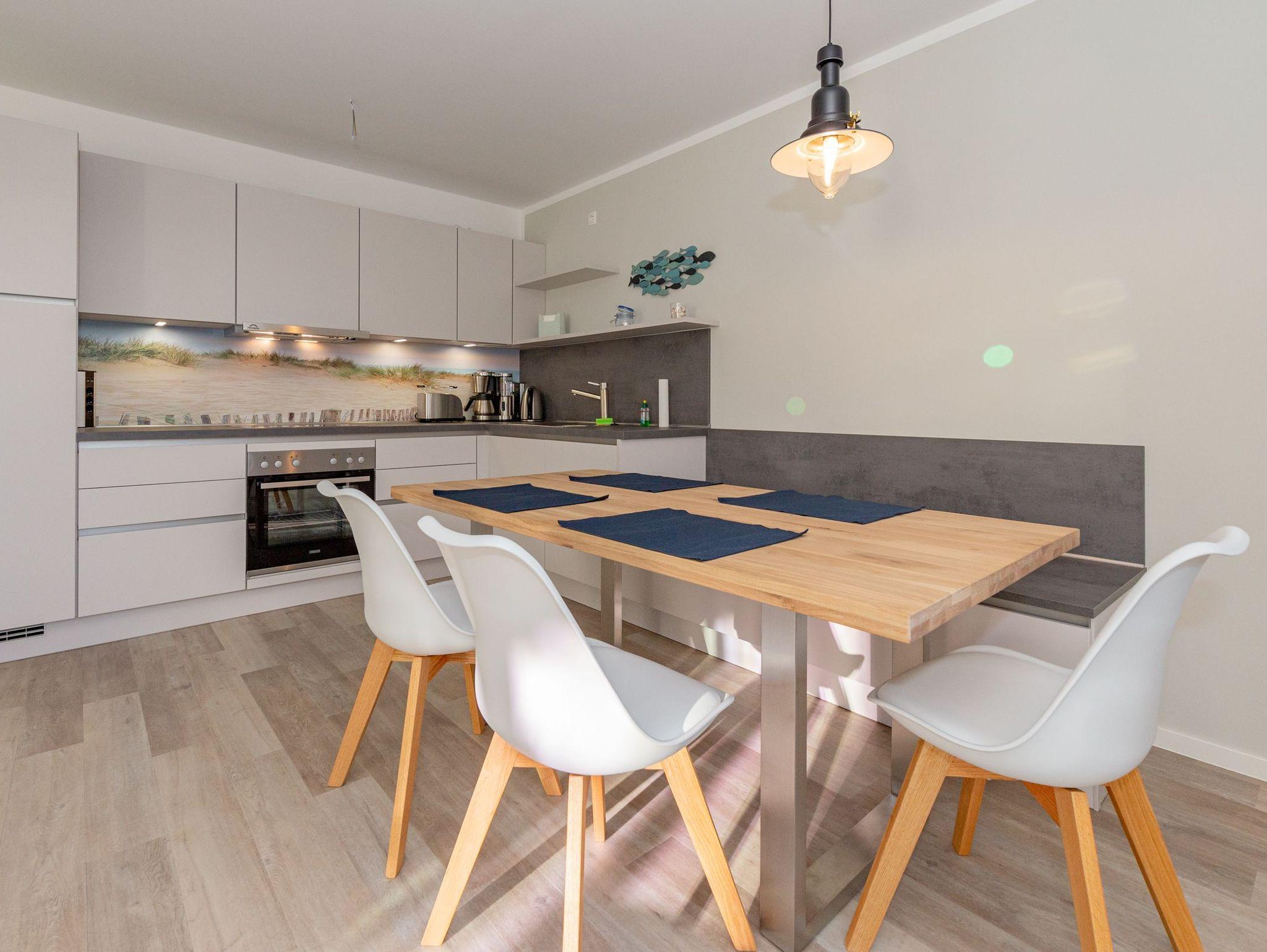 In der voll ausgestatteten Küche finden Sie alle nötigen Utensilien, die es für ein kulinarisches Abendessen benötigt; einen Kühlschrank, ein großes Kochfeld, einen Backofen, eine Mikrowelle und allerlei Küchenkleingeräte (Kaffeemaschine, Wasserkocher...). Der angrenzende Essbereich ist gemütlich gestaltet und bietet Platz für bis zu 6 Personen.