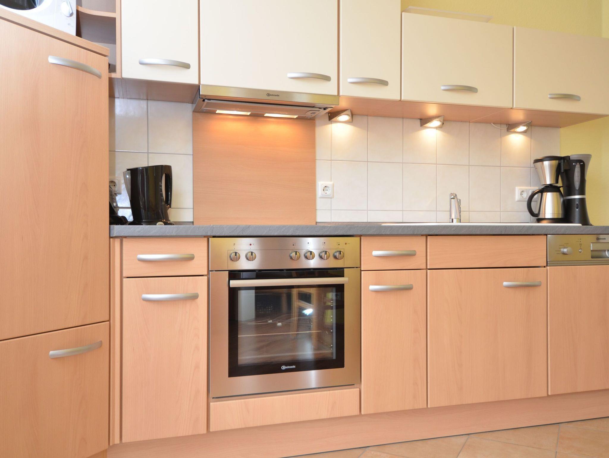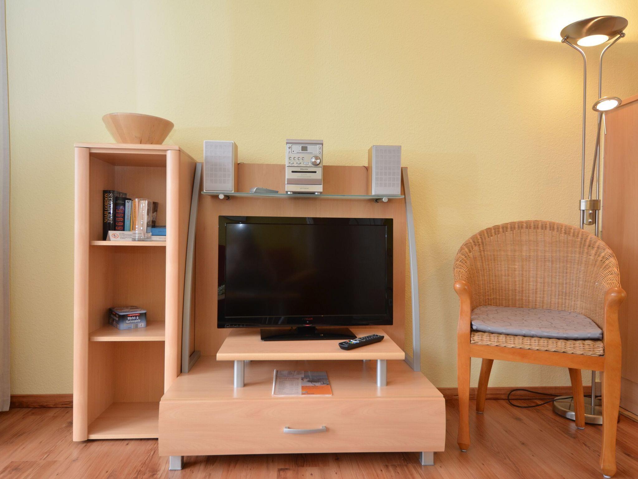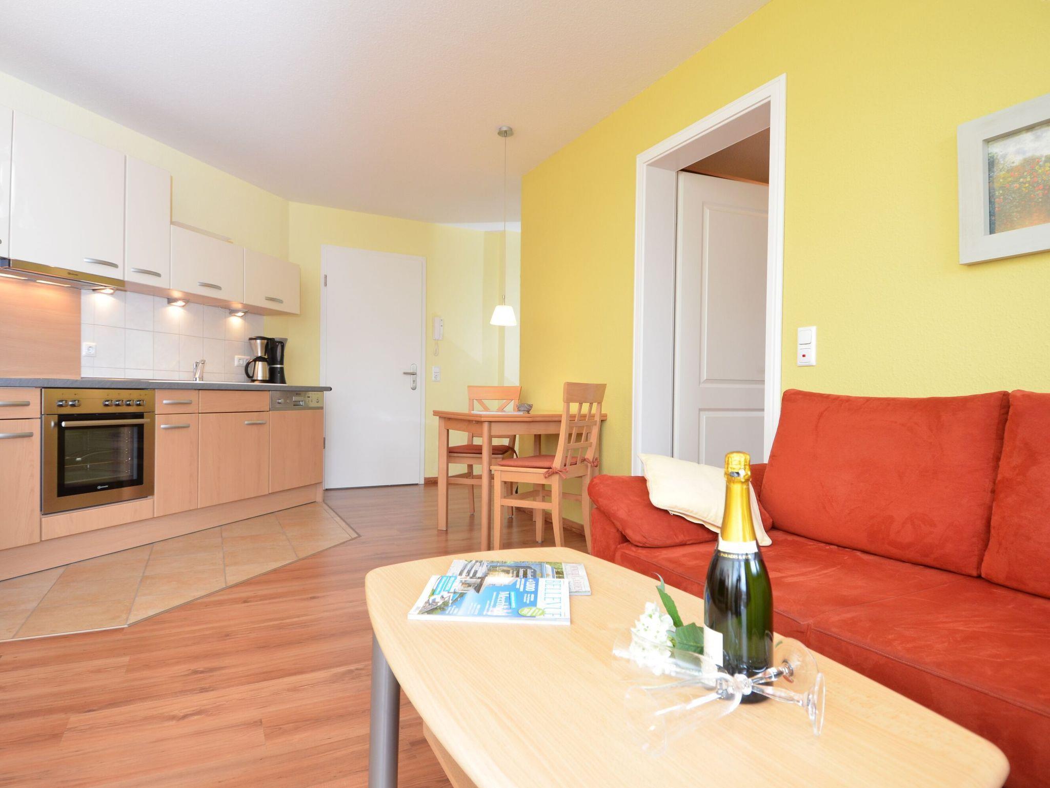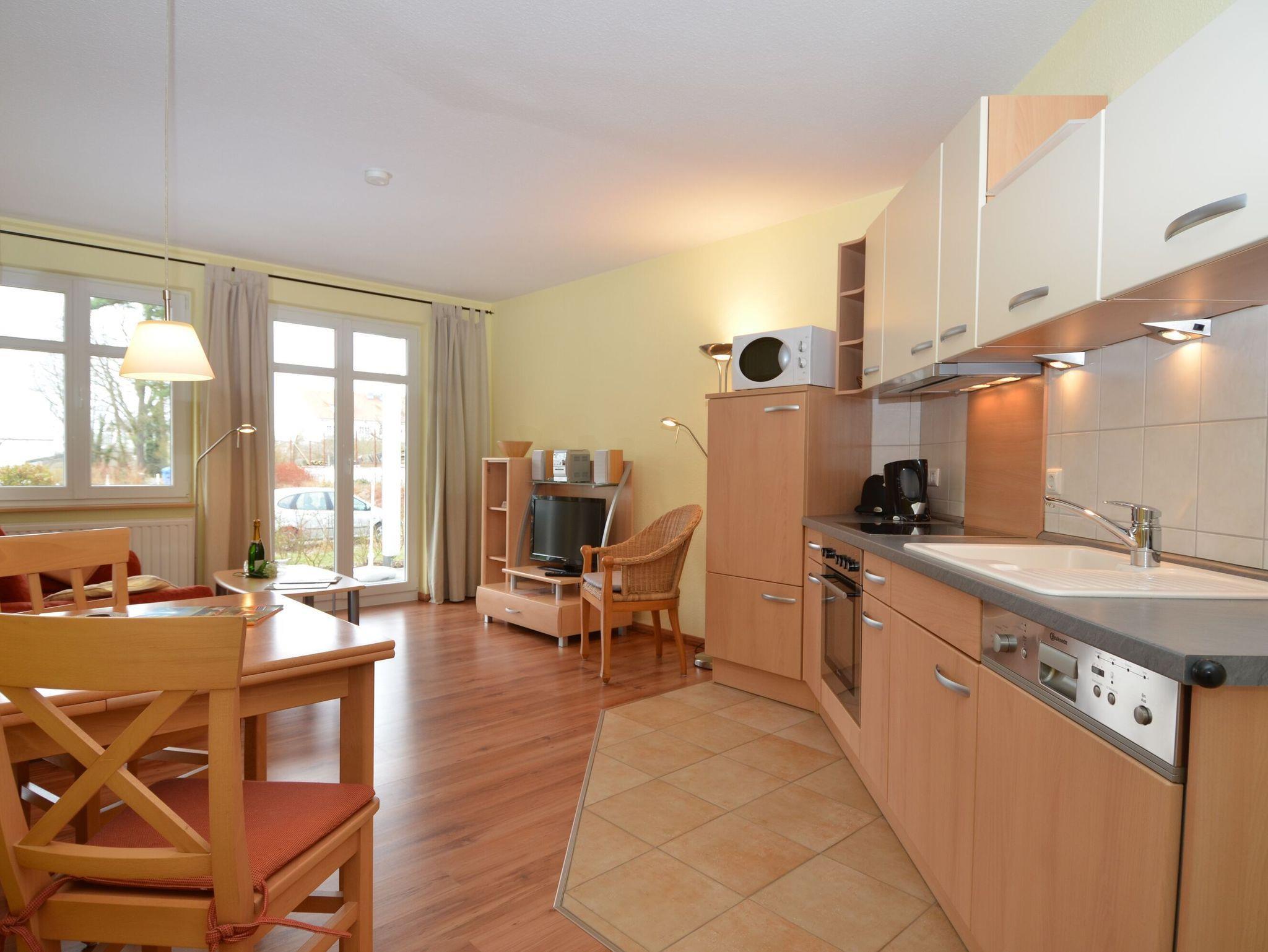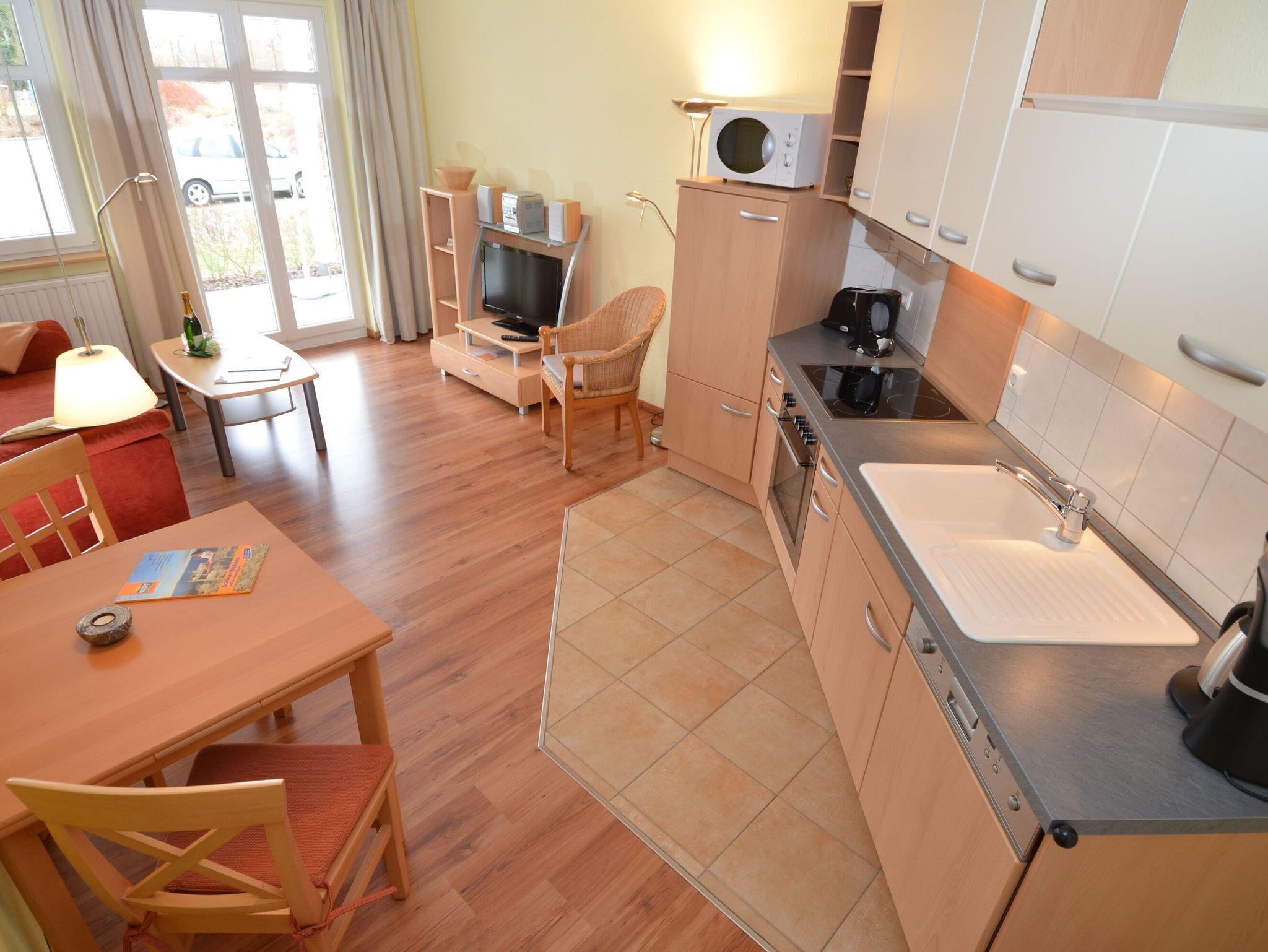 Der helle, freundliche Wohnraum ist mit einer bequemen Couch, einem Flachbild-TV, einer Mini-Stereoanlage mit CD-Player und einem Esstisch ausgestattet. Die harmonisch in den Wohnbereich integrierte Küchenzeile bietet u.a. einen Kühlschrank mit Gefrierfach, ein 4-Platten-Cerankochfeld, einen Backofen, eine Geschirrspülmaschine, eine Mikrowelle, Wasserkocher, Kaffeemaschine, Toaster und diverses Kleininventar, das die Küchenausstattung komplettiert.