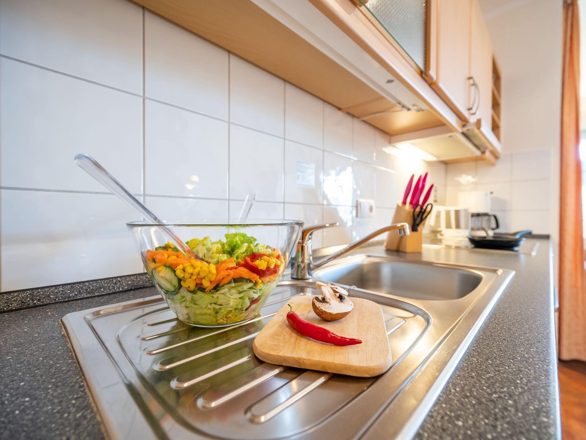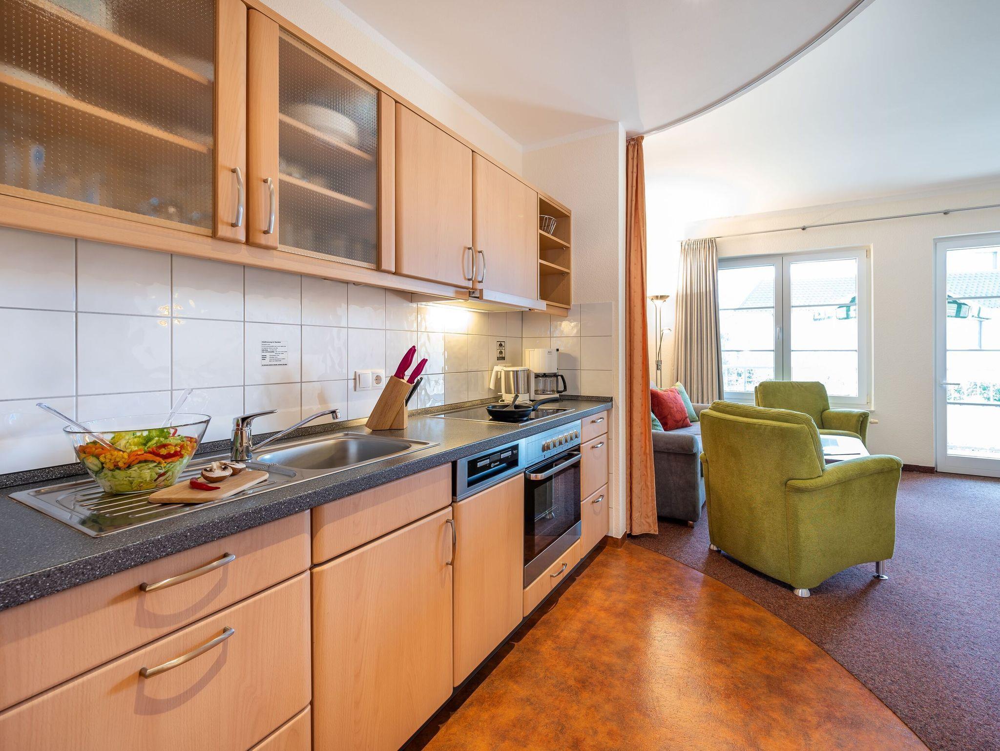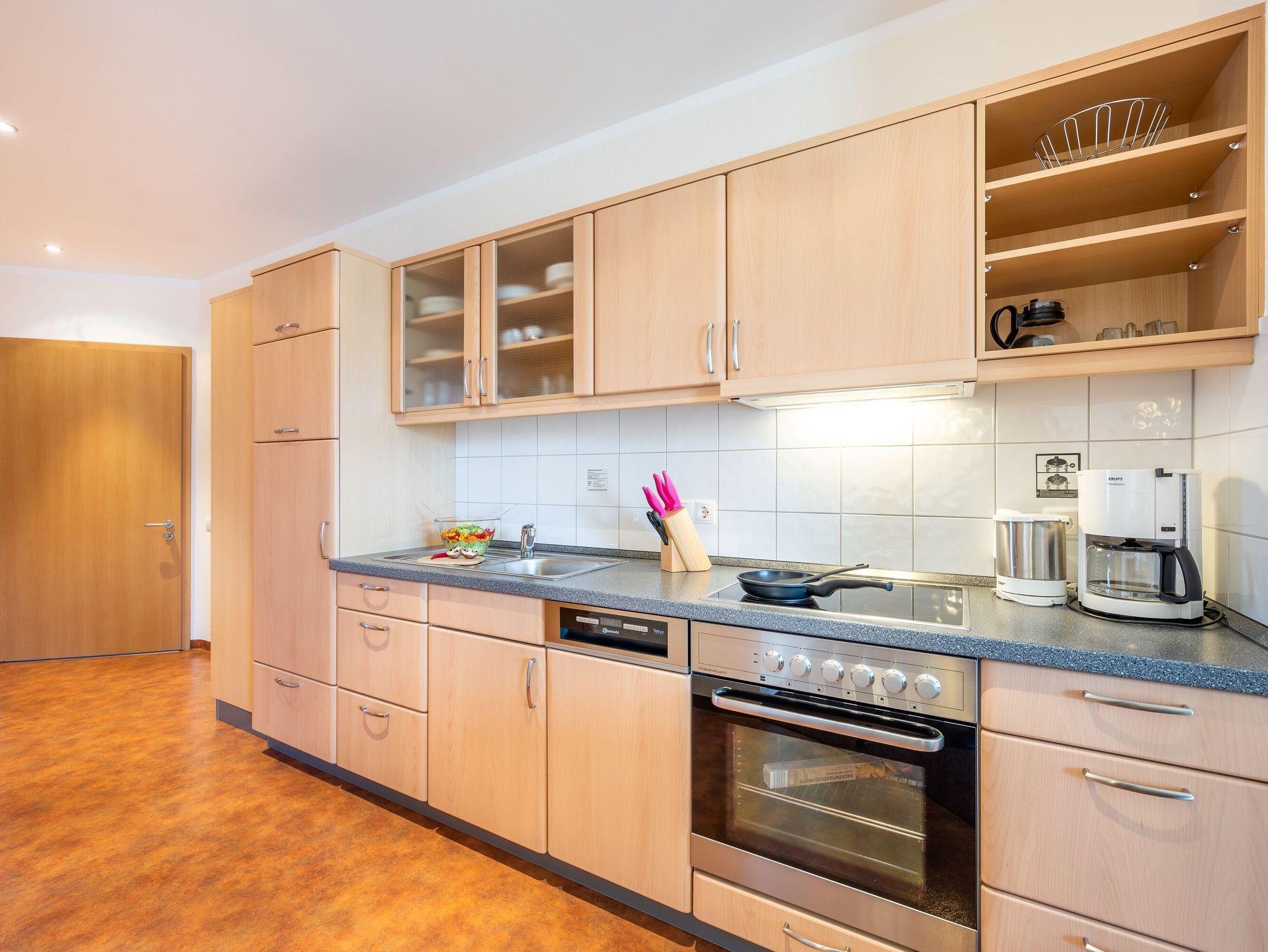 Die Küchenzeile ist mit einem Kühlschrank, einem Ceranfeld mit Backofen, einer Spülmaschine und einer Mikrowelle ausgestattet. Ebenso finden sich hier alle nötigen Küchenkleingeräte (Wasserkocher, Kaffeemaschine, Toaster..).