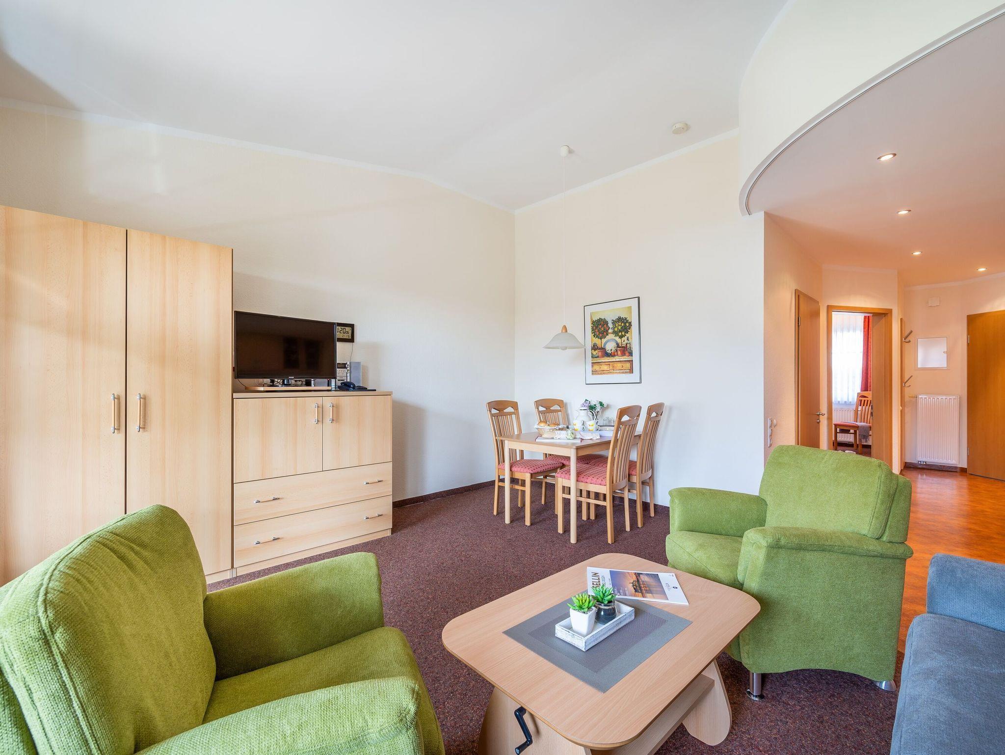 Das helle Wohnzimmer verfügt über eine Couchgarnitur, welche ebenso eine Aufbettung für 2 weitere Personen darstellt. Neben einem TV und einem kostenfreien WLAN-Zugang erreichen Sie von hier aus den sonnigen Balkon inkl. Balkonmöbel.