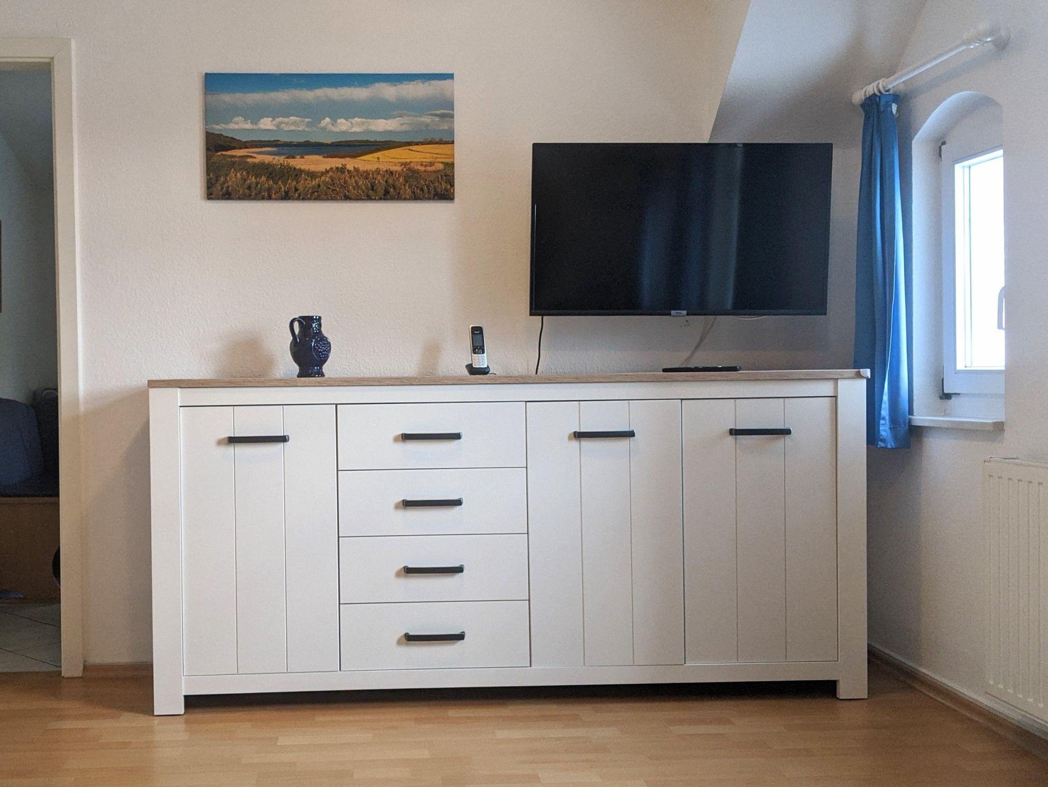 • Wohnzimmer mit Schrankbett, Couch sowie Flachbild-TV
