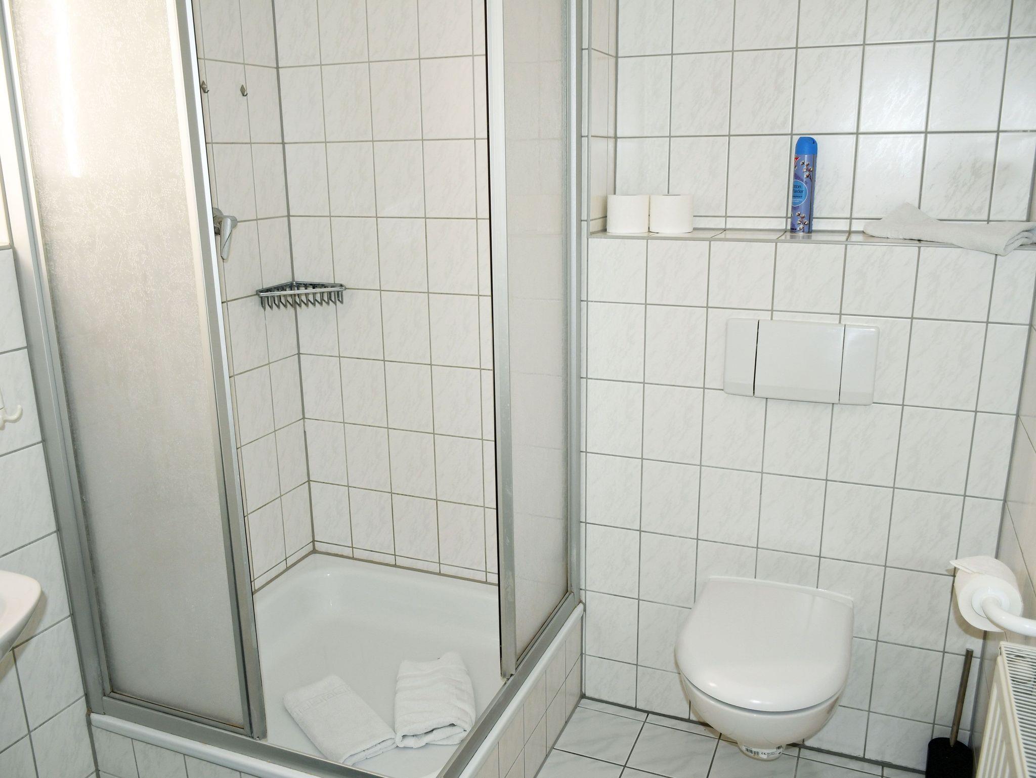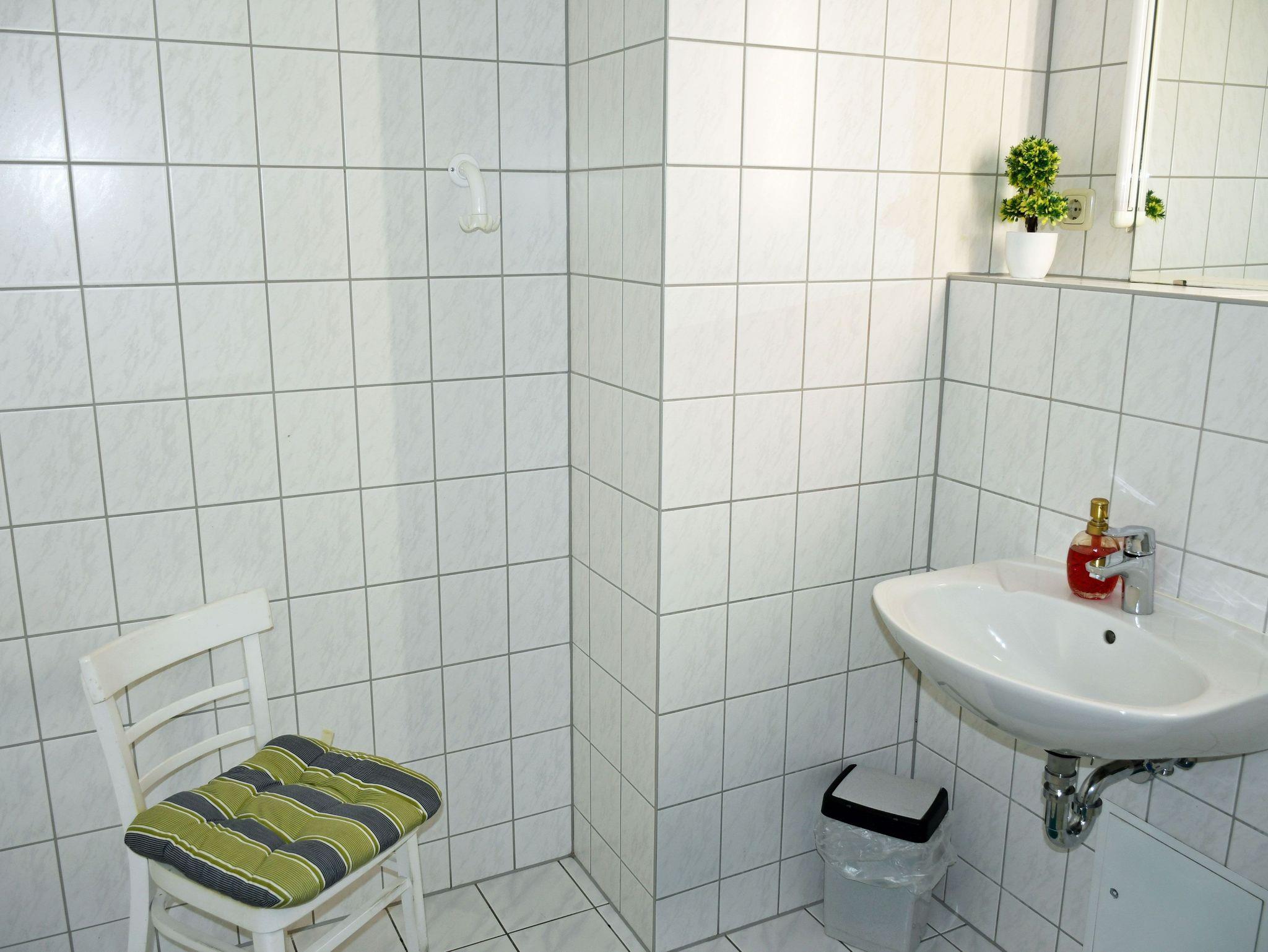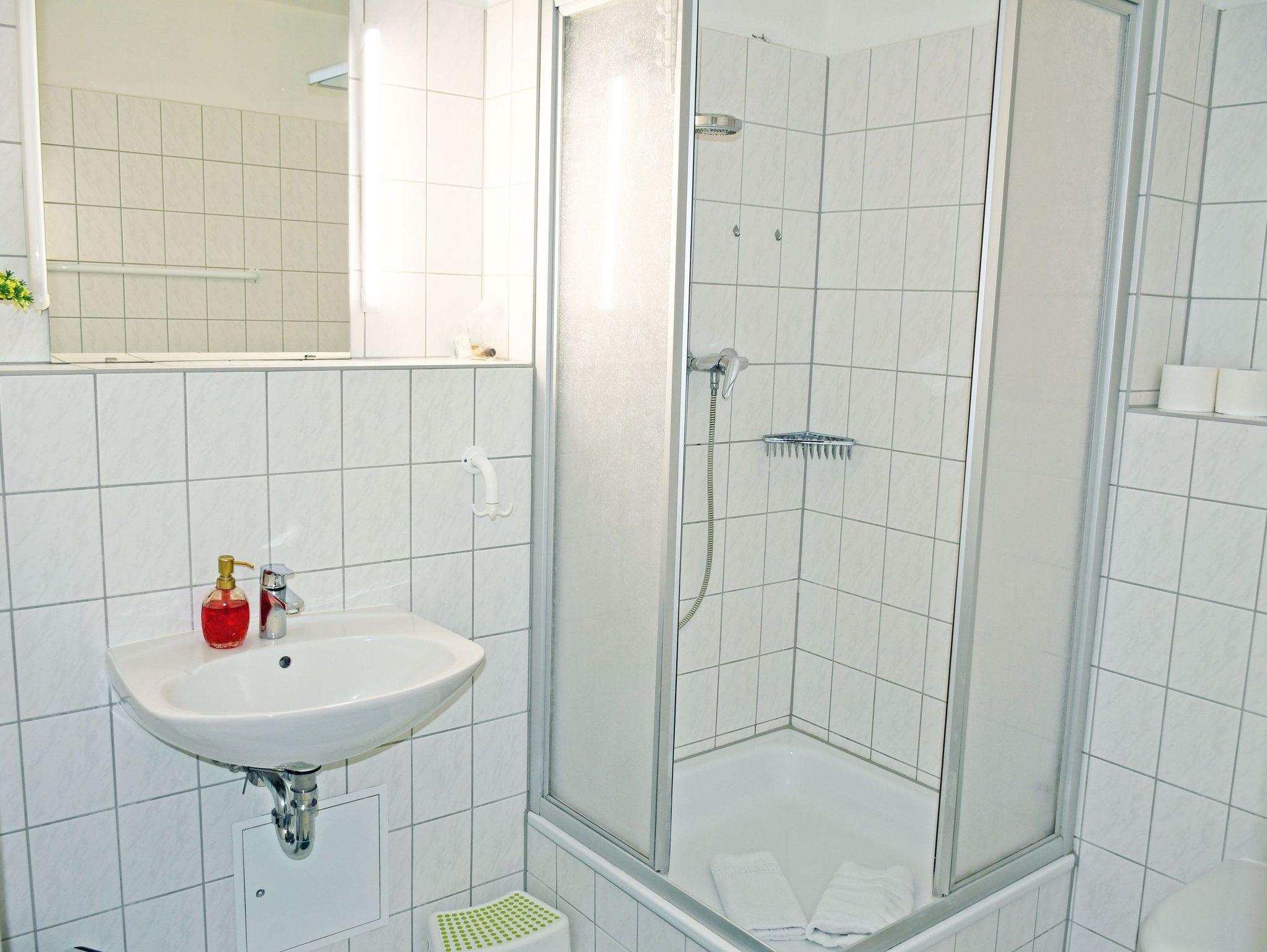 Das Bad ist mit Waschtisch, Dusche und WC ausgestattet.