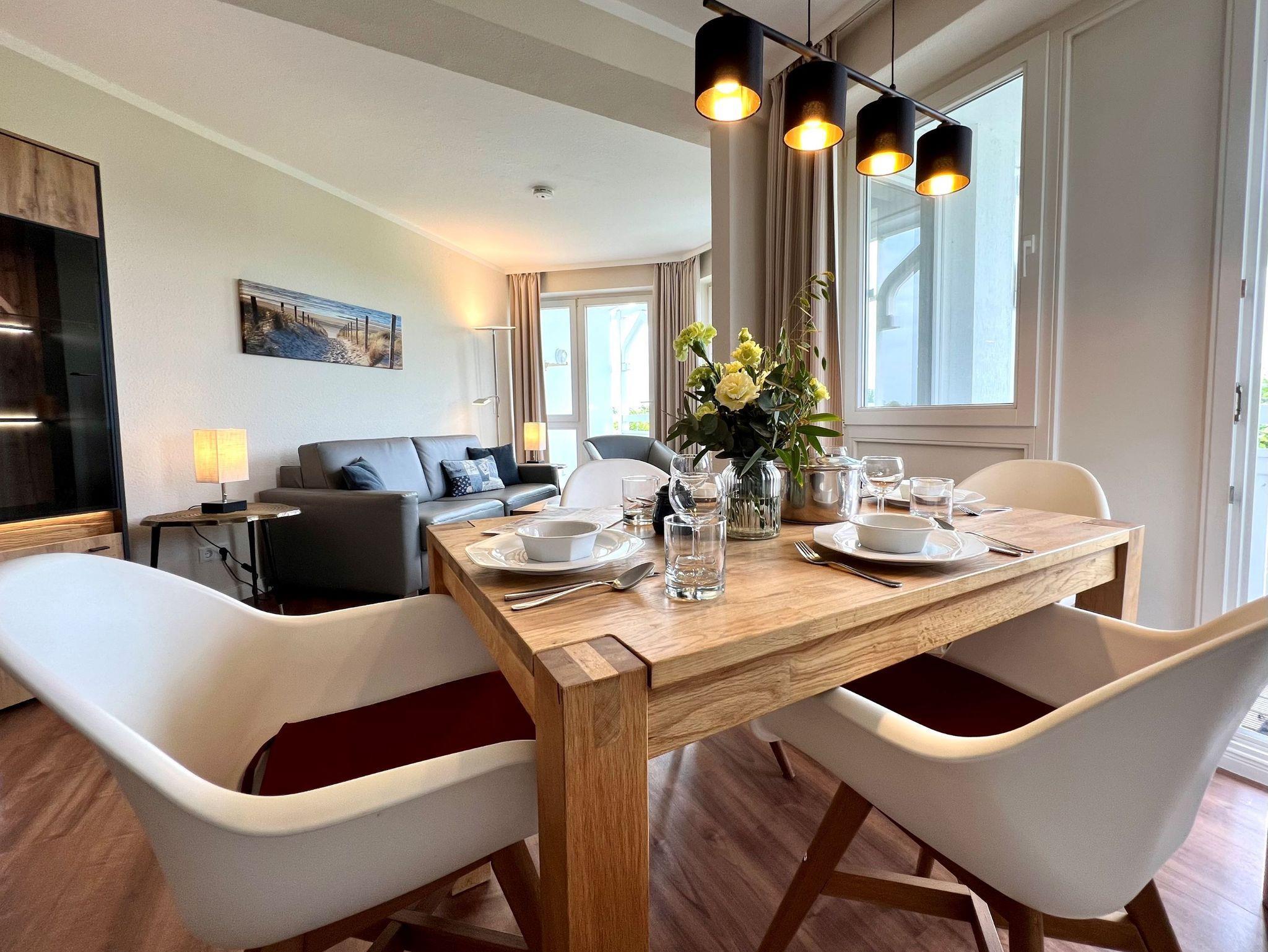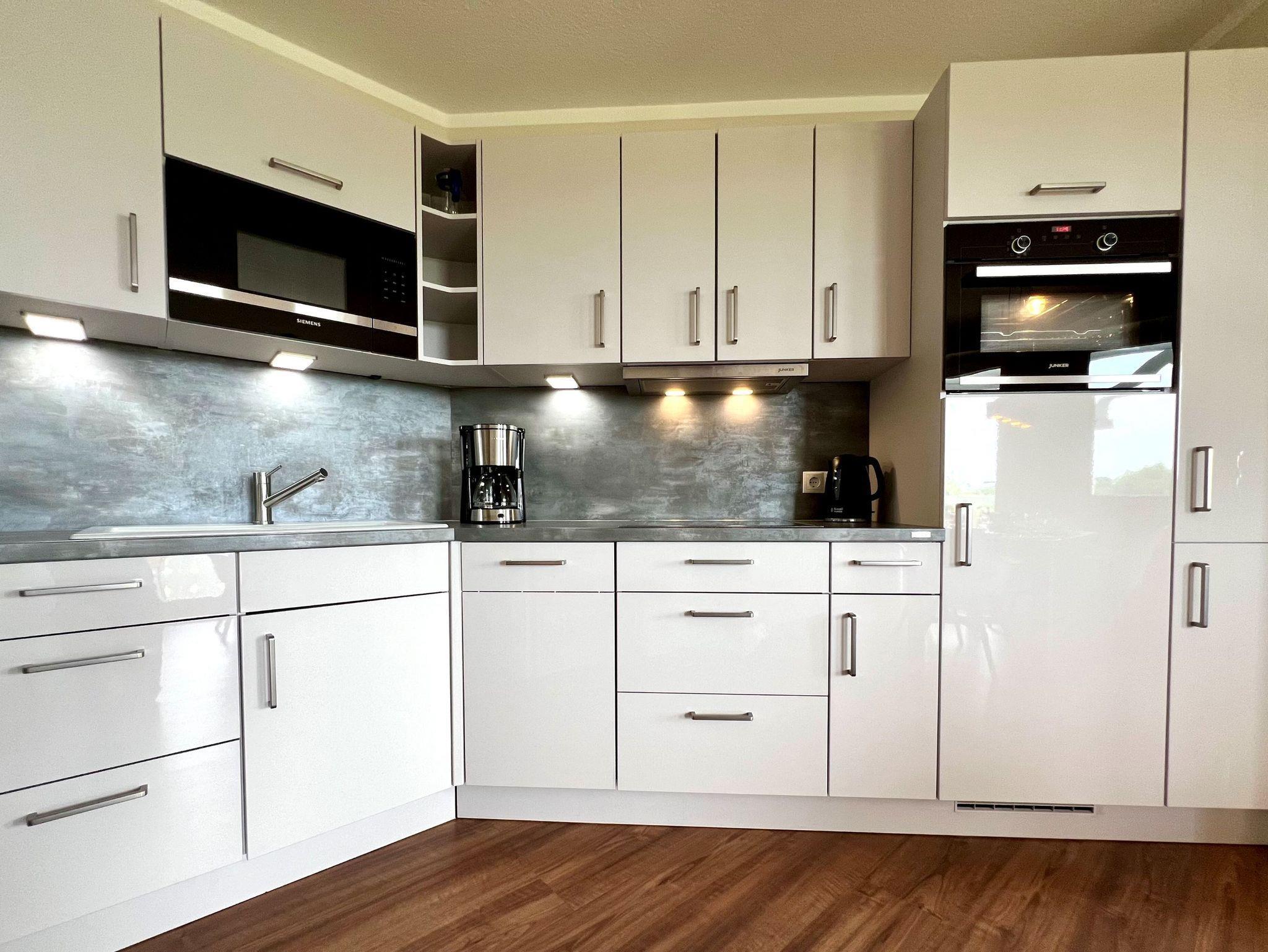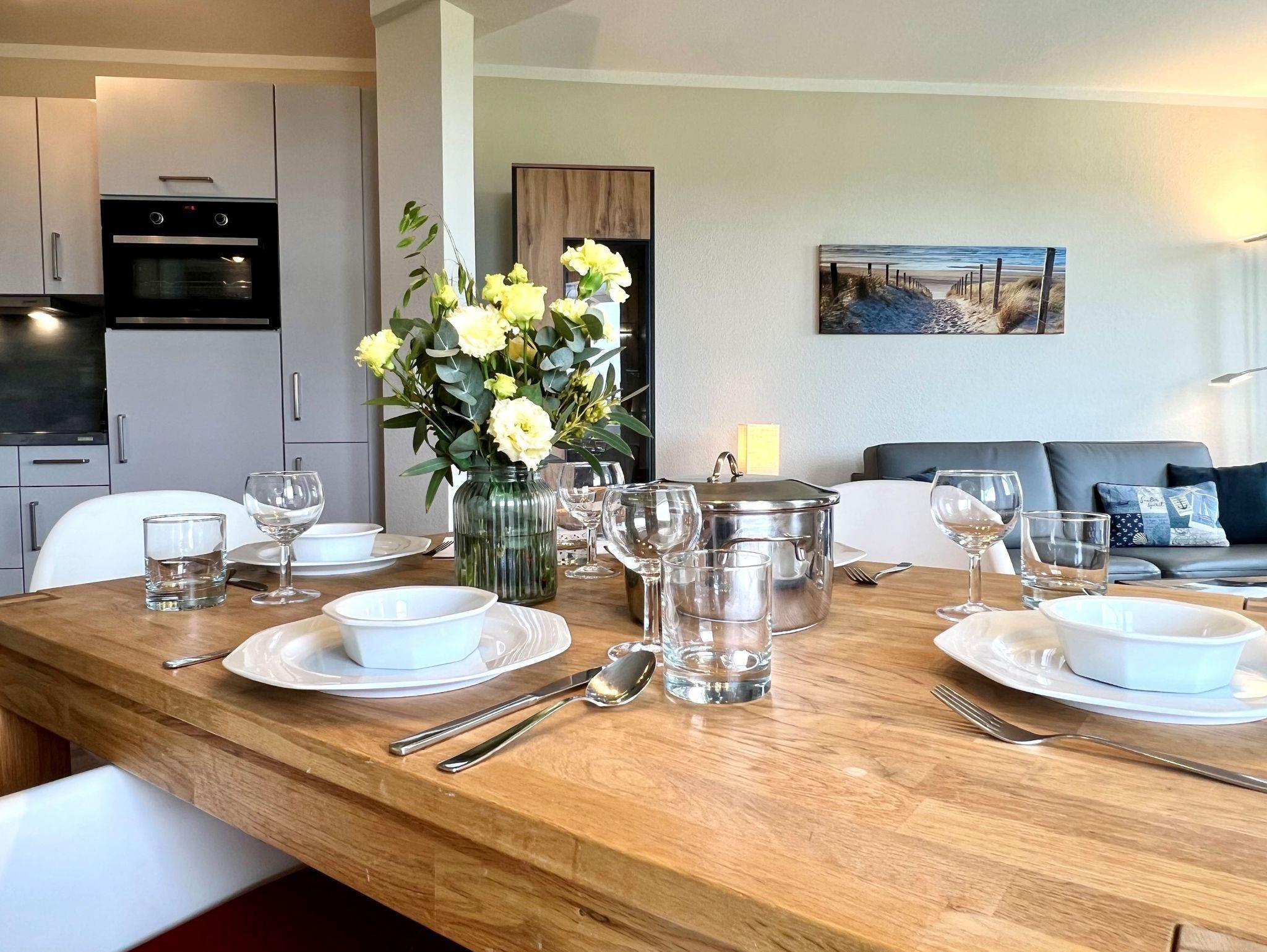 Ein Highlight der Fewo ist der großzügige Balkon, auf dem man gemütlich die Sonne genießen kann. Die offene Wohnküche bietet ausreichend Platz zum gemeinsamen Kochen und Essen.
