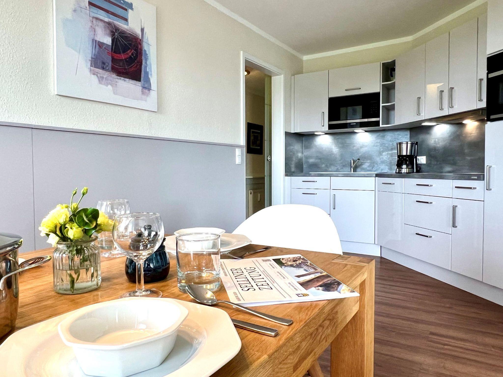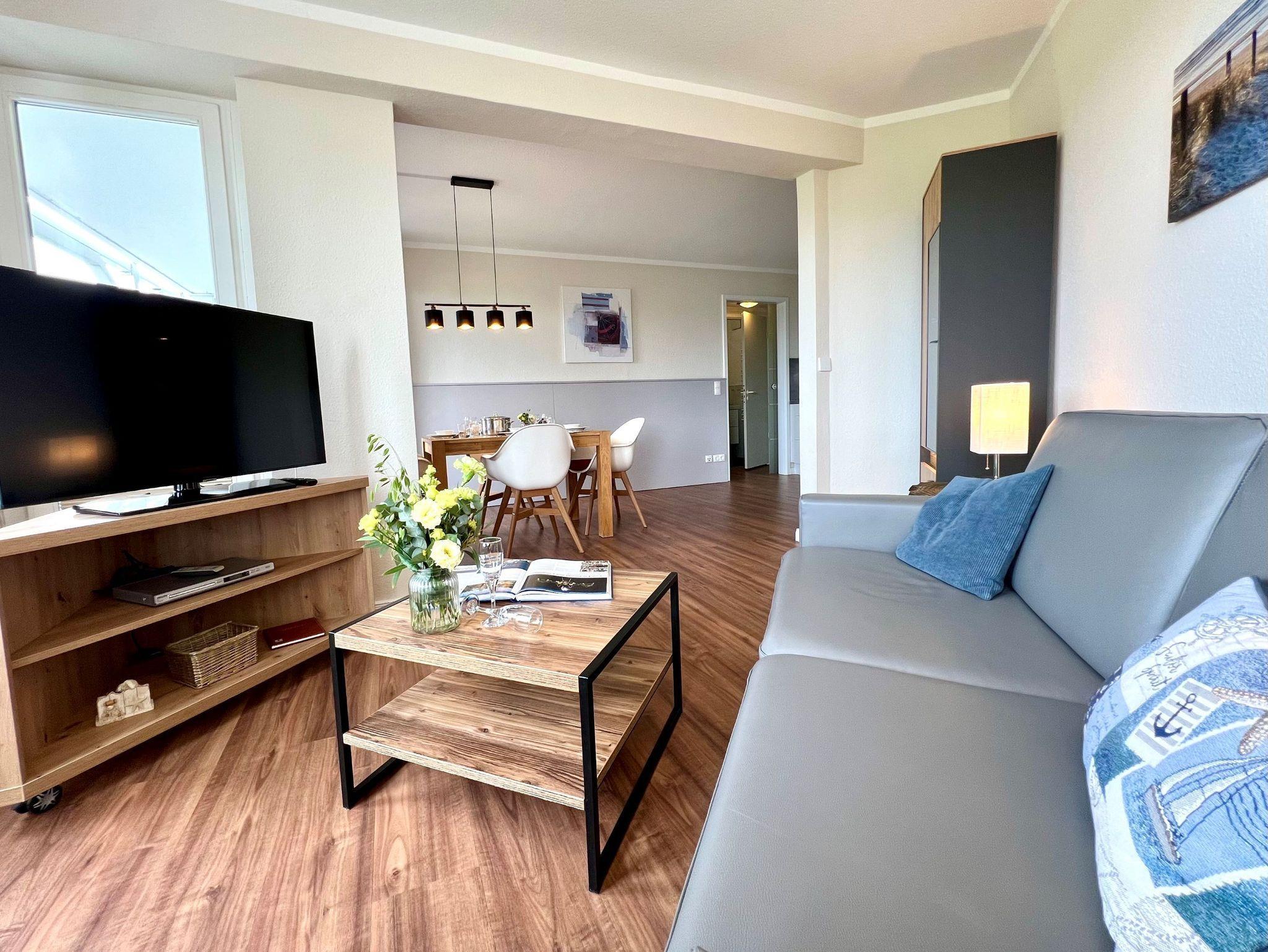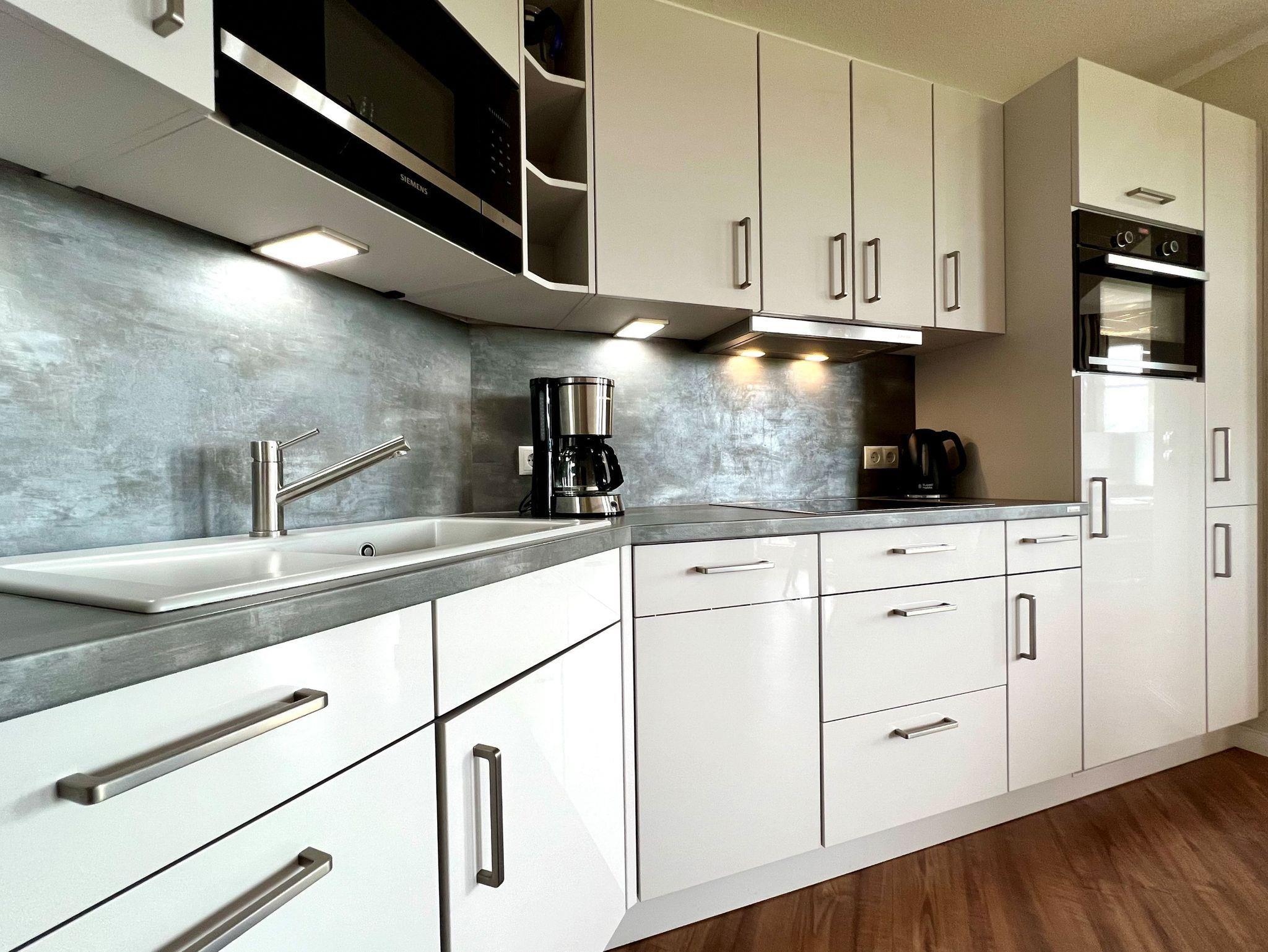 Ein Highlight der Fewo ist der großzügige Balkon, auf dem man gemütlich die Sonne genießen kann. Die offene Wohnküche bietet ausreichend Platz zum gemeinsamen Kochen und Essen.