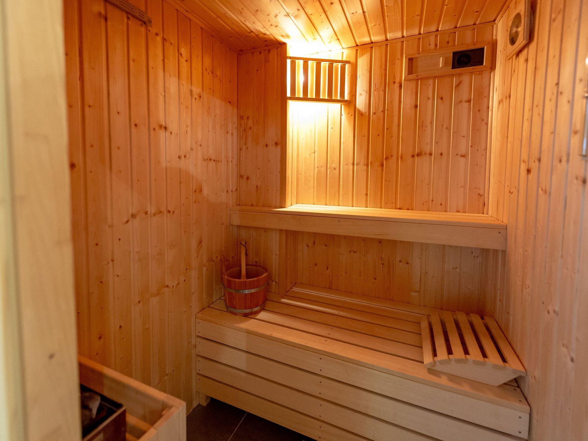 Im modernen Duschbad gibt es neben einer großzügigen, ebenerdigen Dusche eine Whirlwanne sowie eine Sauna mit elektrisch beheizbarem Saunaofen mit Steinen.