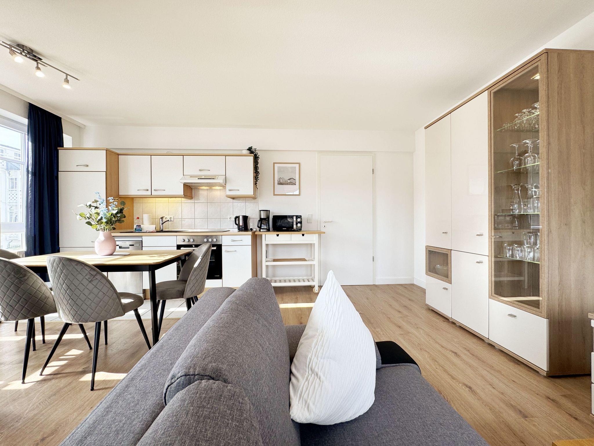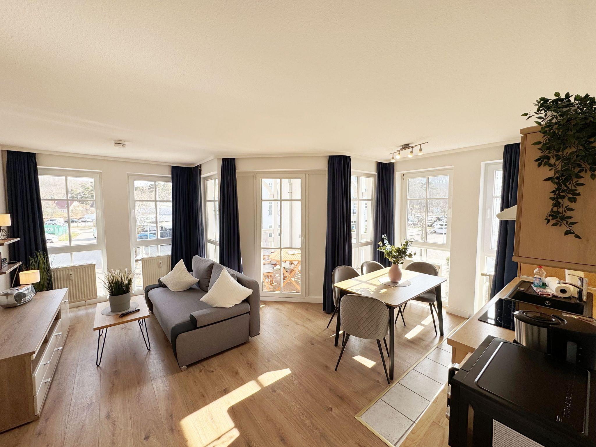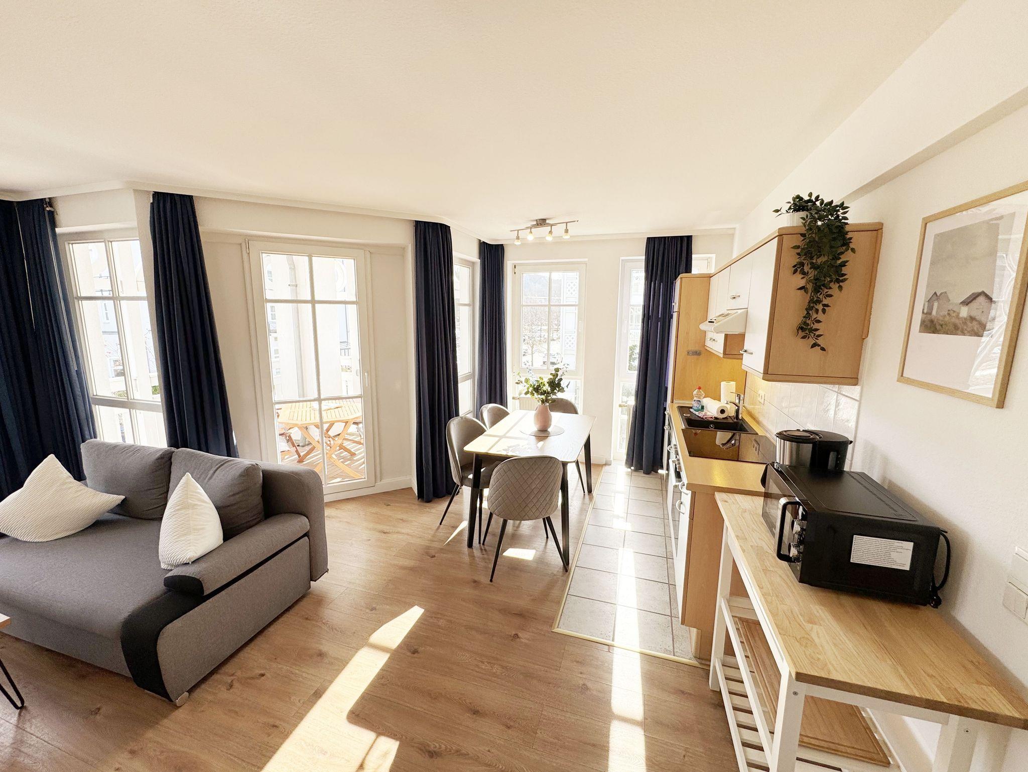 Die lichtdurchflutete Nichtraucherwohnung verfügt über eine hochwertige Ausstattung und bietet auf ca. 50 qm in der 1. Etage des Hauses ?Altensien? eine harmonische Kombination aus klassischem Design und zeitgemäßer Funktionalität. Sie ist für max. 2 bis 4 Personen ausgelegt und eignet sich somit ideal für Paare, kleine Familien oder Freunde, die einen entspannten Urlaub an der Ostsee verbringen möchten. Der Eingangsbereich empfängt Sie mit einer Garderobe welche ausreichend Platz für Ihre Kleidung bietet. Die durchdachte Raumaufteilung sorgt für eine angenehme und freie Atmosphäre. Der große Wohn-/Essbereich mit bodentiefen Fenstern sorgt für eine angenehme Atmosphäre und gewährt einen herrlichen Blick auf die Umgebung. Die gemütliche Couch mit Ausziehfunktion (1,50m x 1,95m) bietet Ihnen die Aufbettungsmöglichkeit für die 3. und 4. Person. Ein Couchtisch sowie eine beleuchtete Vitrine runden den Wohnbereich ab und bietet Platz für persönliche Akzente. Ein elegantes TV-Board mit einem Smart-TV, einem Radio und ein WLAN-Zugang (50 Mbits/5 Mbits) sorgt für eine praktische und optisch ansprechende Aufbewahrung Ihrer Unterhaltungselektronik. Der in Richtung Osten liegende Wohnbereich hat direkten Zugang zum überdachten und bestuhlten Balkon, welcher besonders in den Morgenstunden mit Sonnenwärme zu einem entspannten Frühstück einlädt. Die offene, angrenzende und komplett eingerichtete Küchenzeile lässt keine Wünsche offen. Sie ist ausgestattet mit einem Kühlschrank mit Eisfach, Backofen, Spülmaschine, Cerankochfeld, Dunstabzug, Mikrowelle, Kaffeemaschine, Nespresso-Maschine, Wasserkocher und Toaster. Diverse Küchenutensilien sind vorhanden, sodass Sie Ihre Mahlzeiten bequem zubereiten können. Das Schlafzimmer bietet Ihnen ein komfortables Doppelbett (1,80 m x 2,00 m), verstellbare Lattenroste, Nachttischablagen mit Beleuchtung und einen großzügigen Kleiderschrank. Nach einem Tag am Meer finden Sie hier einen erholsamen Rückzugsort. Das frisch ausgestattete Tageslichtbad ist mit einer bodengleichen Dusche, einem Waschplatz, einem Fön und einem WC ausgestattet. Die Ferienwohnung ist komplett mit pflegeleichten Böden ausgestattet, die für eine angenehme Wohlfühlatmosphäre sorgen. Ein Haustier dürfen Sie gerne gegen eine Gebühr mitbringen. Für Ihren PKW steht Ihnen in der Tiefgarage der Platz Nr. 82 zur Verfügung (Einfahrtshöhe max. 1,80 m). Im Gemeinschaftskeller des Hauses können Sie Ihre geliehenen oder mitgebrachten Fahrräder unterstellen. Die Erstausstattung eines Wäschepaketes (komplette Bettwäsche, 1 Duschhandtuch, 2 kleine Handtücher) können Sie bis 14 Tage vor Anreise gegen einen Aufpreis dazu buchen oder durch eigenes Ergänzen. Ab 2 gebuchten Paketen erhalten Sie einmalig 1 Geschirrhandtuch und 1 Duschvorleger hinzu. Wir freuen uns darauf, Sie als Gast in unserer Wohnung willkommen zu heißen.