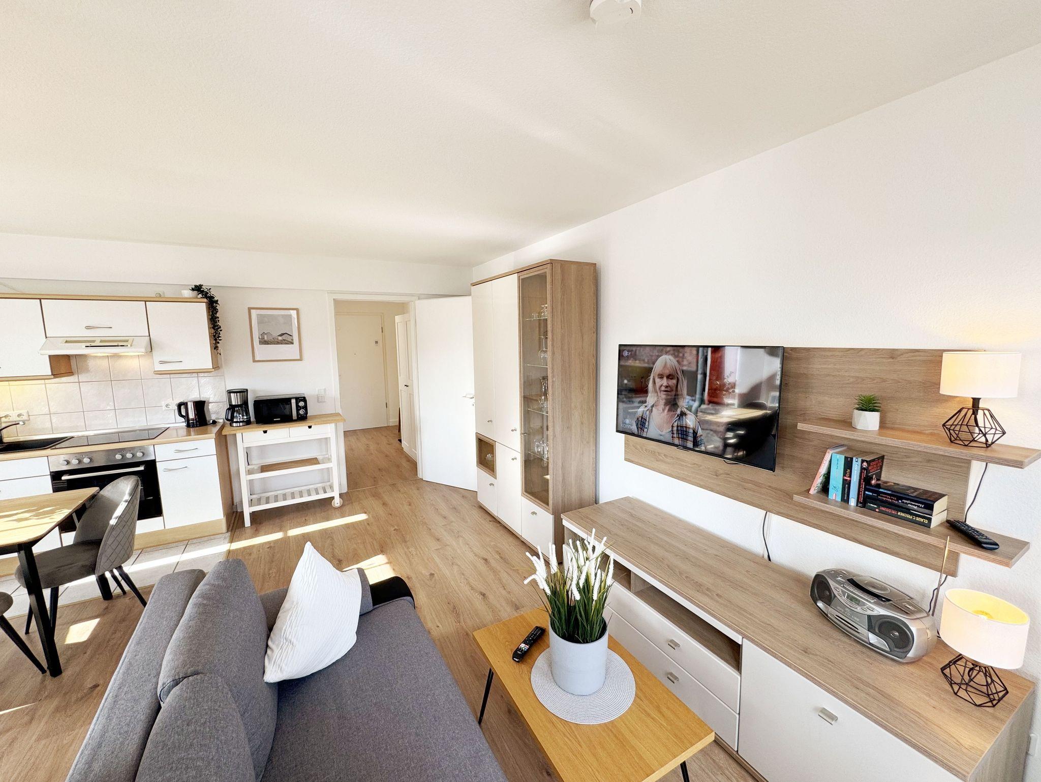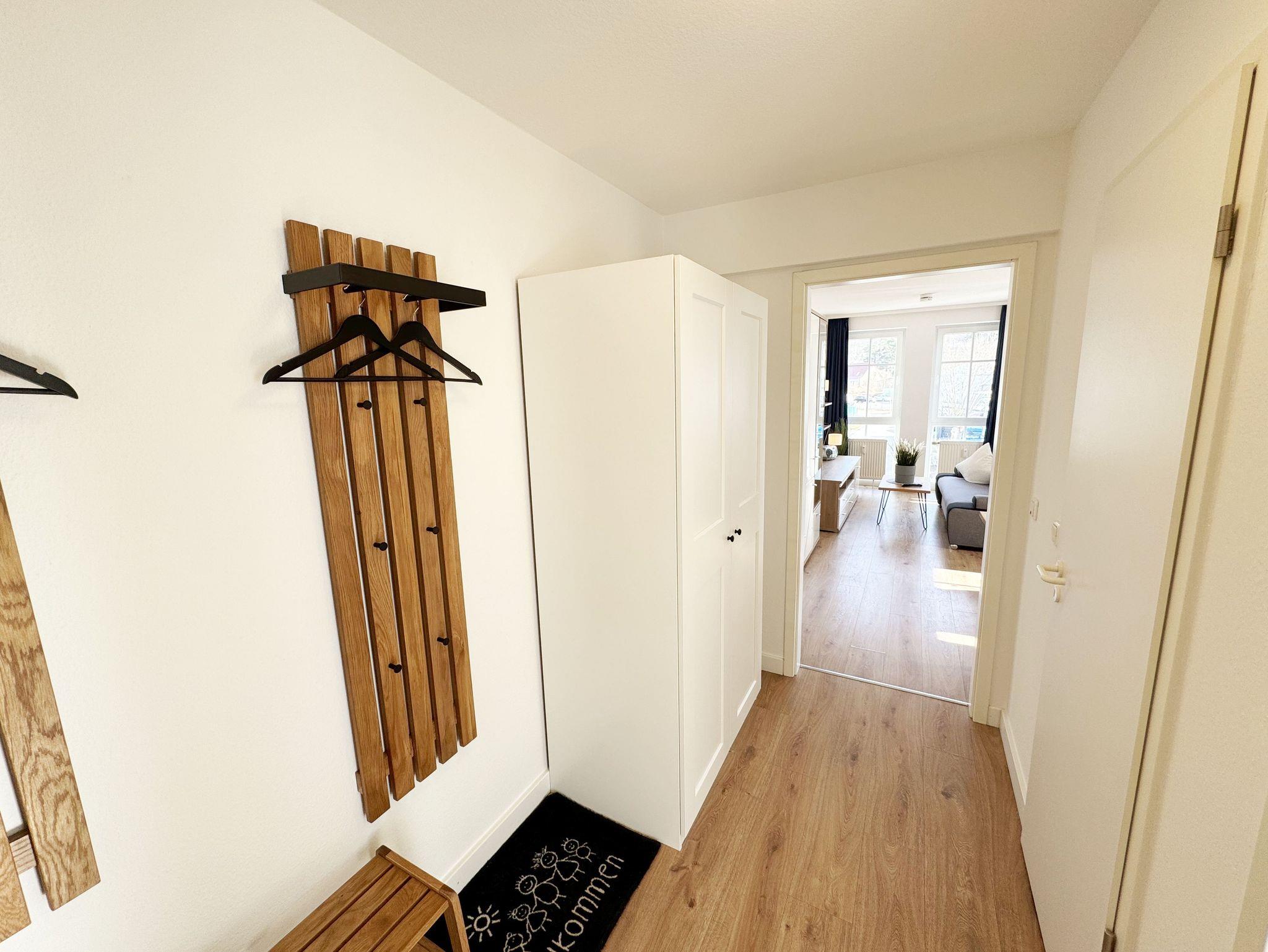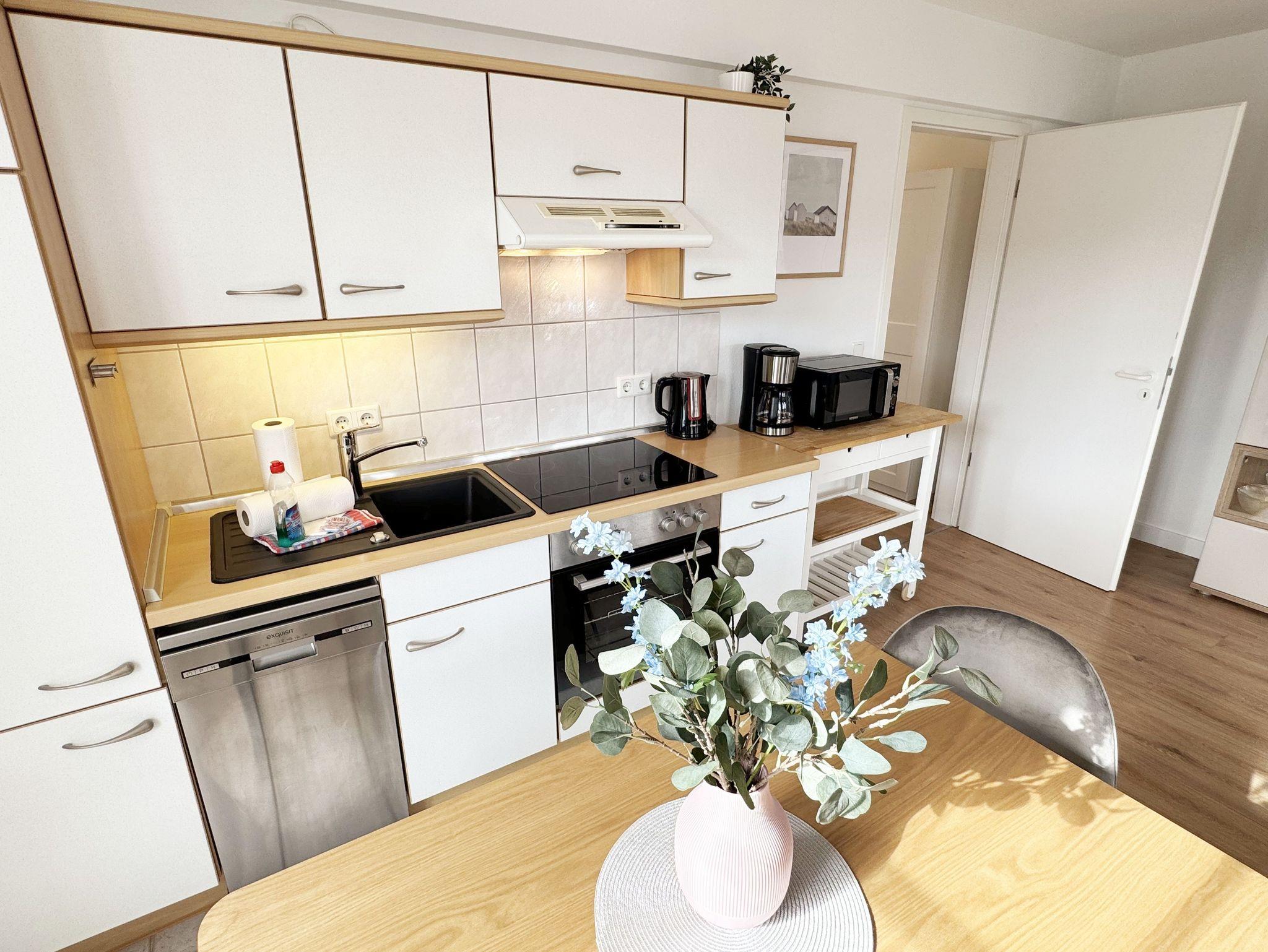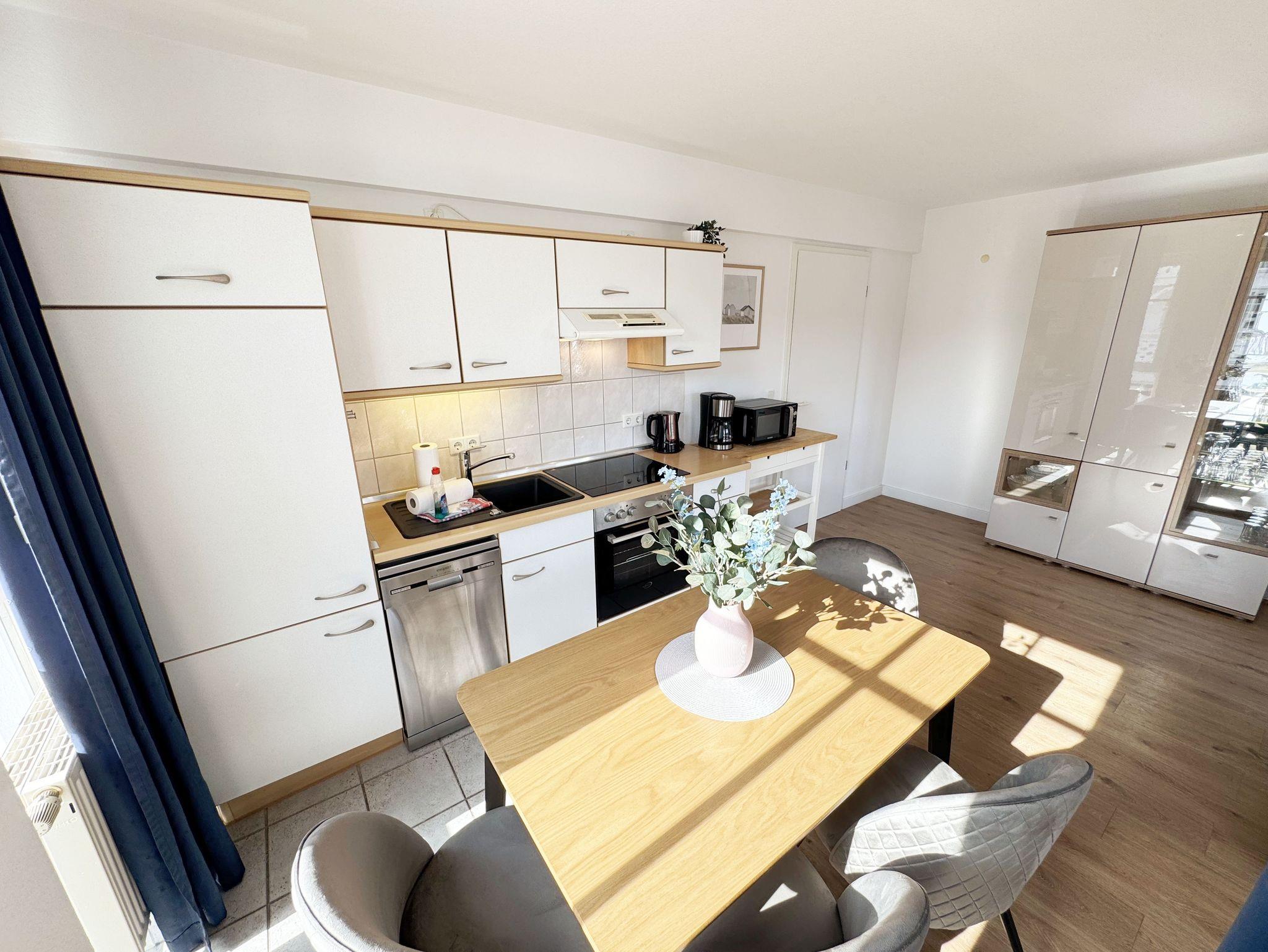 Die lichtdurchflutete Nichtraucherwohnung verfügt über eine hochwertige Ausstattung und bietet auf ca. 50 qm in der 1. Etage des Hauses ?Altensien? eine harmonische Kombination aus klassischem Design und zeitgemäßer Funktionalität. Sie ist für max. 2 bis 4 Personen ausgelegt und eignet sich somit ideal für Paare, kleine Familien oder Freunde, die einen entspannten Urlaub an der Ostsee verbringen möchten. Der Eingangsbereich empfängt Sie mit einer Garderobe welche ausreichend Platz für Ihre Kleidung bietet. Die durchdachte Raumaufteilung sorgt für eine angenehme und freie Atmosphäre. Der große Wohn-/Essbereich mit bodentiefen Fenstern sorgt für eine angenehme Atmosphäre und gewährt einen herrlichen Blick auf die Umgebung. Die gemütliche Couch mit Ausziehfunktion (1,50m x 1,95m) bietet Ihnen die Aufbettungsmöglichkeit für die 3. und 4. Person. Ein Couchtisch sowie eine beleuchtete Vitrine runden den Wohnbereich ab und bietet Platz für persönliche Akzente. Ein elegantes TV-Board mit einem Smart-TV, einem Radio und ein WLAN-Zugang (50 Mbits/5 Mbits) sorgt für eine praktische und optisch ansprechende Aufbewahrung Ihrer Unterhaltungselektronik. Der in Richtung Osten liegende Wohnbereich hat direkten Zugang zum überdachten und bestuhlten Balkon, welcher besonders in den Morgenstunden mit Sonnenwärme zu einem entspannten Frühstück einlädt. Die offene, angrenzende und komplett eingerichtete Küchenzeile lässt keine Wünsche offen. Sie ist ausgestattet mit einem Kühlschrank mit Eisfach, Backofen, Spülmaschine, Cerankochfeld, Dunstabzug, Mikrowelle, Kaffeemaschine, Nespresso-Maschine, Wasserkocher und Toaster. Diverse Küchenutensilien sind vorhanden, sodass Sie Ihre Mahlzeiten bequem zubereiten können. Das Schlafzimmer bietet Ihnen ein komfortables Doppelbett (1,80 m x 2,00 m), verstellbare Lattenroste, Nachttischablagen mit Beleuchtung und einen großzügigen Kleiderschrank. Nach einem Tag am Meer finden Sie hier einen erholsamen Rückzugsort. Das frisch ausgestattete Tageslichtbad ist mit einer bodengleichen Dusche, einem Waschplatz, einem Fön und einem WC ausgestattet. Die Ferienwohnung ist komplett mit pflegeleichten Böden ausgestattet, die für eine angenehme Wohlfühlatmosphäre sorgen. Ein Haustier dürfen Sie gerne gegen eine Gebühr mitbringen. Für Ihren PKW steht Ihnen in der Tiefgarage der Platz Nr. 82 zur Verfügung (Einfahrtshöhe max. 1,80 m). Im Gemeinschaftskeller des Hauses können Sie Ihre geliehenen oder mitgebrachten Fahrräder unterstellen. Die Erstausstattung eines Wäschepaketes (komplette Bettwäsche, 1 Duschhandtuch, 2 kleine Handtücher) können Sie bis 14 Tage vor Anreise gegen einen Aufpreis dazu buchen oder durch eigenes Ergänzen. Ab 2 gebuchten Paketen erhalten Sie einmalig 1 Geschirrhandtuch und 1 Duschvorleger hinzu. Wir freuen uns darauf, Sie als Gast in unserer Wohnung willkommen zu heißen.
