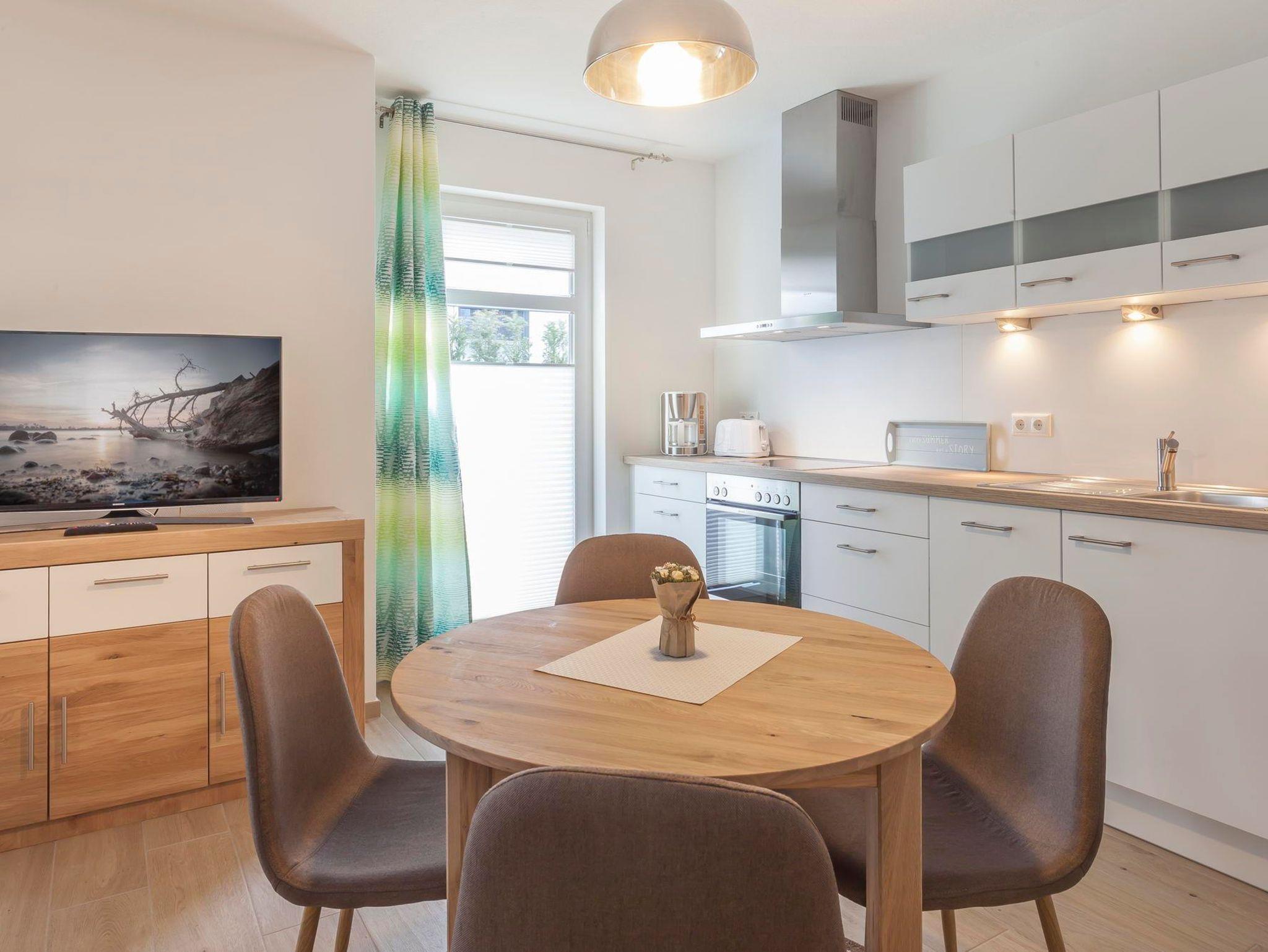 Modern und wertig kommt auch das Wohn- und Esszimmer daher: Die komfortable Couch lässt sich bei Bedarf zum Bett ausklappen. Am Esstisch finden vier Personen bequem Platz. Die integrierte Küchenzeile wartet mit diversen Markengeräte von NEFF auf, u.a. einem Geschirrspüler, einem Kühlschrank mit Frostfach, Ceranherd mit Backofen, dazu selbstverständlich Wasserkocher, Toaster und Kaffeemaschine. Frühstück oder Abendessen draußen an der frischen Seeluft? Kein Problem - die vorgelagerte Terrasse bietet Ihnen die Gelegenheit dazu.