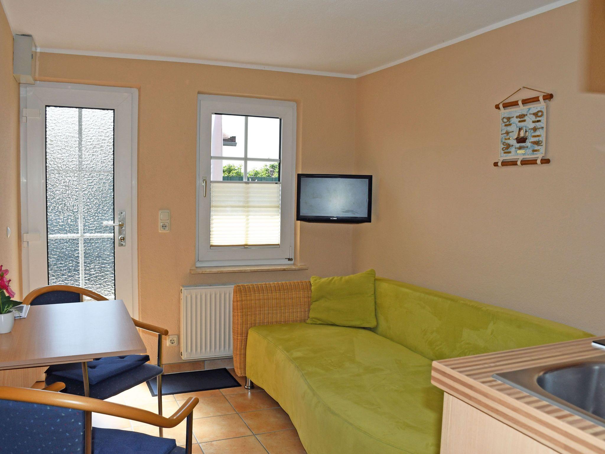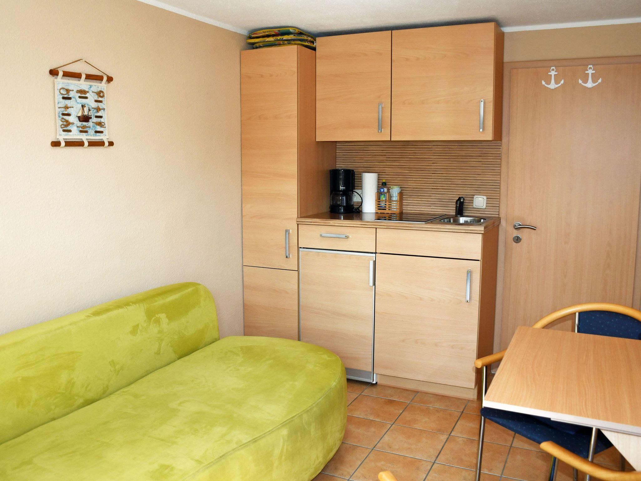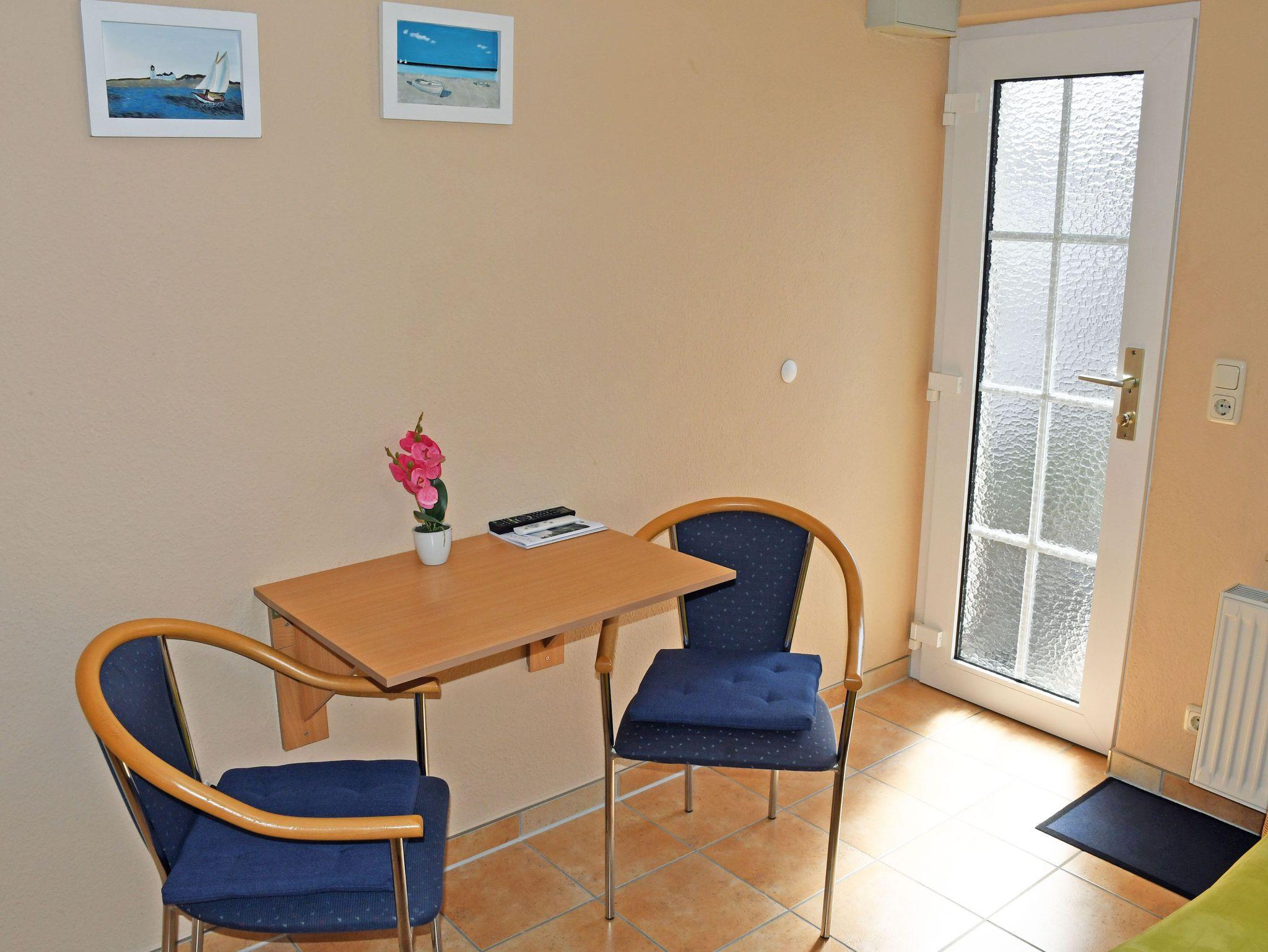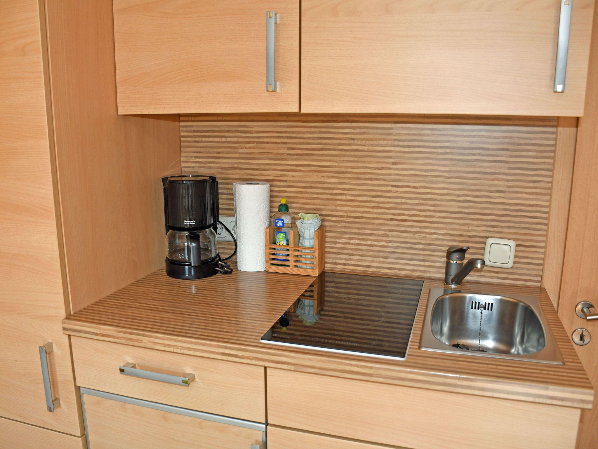 Die Ferienwohnung petit ist mit nur 11 qm zwar sehr klein aber dennoch gut ausgestattet. Sie verfügt über einen Wohn- und Schlafraum und ein Bad. Im Wohnraum befindet sich eine Couch die maximal für 1 Gast aufgebettet werden kann (1,40 m breit). Dazu stehen ein kleiner Tisch mit Stühlen, ein TV-Gerät, eine kleine Küchenzeile mit Kühlschrank, Cerankochfeld, Toaster, Wasserkocher und Kaffeemaschine zur Verfügung. Im neu gefliesten kleinen Bad gibt es eine Dusche, WC und Waschbecken. Bettwäsche werden selbtsverständlich von uns bei Anreise bereitgestellt. Handtücher bitten wir selbst mitzubringen.
