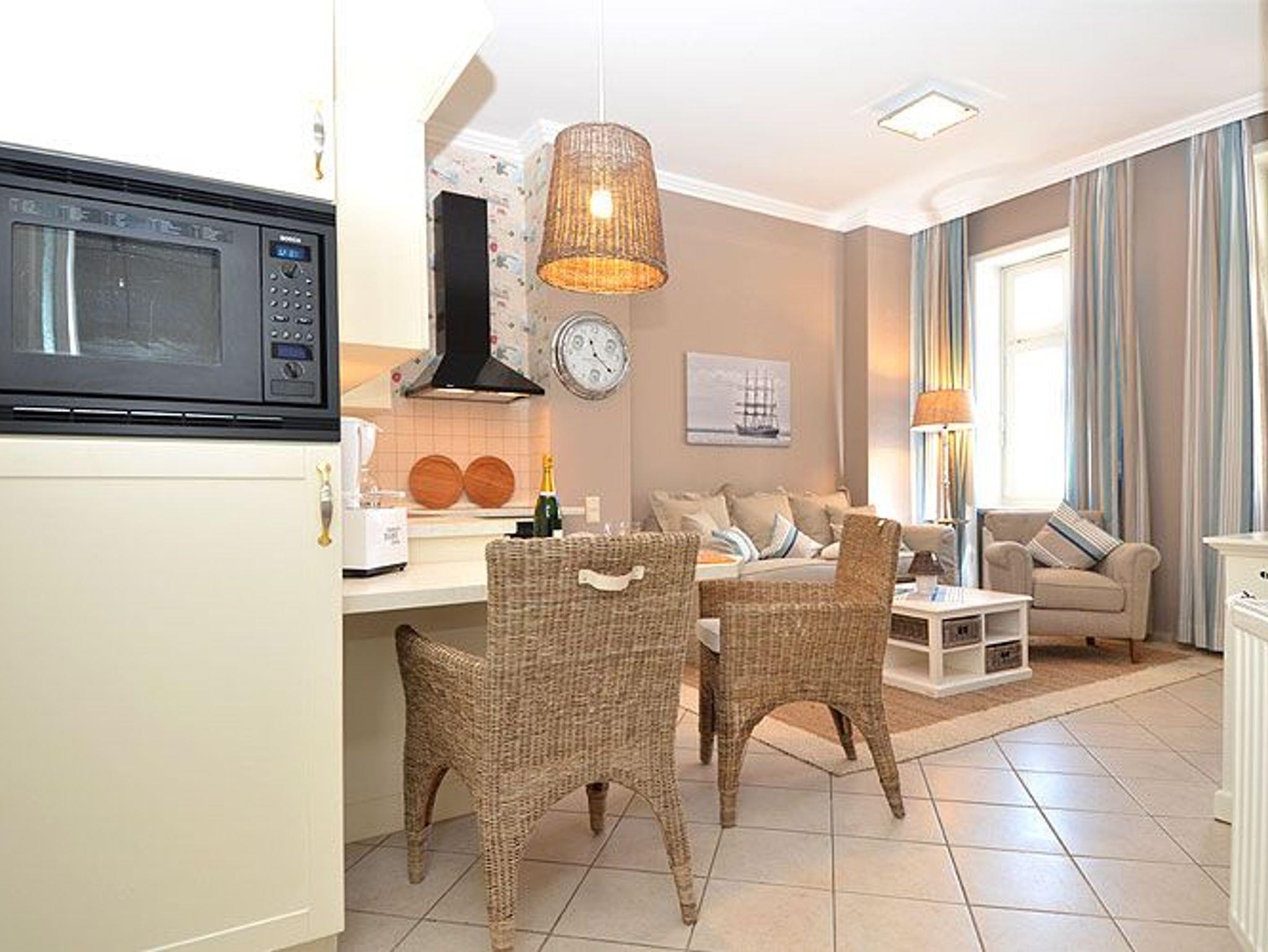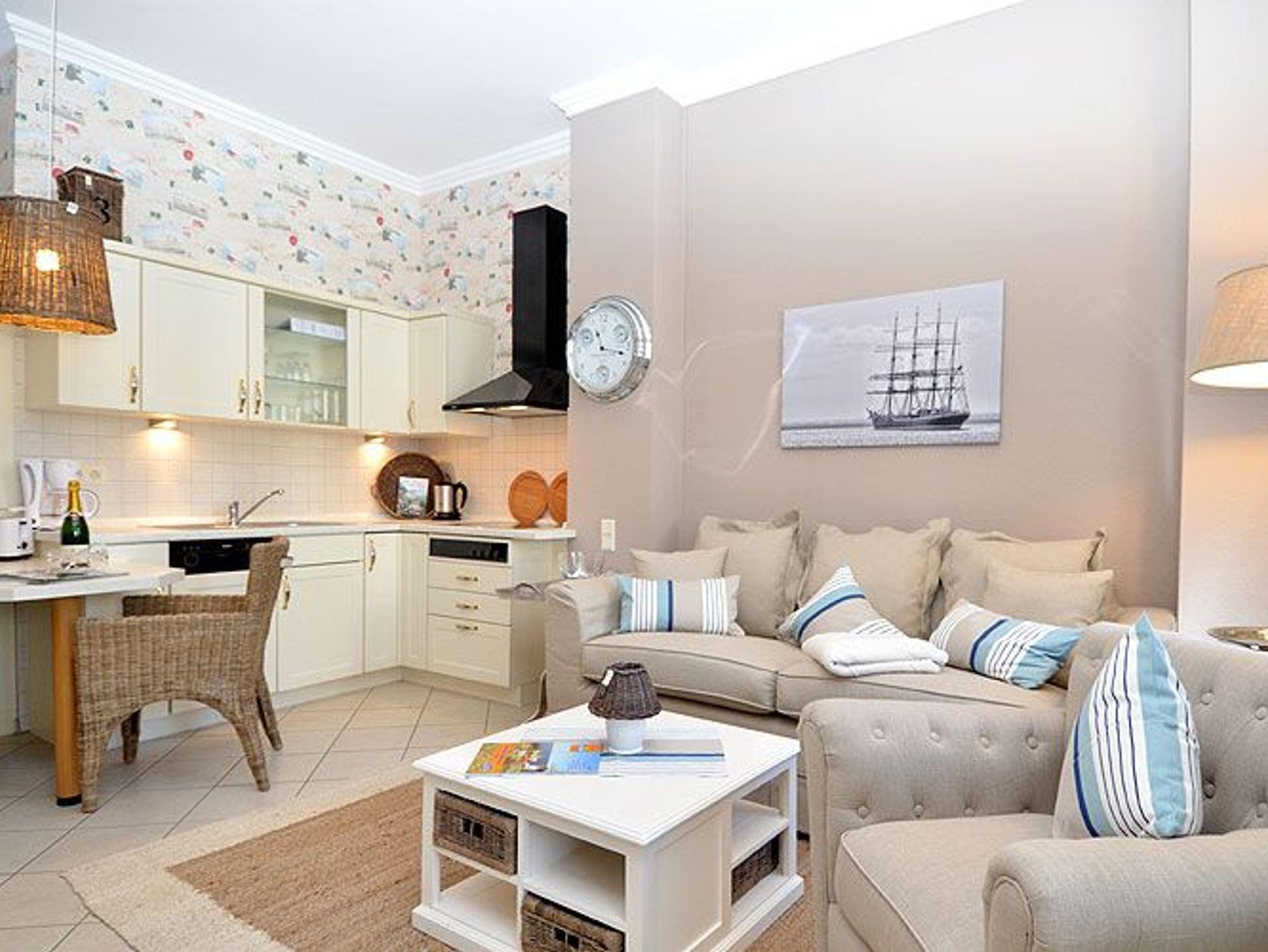 Dieses ca. 40 m² große, stilvoll eingerichtete 2-Raum-Appartement begrüßt Sie im 1. Obergeschoss und hat einen 12 m² möblierten Balkon nach Norden. Wunderschöne Landhausmöbel, ausgesuchte Stoffe und warme Erdtöne schaffen zusammen mit leicht maritimen Akzenten ein ganz einzigartiges Wohlfühlambiente. Die gesamte Nichtraucherwohnung ist gefliest bzw. mit Designerboden in Vintage-Oak-Optik versehen.