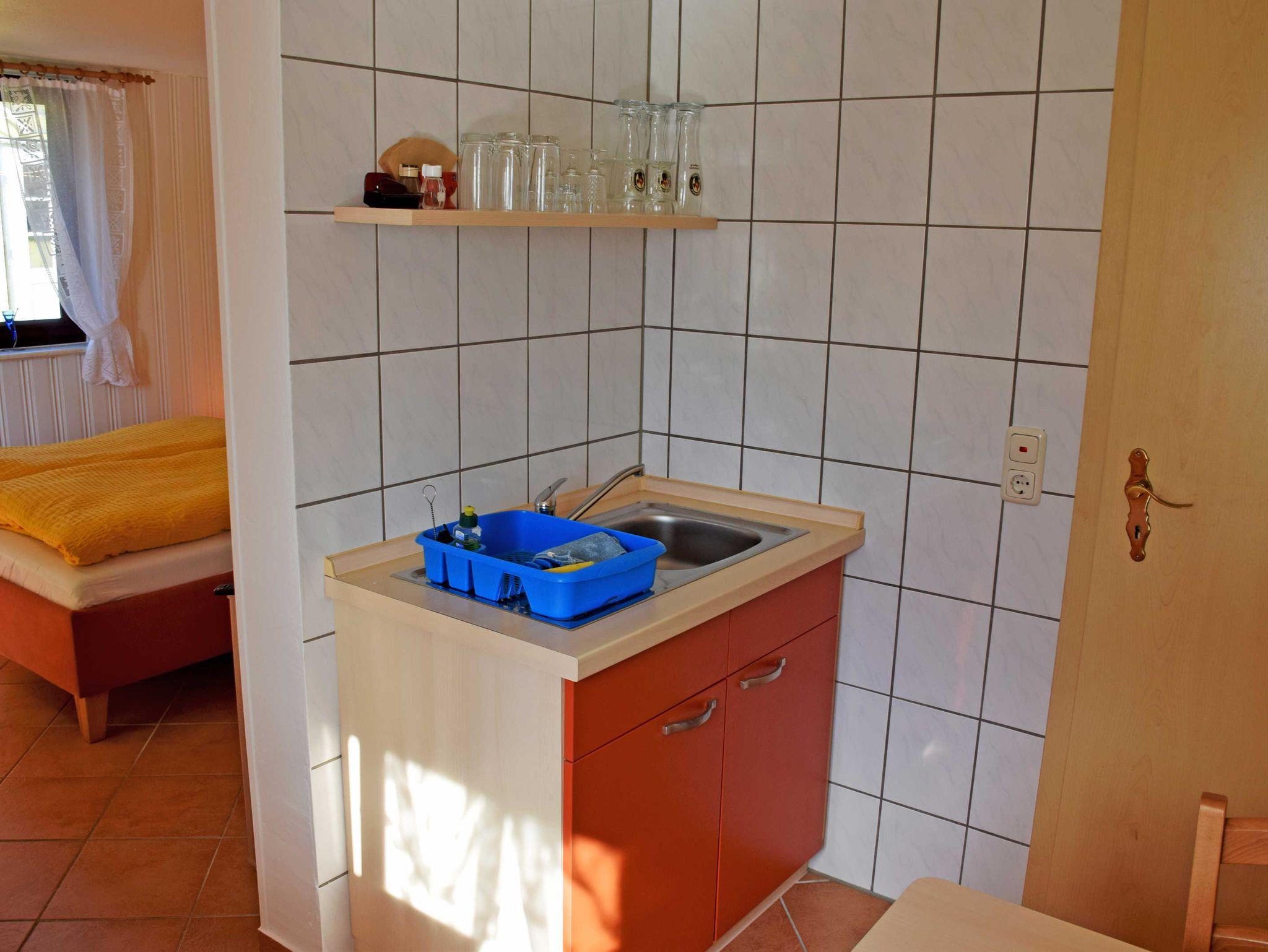 Diese kleine Ferienwohnung (23 qm) ist modern und freundlich eingerichtet und verfügt über einen separaten Wohnungseingang. Der kombinierte Wohn- und Schlafraum bietet Platz für zwei Gäste. Hier stehen ein bequemes Doppelbett mit Nachttischen und Leselampen, eine Sitzecke mit Tisch und Stühlen sowie TV und Radio. Durch die Verwendung von Holz und warmen Farben ist es uns gelungen, hier ein angenehmes Ambiente zu schaffen in dem auch Sie sich wohlfühlen werden. Selbstverständlich hat diese Ferienwohnung ein Bad mit Dusche und WC und eine kleine neu eingerichtete Küche mit Sitzecke. Zur Küchenausstattung gehören Herd, Spüle, Kühlschrank, Kaffeemaschine, Wasserkocher und Toaster.