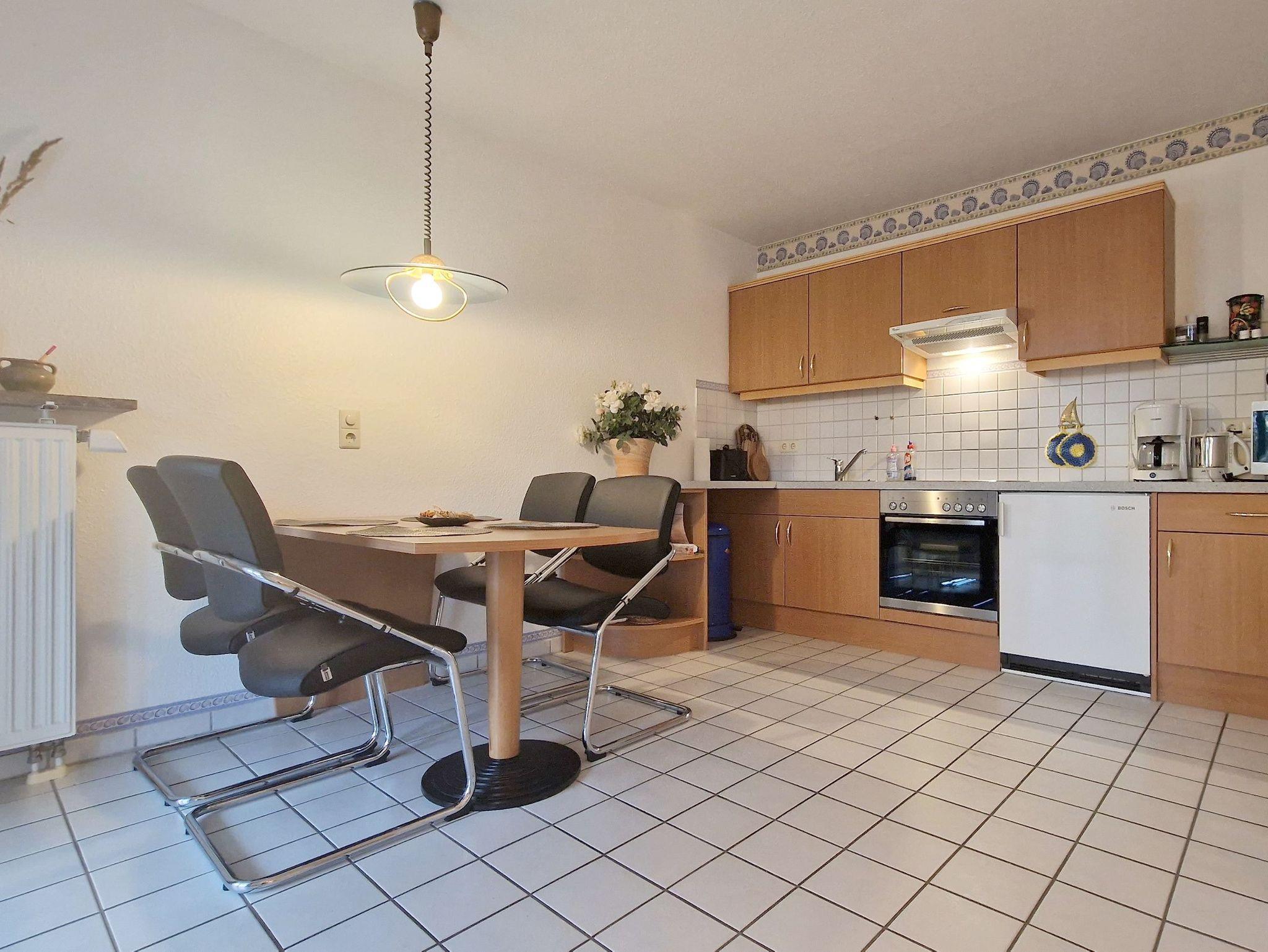 Die offene aber etwas abgentrennte Küche mit Essbereich ist mit einem 4-Felder Ceranherd, Backofen, Kühlschrank, Mikrowelle, Toaster, Kaffeemaschine und reichlich Küchenutensilien bestens ausgestattet.