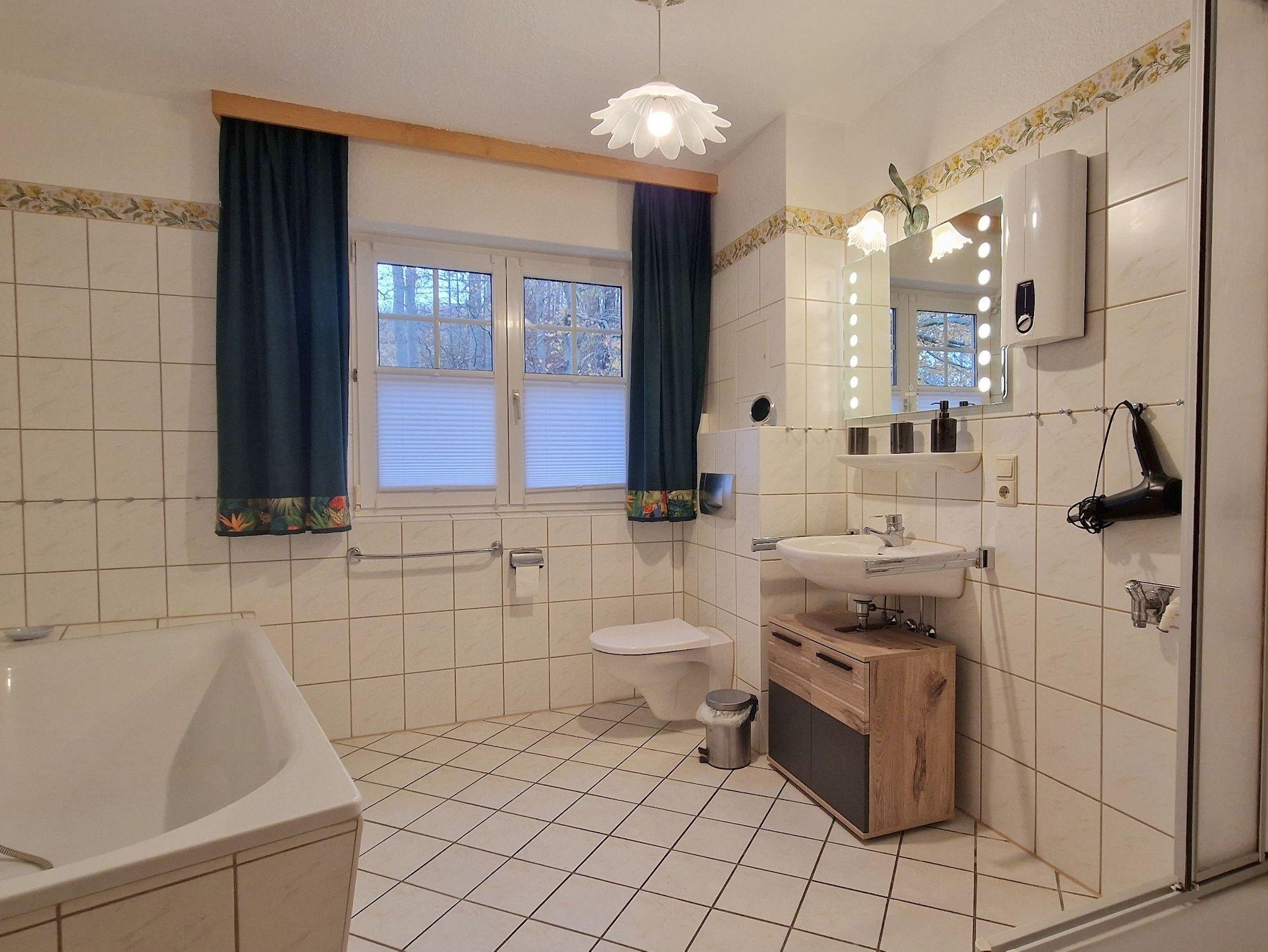 Das Tageslichtbad ist mit einer Badewanne, Dusche, WC und Haartrockner ausgerichtet.